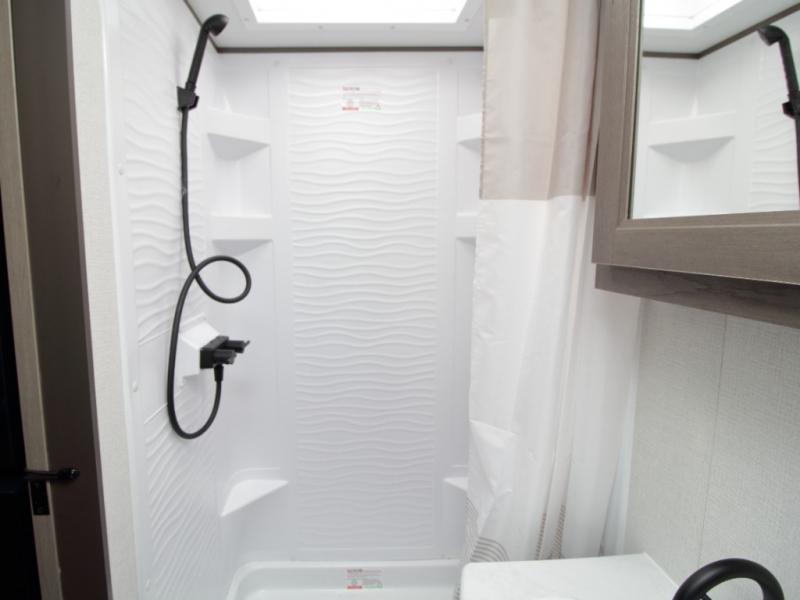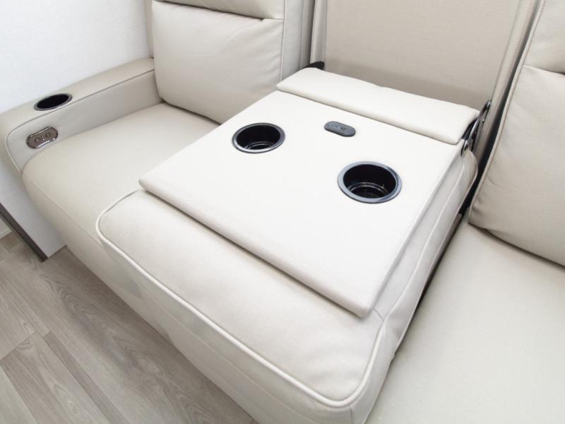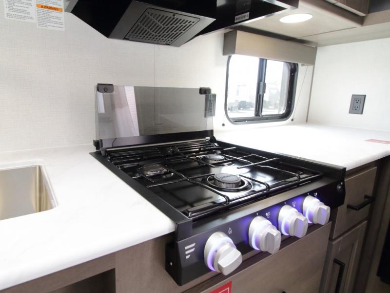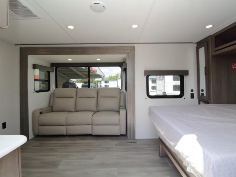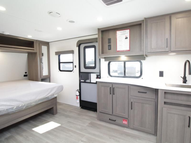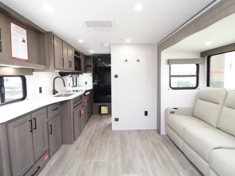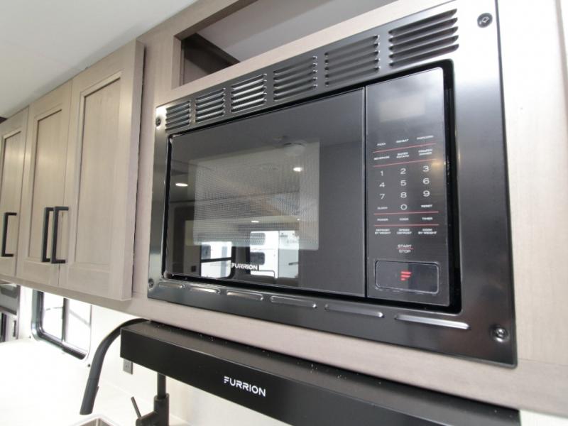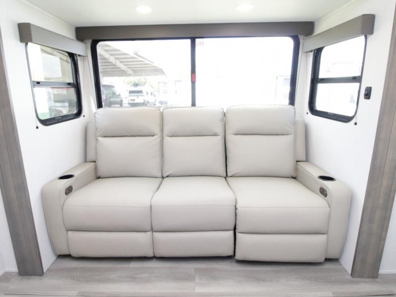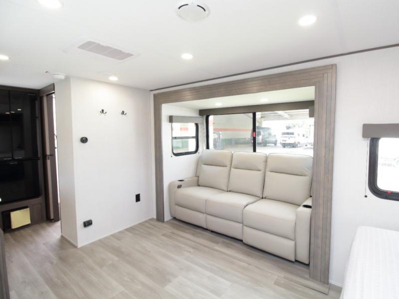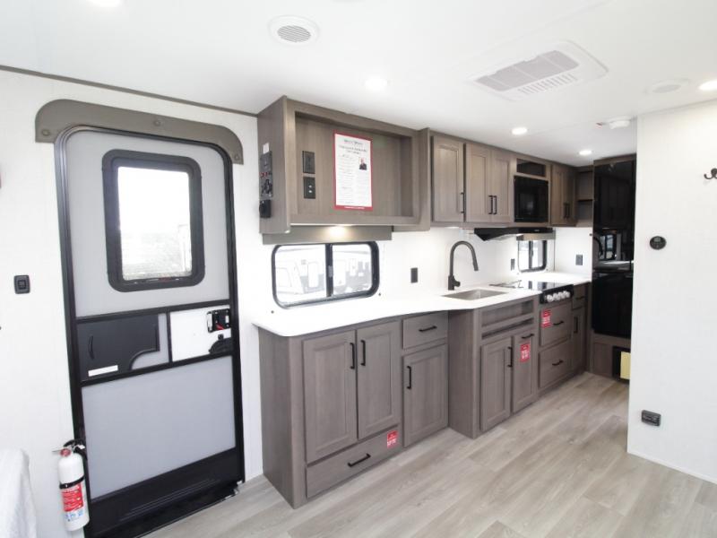 Inside, you’ll find a fully equipped kitchen with a three-burner cooktop, microwave oven, and plenty of counter space for meal prep. The living area offers theater seating or a booth dinette option, plus a cozy layout that feels just like home.