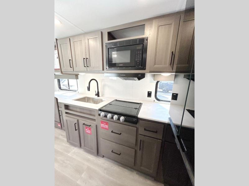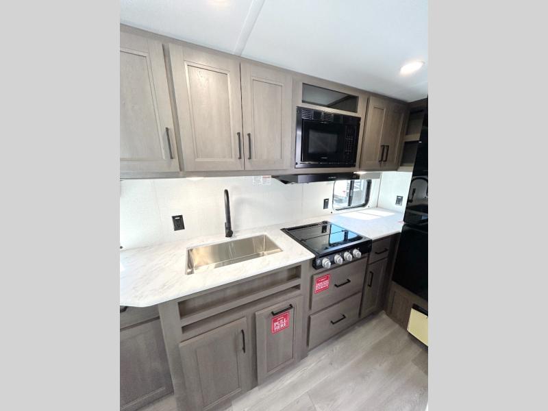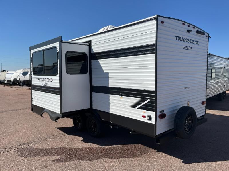 The only thing you need to worry about when you go camping is where to park this Transcend Xplor travel trailer! You'll have everything you need each day to prepare meals, including a three-burner cooktop, a microwave oven, and plenty of counter space. The front queen bed includes overhead cabinets for your books, plus underbed storage for shoes! Choose the optional theater seats in place of the dinette, and you won't even know you're away from home!