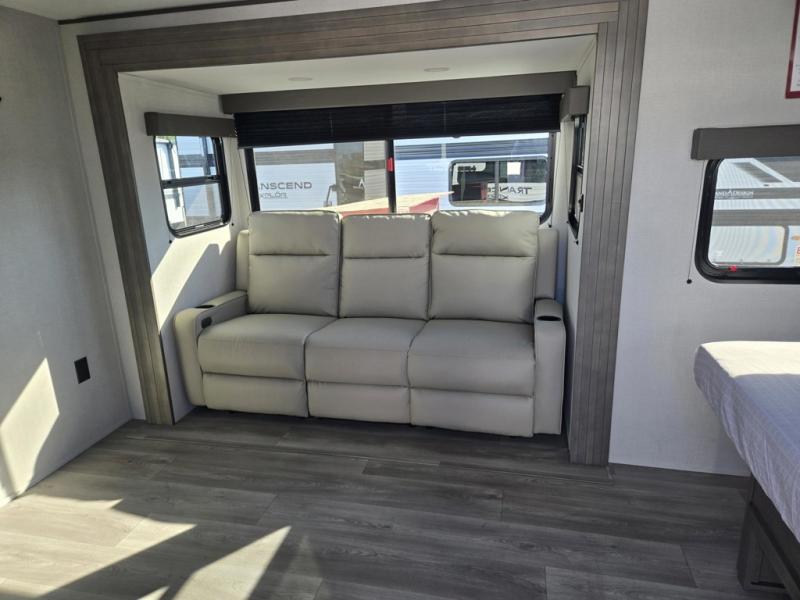 The only thing you need to worry about when you go camping is where to park this Transcend Xplor travel trailer! You'll have everything you need each day to prepare meals, including a three-burner cooktop, a microwave oven, and plenty of counter space. The front queen bed includes overhead cabinets for your books, plus underbed storage for shoes! Choose the optional theater seats in place of the dinette, and you won't even know you're away from home!