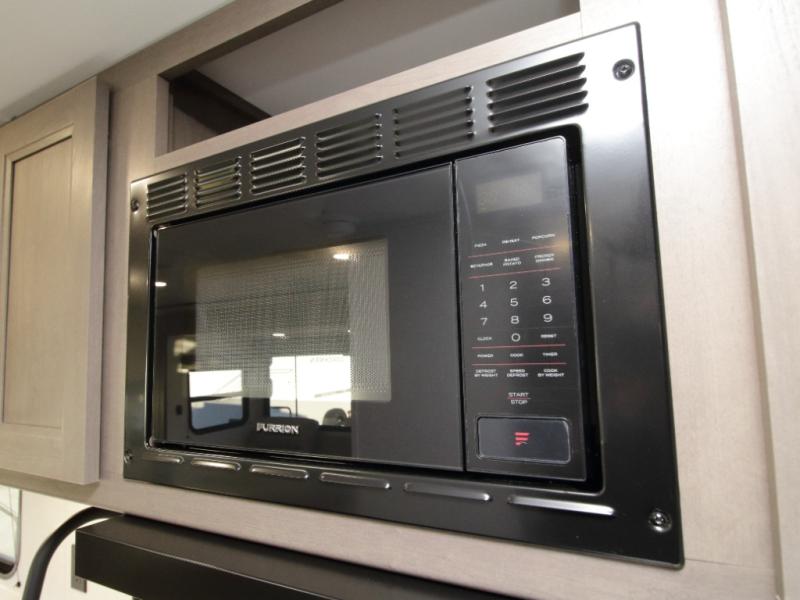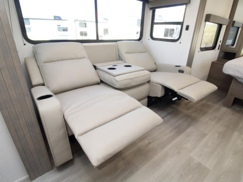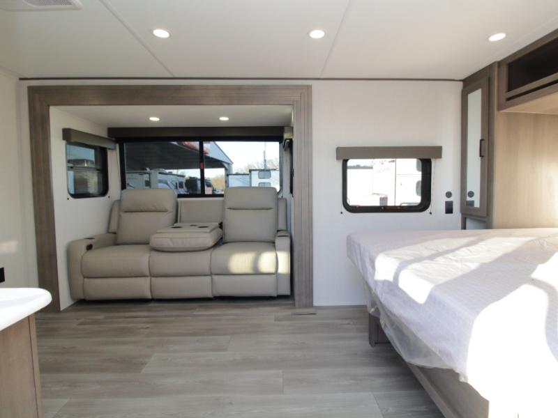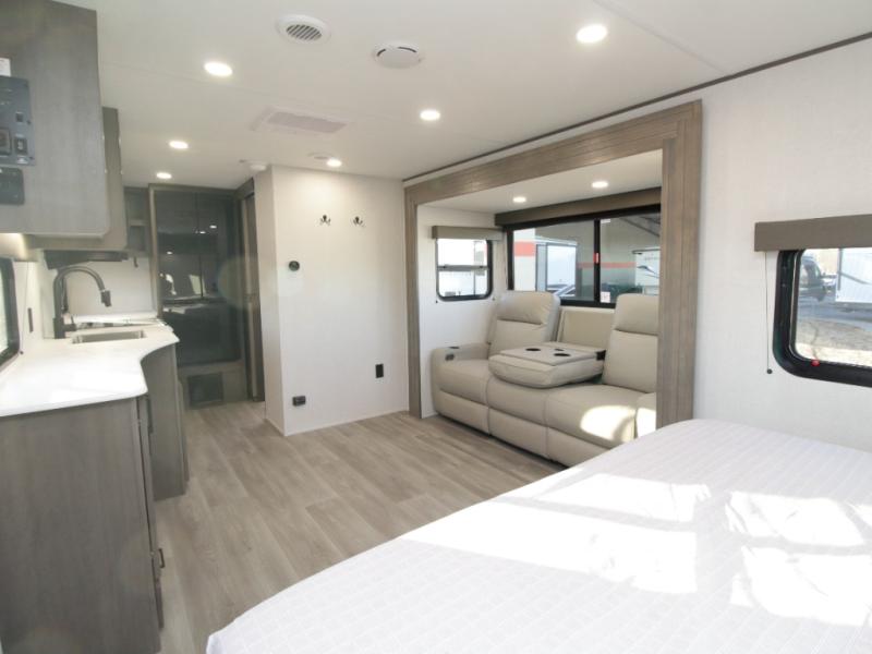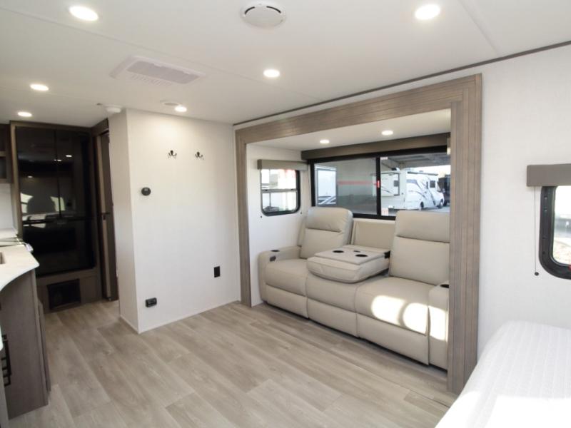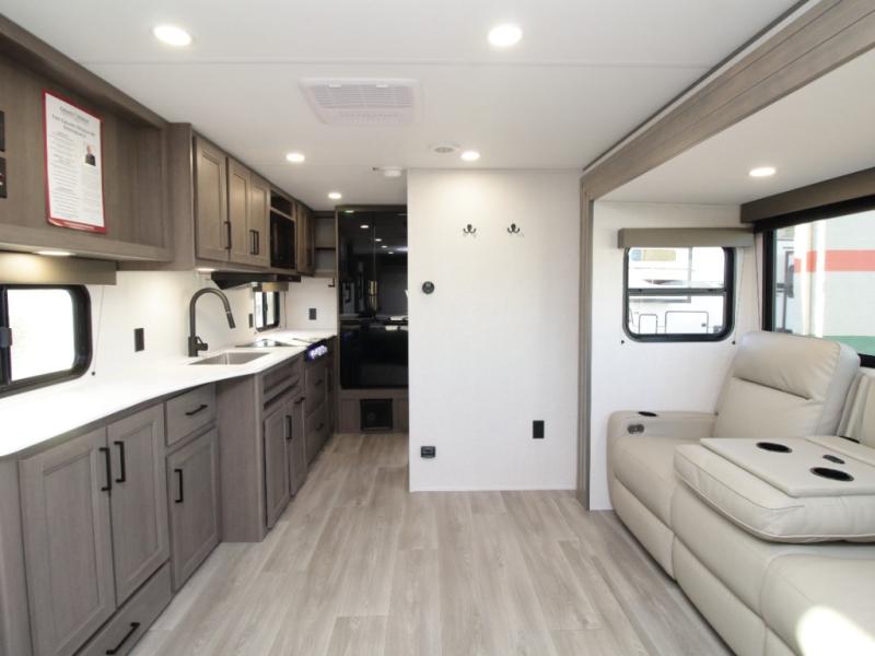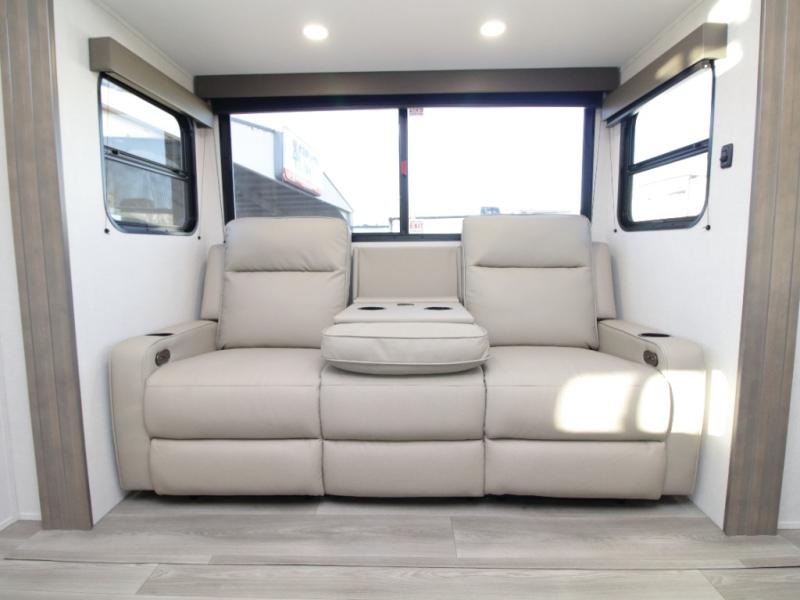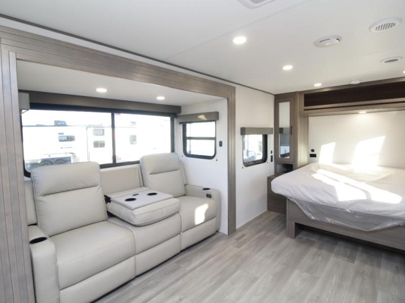 Inside, the fully equipped kitchen makes meal prep effortless with a three-burner cooktop, microwave oven, and ample counter space for cooking and serving. The front queen bed provides a comfortable retreat with overhead cabinets for personal items and generous under-bed storage to keep shoes and gear neatly tucked away. For added comfort, optional theater seating can replace the dinette, creating a cozy space to relax after a full day of exploring.