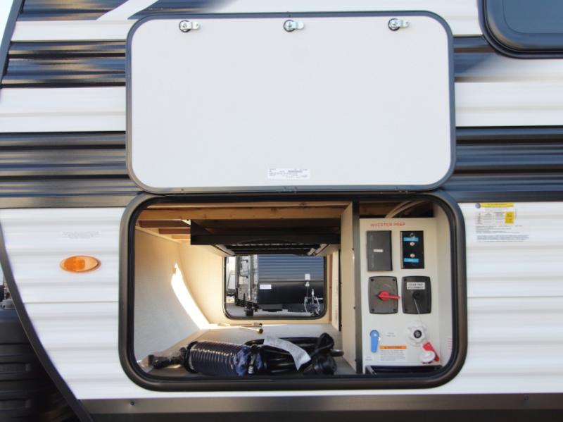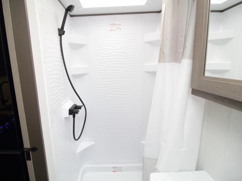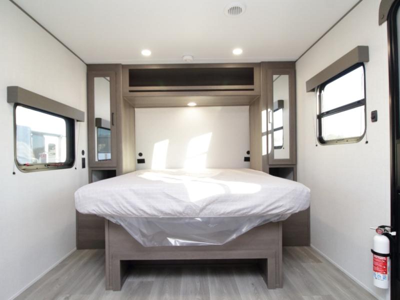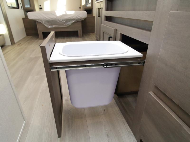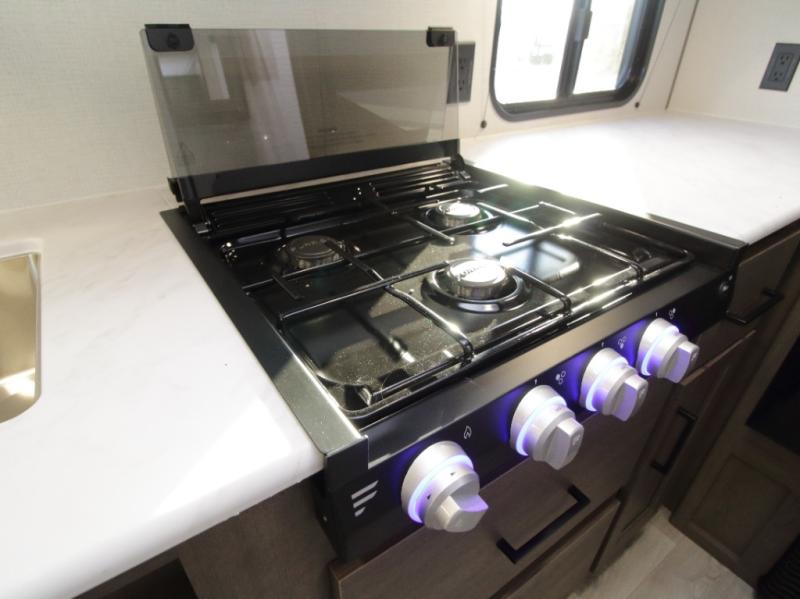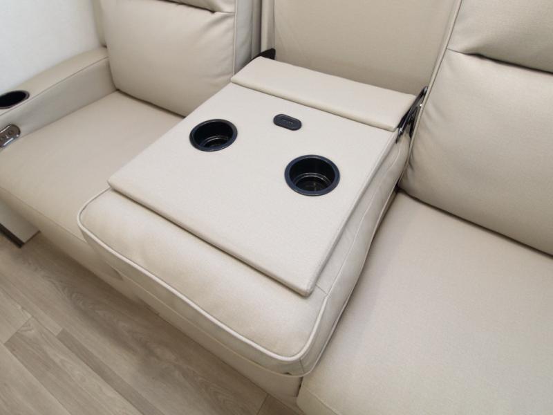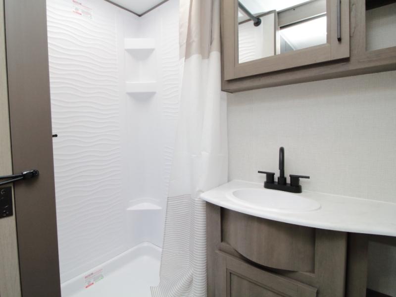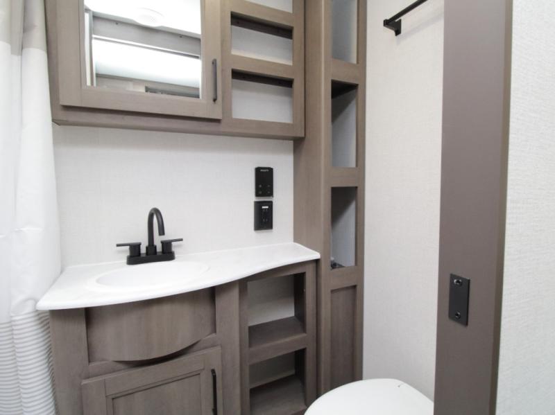 Inside, the fully equipped kitchen makes meal prep effortless with a three-burner cooktop, microwave oven, and ample counter space for cooking and serving. The front queen bed provides a comfortable retreat with overhead cabinets for personal items and generous under-bed storage to keep shoes and gear neatly tucked away. For added comfort, optional theater seating can replace the dinette, creating a cozy space to relax after a full day of exploring.