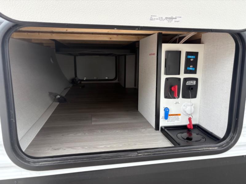Outside, the 17' power awning with LED lighting extends your living space and sets the mood for evenings around the campsite. An exterior spray port makes cleanup quick after muddy hikes or sandy adventures, and the built-in pet dish ensures your four-legged camping companions feel just as welcome.
