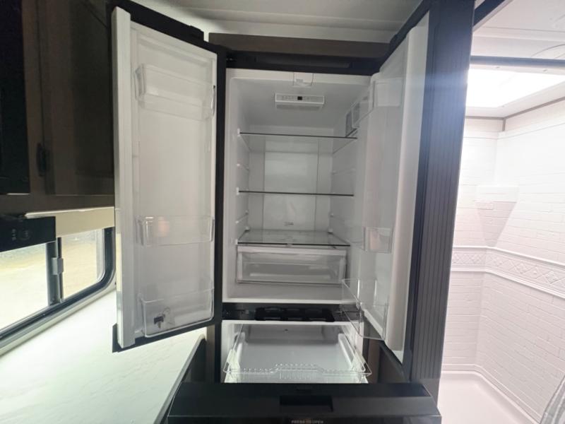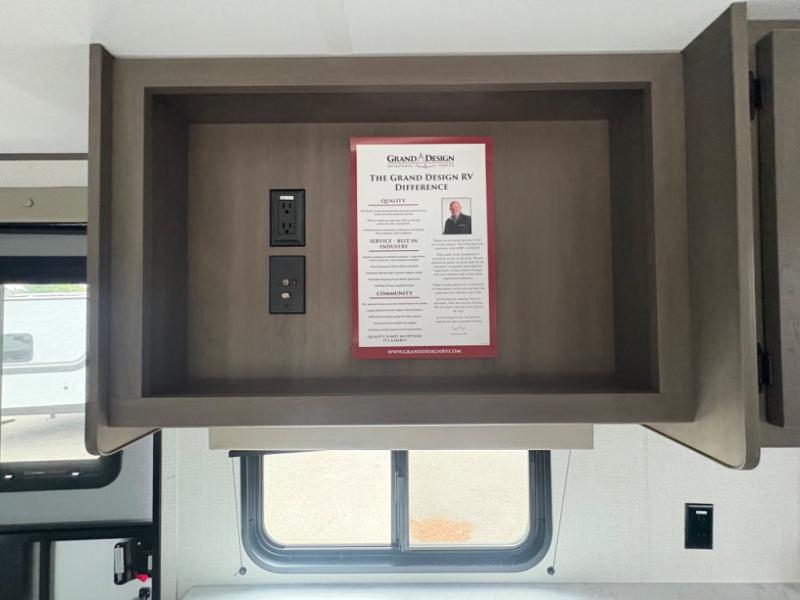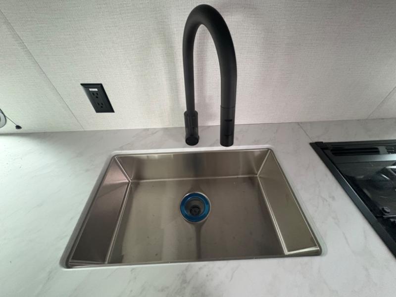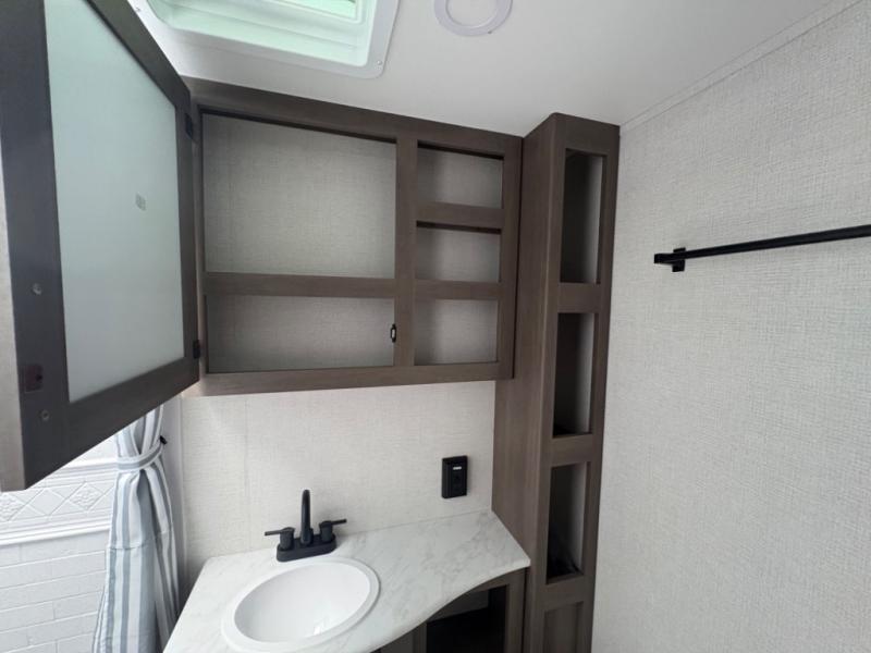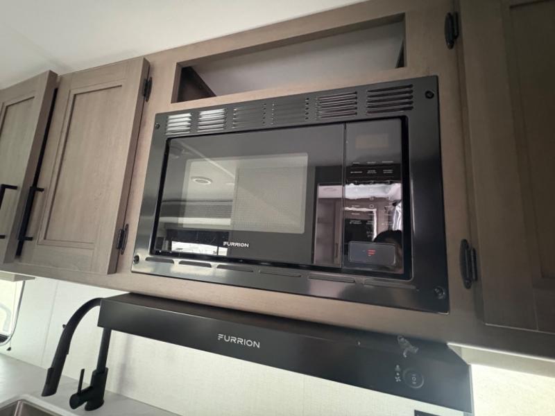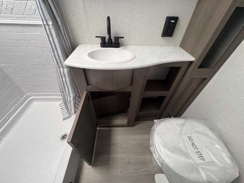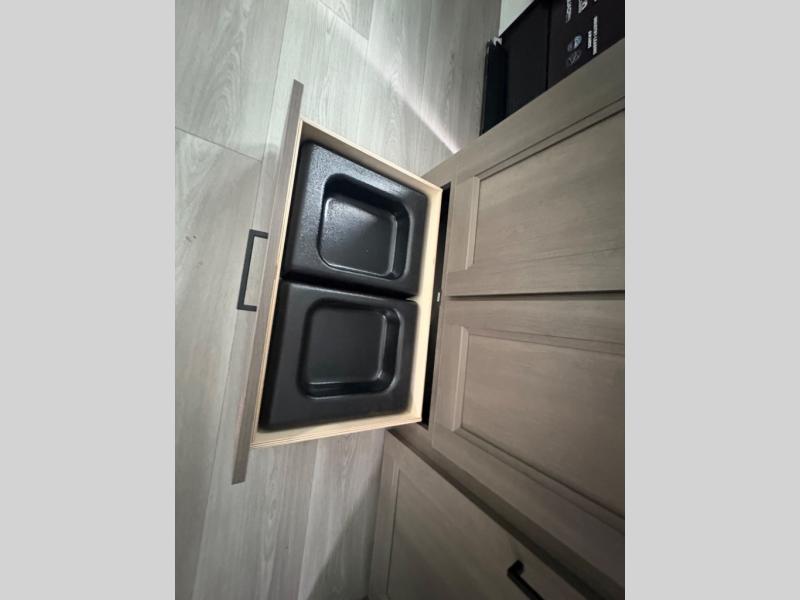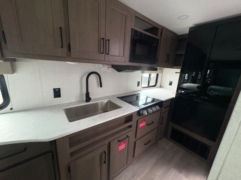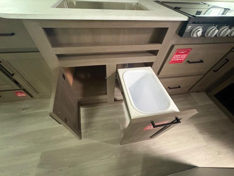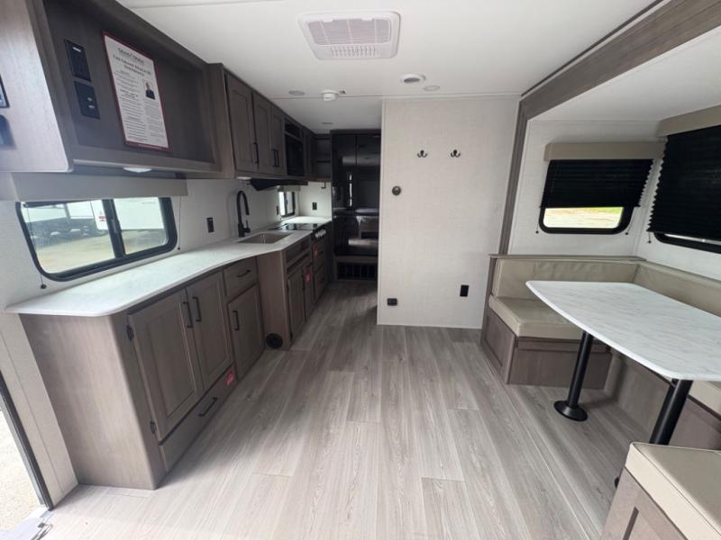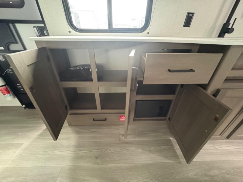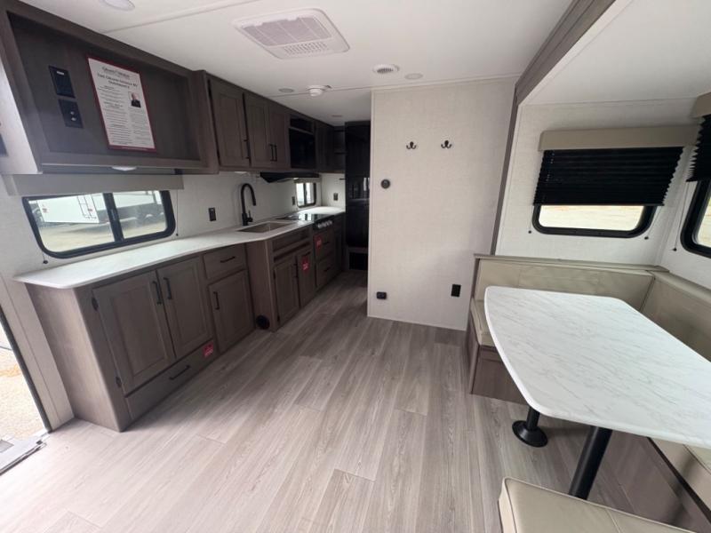 Inside, the open layout feels bright and welcoming. The U-shaped dinette slide-out creates extra floor space and serves as the perfect spot for meals, game nights, or planning the next day’s hike. Prefer a more residential feel? You can opt for theater seating in place of the dinette to create a cozy lounge that feels right at home wherever you park.