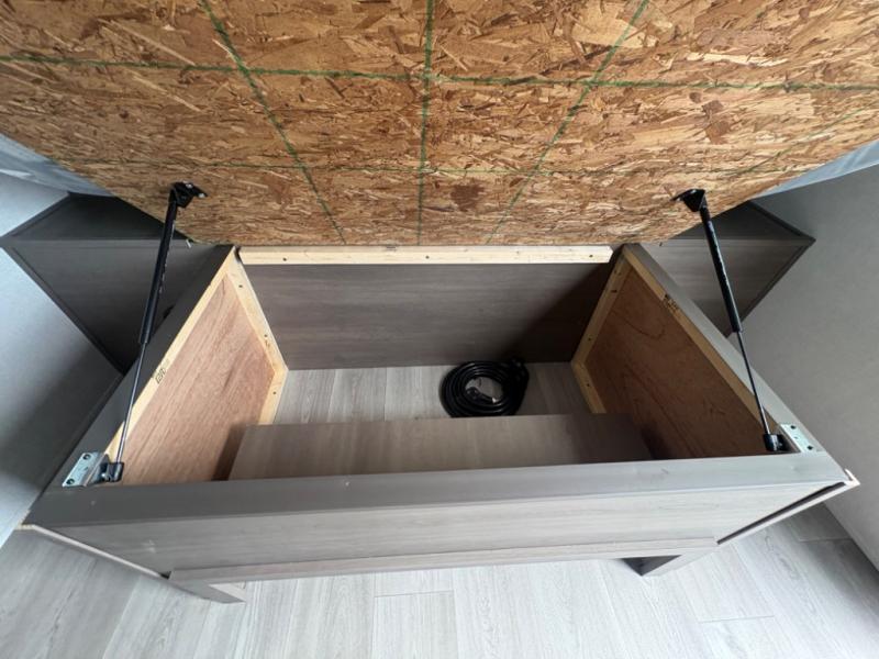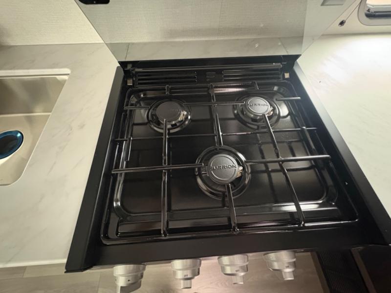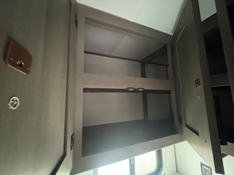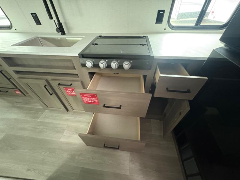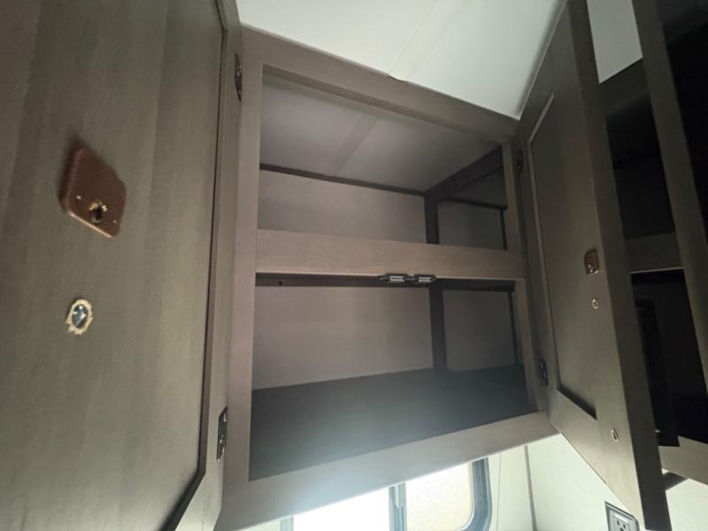The kitchen is thoughtfully designed for real camping life, with a three-burner cooktop, microwave, and generous counter space for prepping everything from quick breakfasts to full campsite dinners. Up front, the queen bed offers a comfortable place to recharge, complete with overhead cabinets for essentials and underbed storage for shoes, gear, or extra supplies.