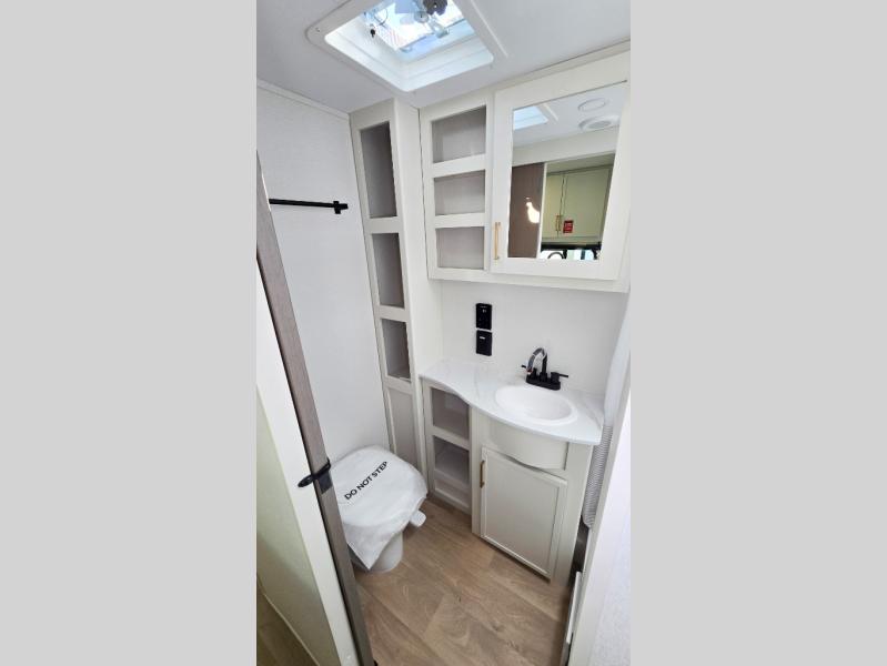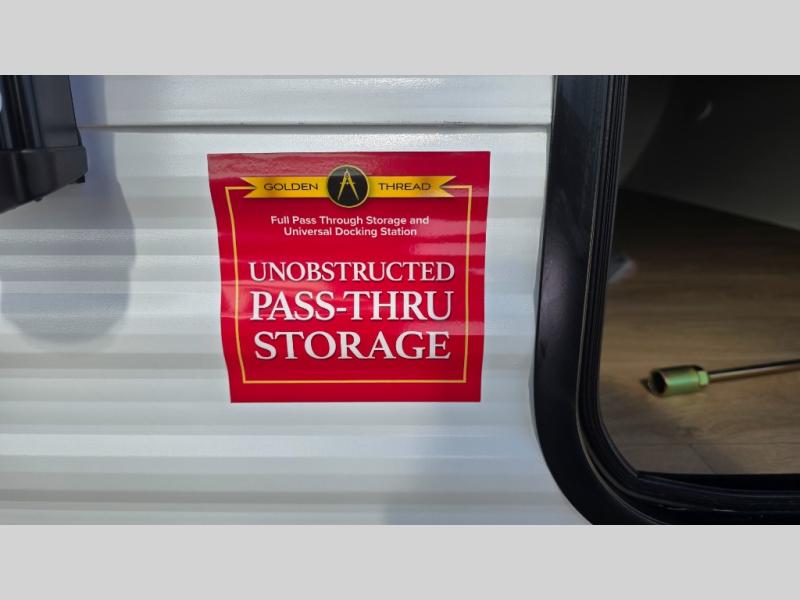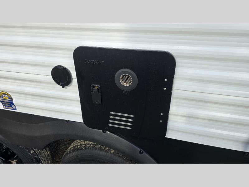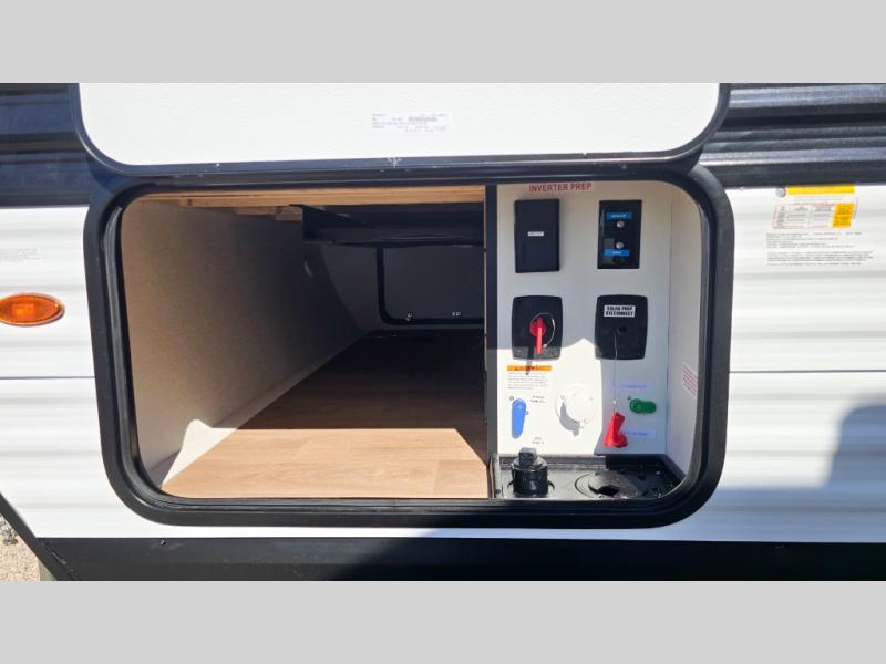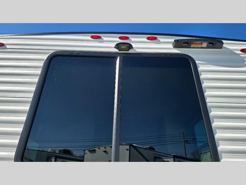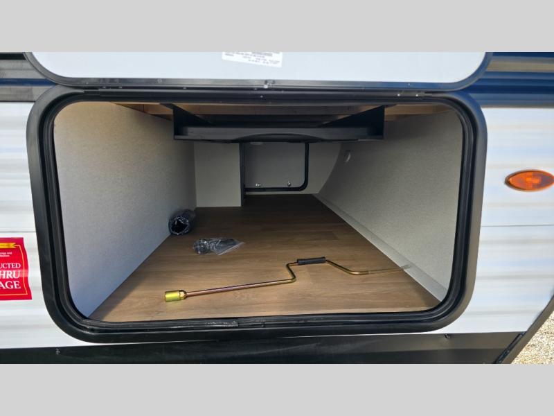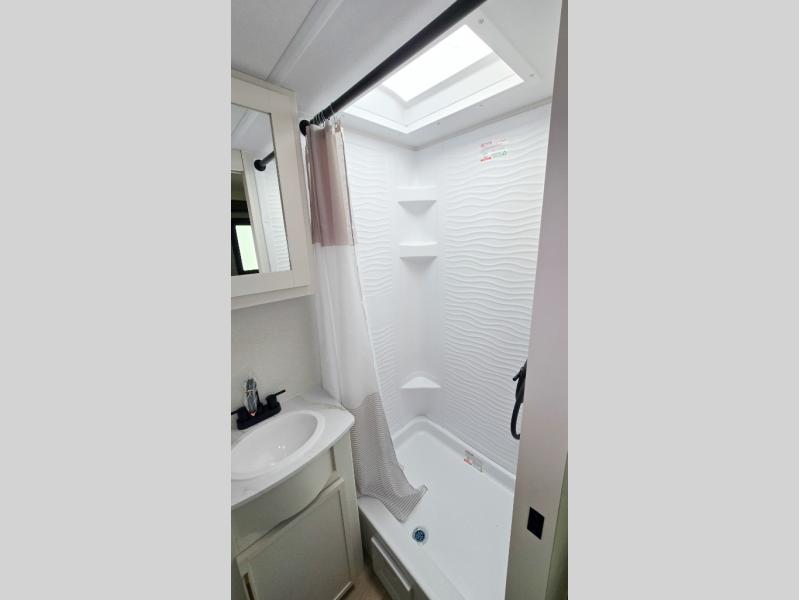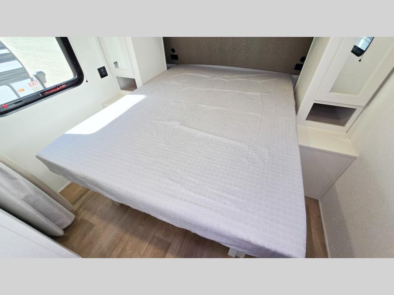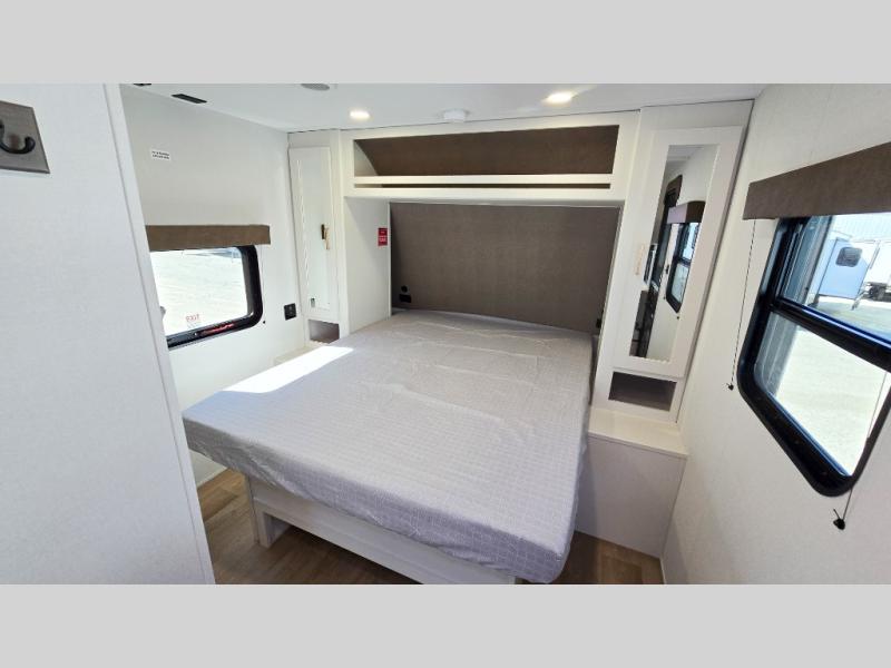 It will be so easy to enjoy camping trips in this travel trailer. The rear living area includes a 70" bi-fold sofa where your guests can sleep, plus a countertop with two chairs for dining space. You'll find your own bedroom up front with a walk-around queen bed, dual beside wardrobes, a privacy curtain and TV prep if you choose to add entertainment. The kitchen includes a three-burner cooktop, a microwave oven, and a 10-cu. ft. refrigerator to cook and store food, and you'll appreciate the middle bath that is easily accessible for all.