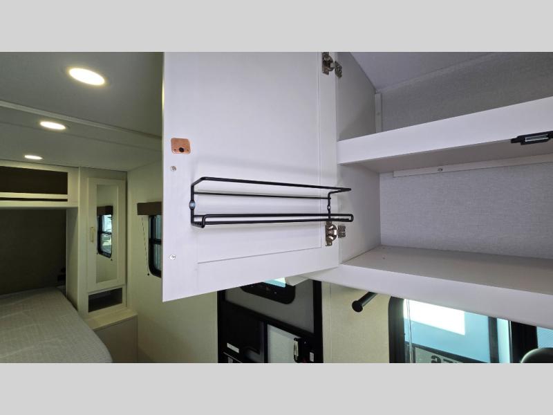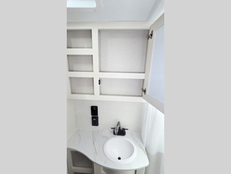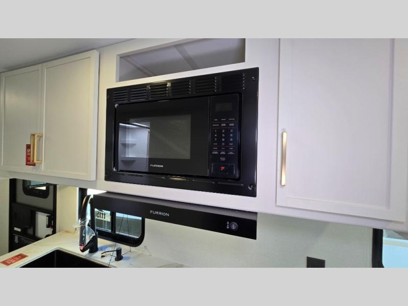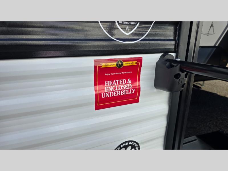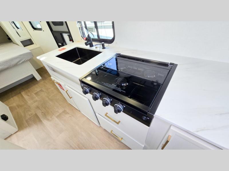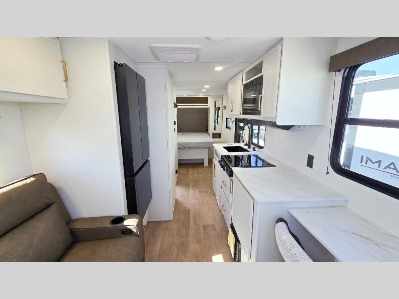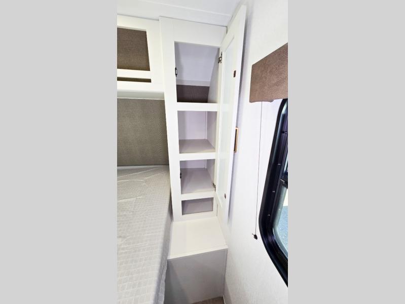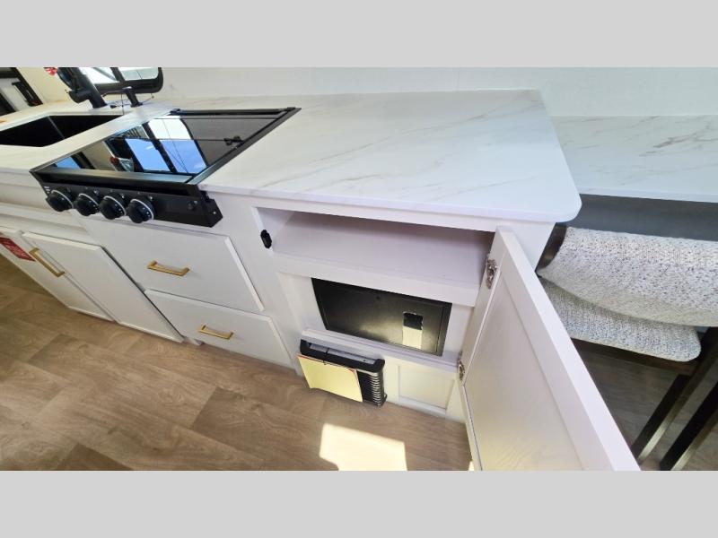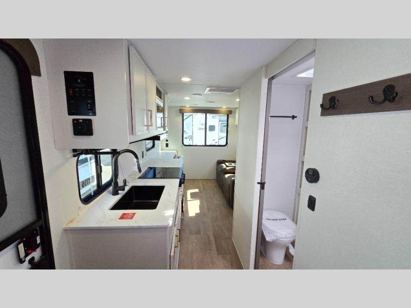 It will be so easy to enjoy camping trips in this travel trailer. The rear living area includes a 70" bi-fold sofa where your guests can sleep, plus a countertop with two chairs for dining space. You'll find your own bedroom up front with a walk-around queen bed, dual beside wardrobes, a privacy curtain and TV prep if you choose to add entertainment. The kitchen includes a three-burner cooktop, a microwave oven, and a 10-cu. ft. refrigerator to cook and store food, and you'll appreciate the middle bath that is easily accessible for all.