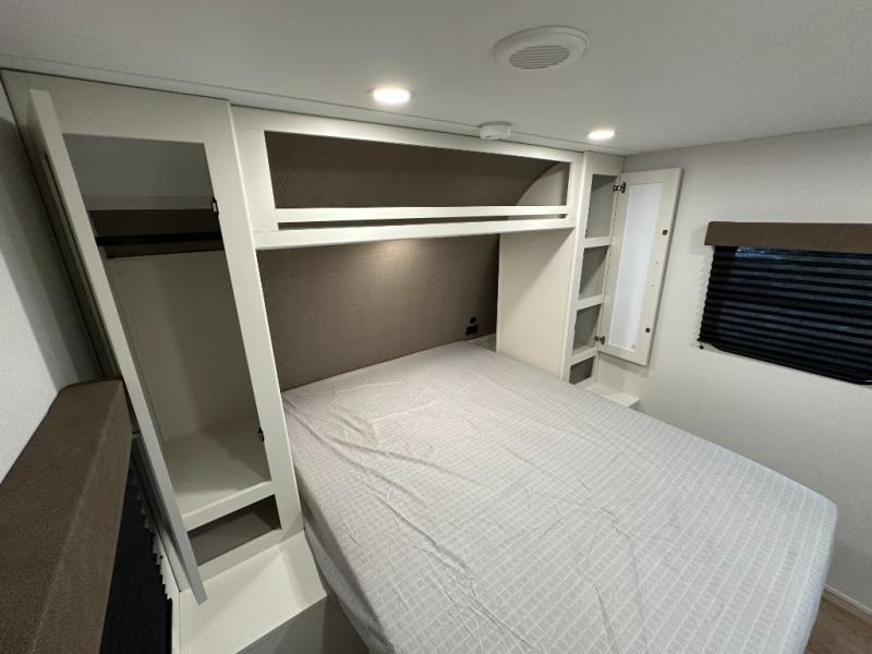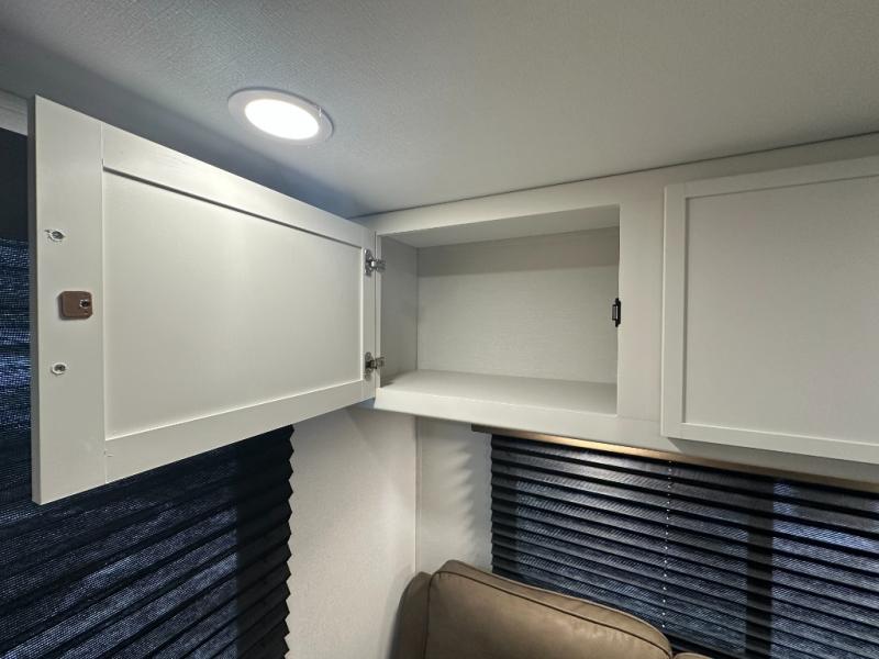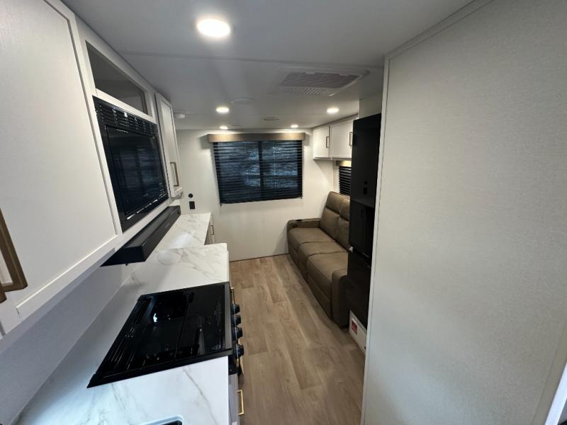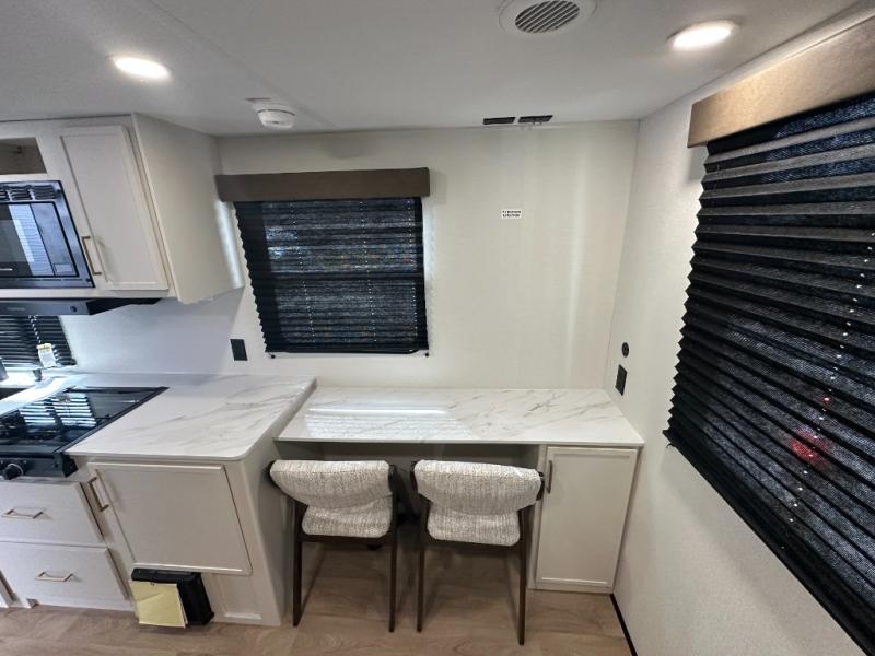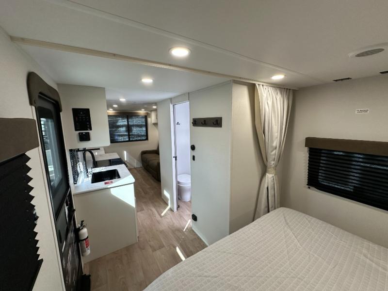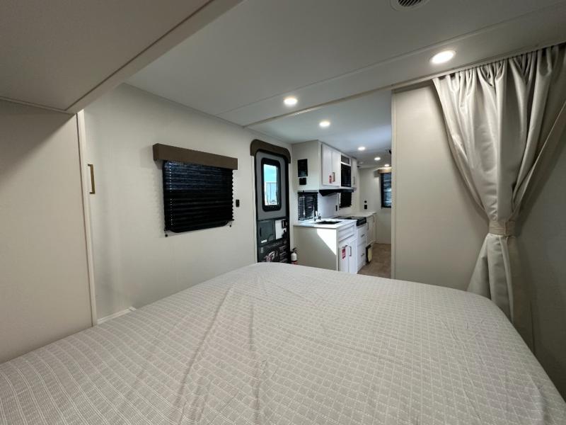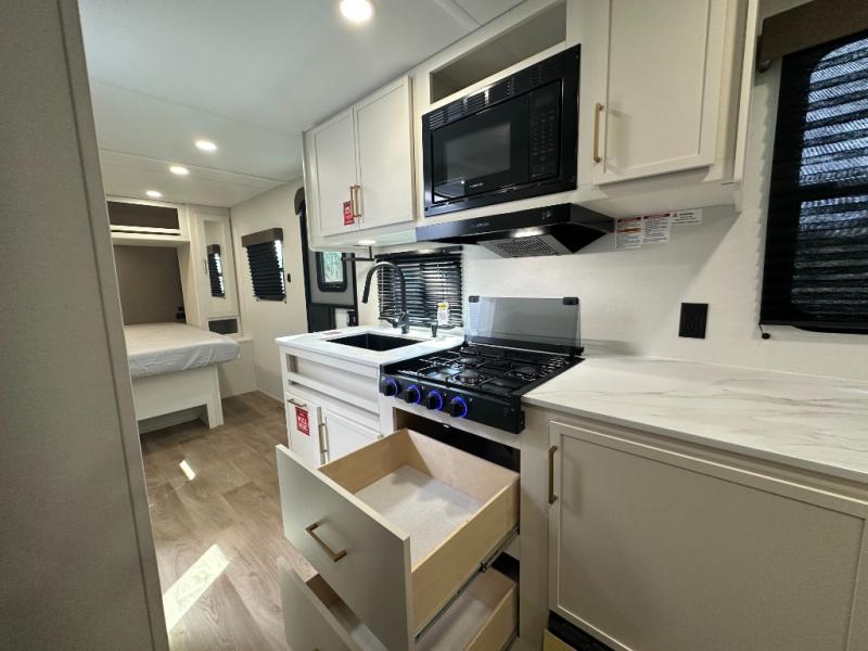 It will be so easy to enjoy camping trips in this travel trailer. The rear living area includes a 70" bi-fold sofa where your guests can sleep, plus a countertop with two chairs for dining space. You'll find your own bedroom up front with a walk-around queen bed, dual beside wardrobes, a privacy curtain and TV prep if you choose to add entertainment. The kitchen includes a three-burner cooktop, a microwave oven, and a 10-cu. ft. refrigerator to cook and store food, and you'll appreciate the middle bath that is easily accessible for all.