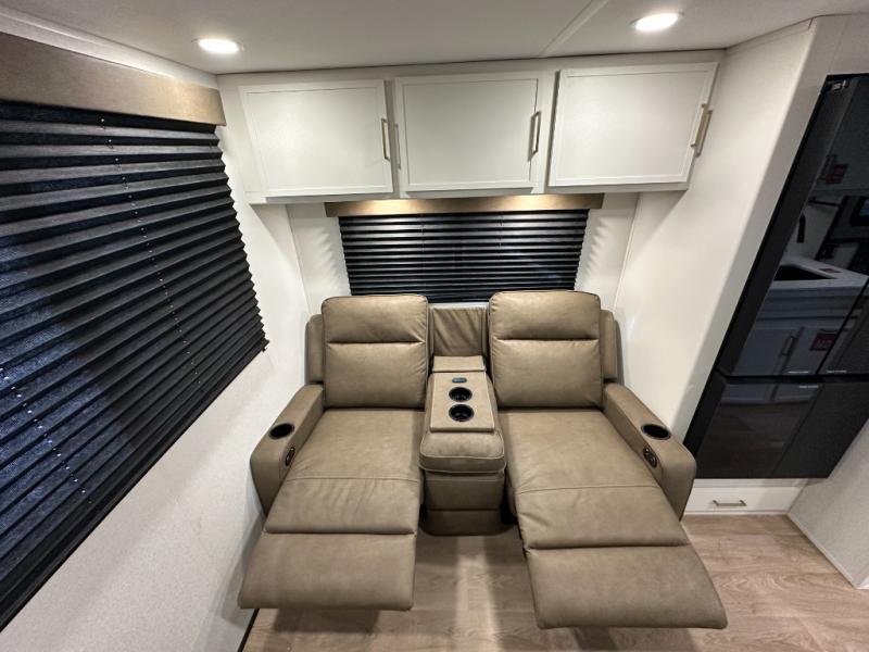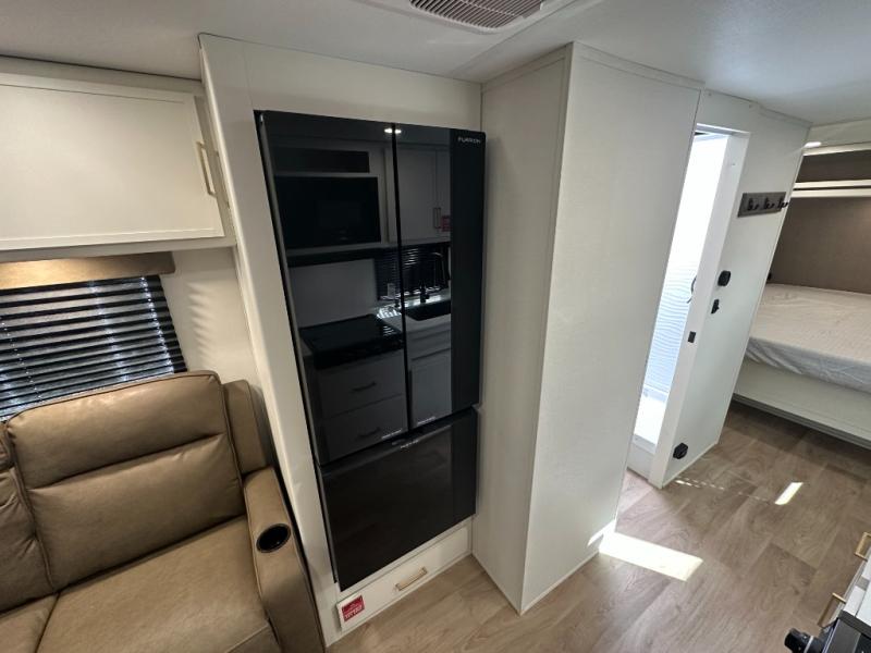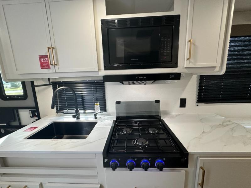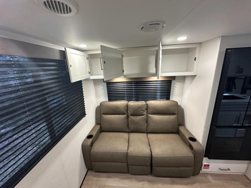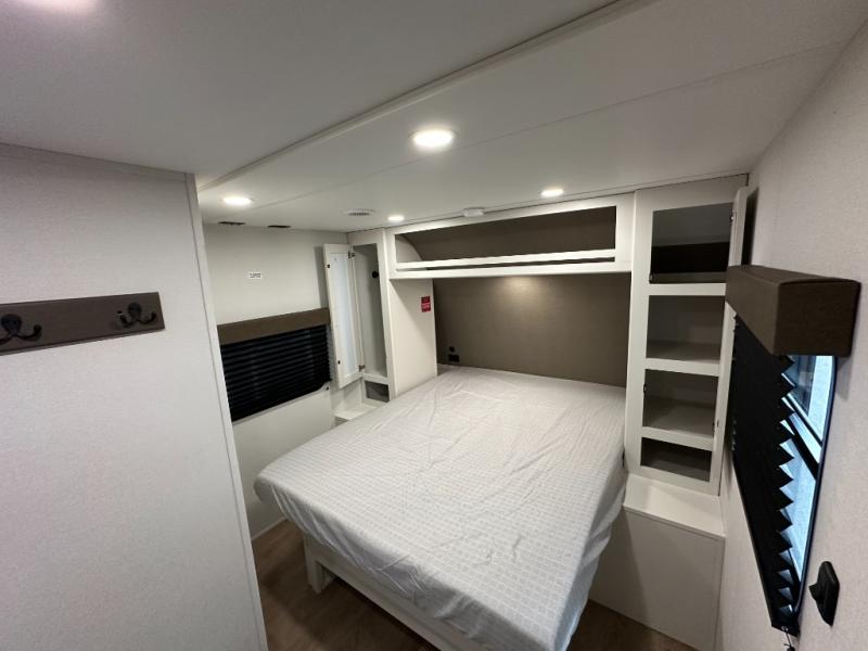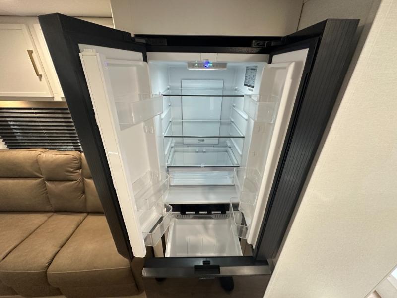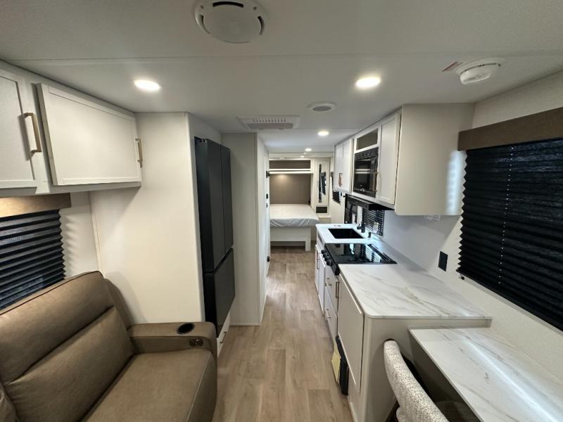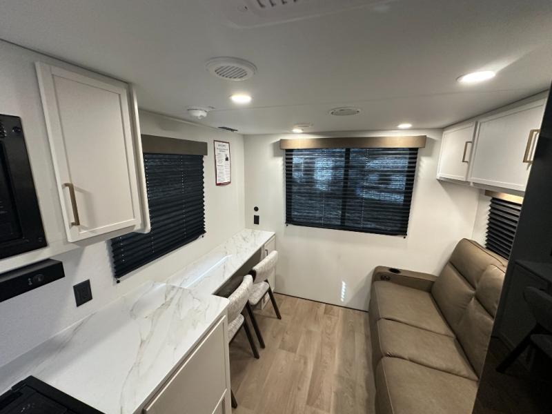 It will be so easy to enjoy camping trips in this travel trailer. The rear living area includes a 70" bi-fold sofa where your guests can sleep, plus a countertop with two chairs for dining space. You'll find your own bedroom up front with a walk-around queen bed, dual beside wardrobes, a privacy curtain and TV prep if you choose to add entertainment. The kitchen includes a three-burner cooktop, a microwave oven, and a 10-cu. ft. refrigerator to cook and store food, and you'll appreciate the middle bath that is easily accessible for all.