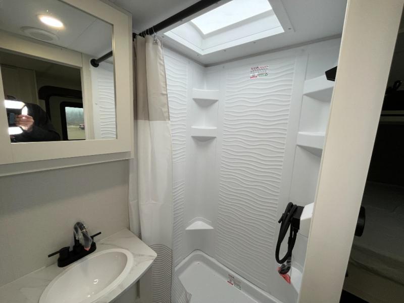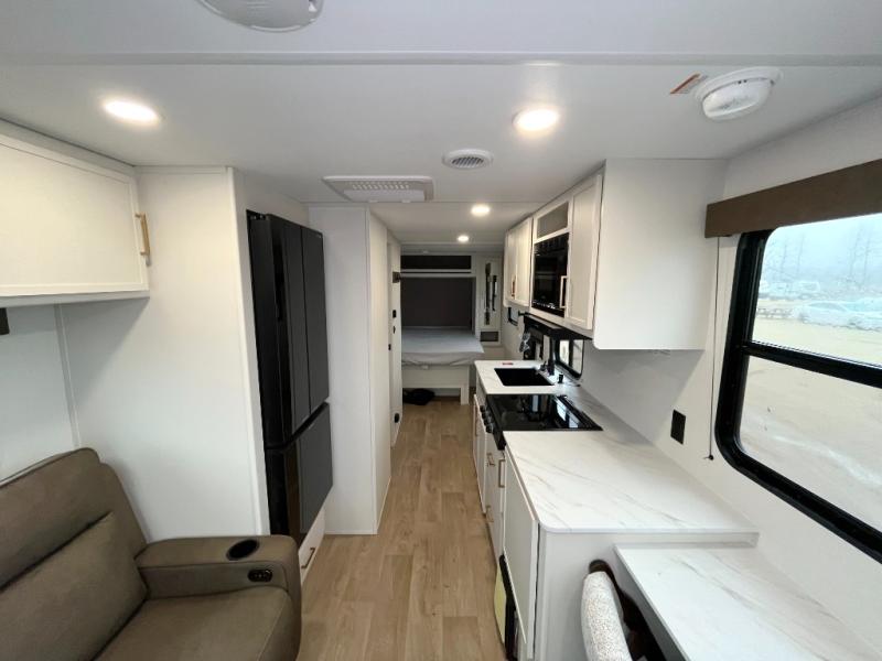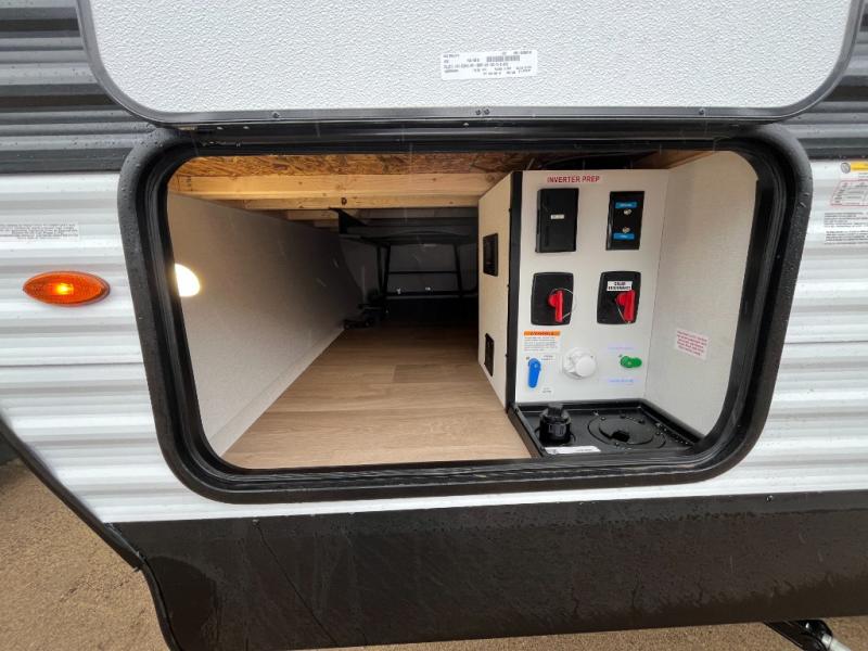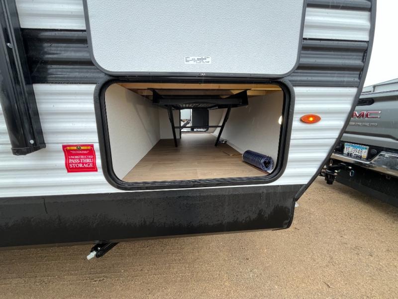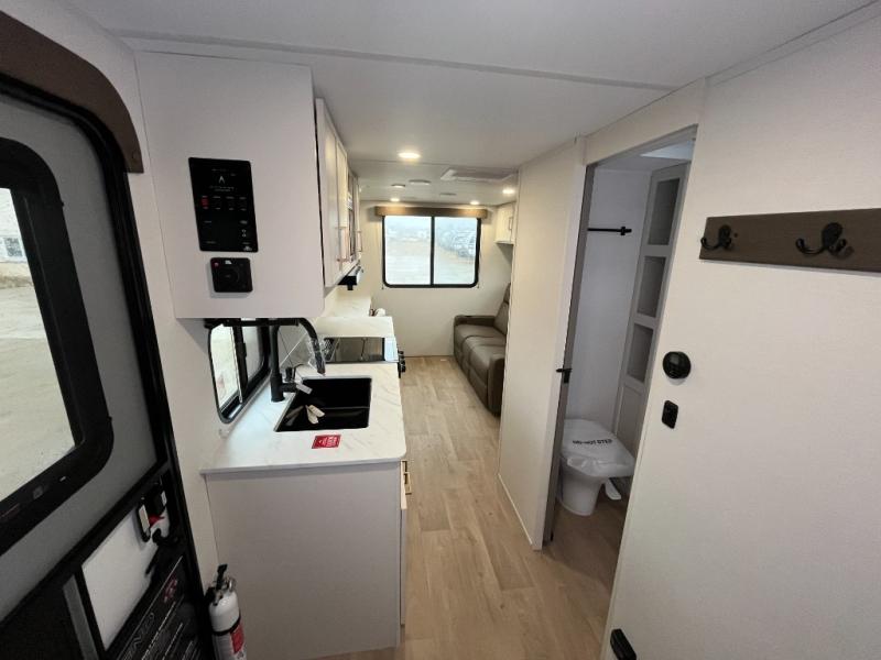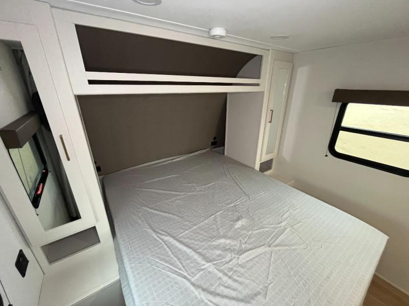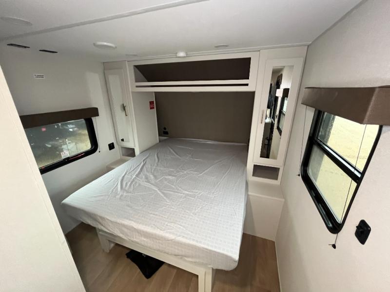 It will be so easy to enjoy camping trips in this travel trailer. The rear living area includes a 70" bi-fold sofa where your guests can sleep, plus a countertop with two chairs for dining space. You'll find your own bedroom up front with a walk-around queen bed, dual beside wardrobes, a privacy curtain and TV prep if you choose to add entertainment. The kitchen includes a three-burner cooktop, a microwave oven, and a 10-cu. ft. refrigerator to cook and store food, and you'll appreciate the middle bath that is easily accessible for all.