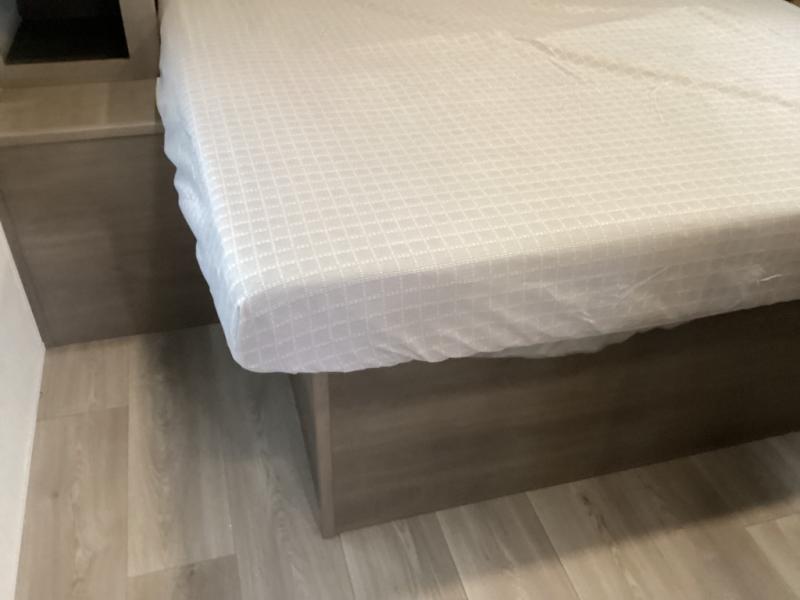 Moves the queen bed into its own cozy space, creating separation and extra lounge area without expanding your towing footprint. -