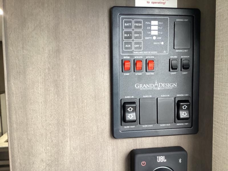 Features include a power awning with LED lighting, exterior speakers, and a smooth power tongue jack—setup is effortless. -