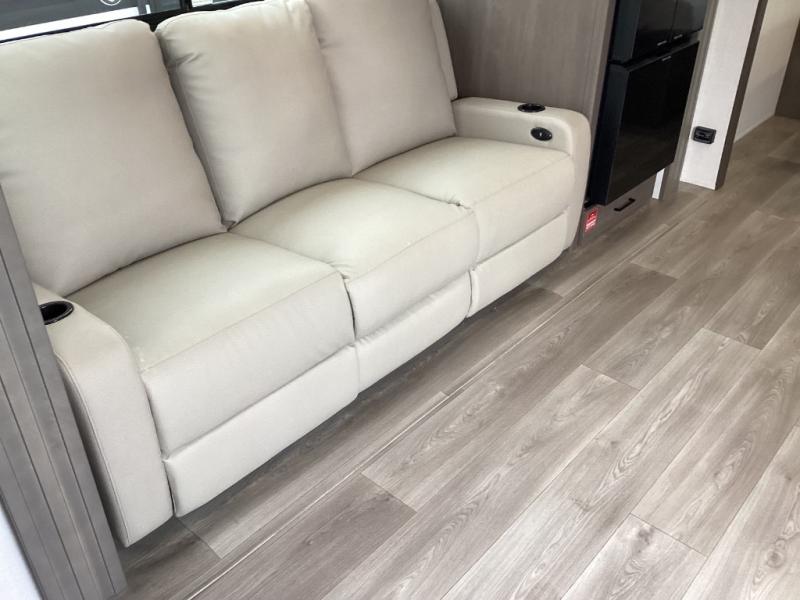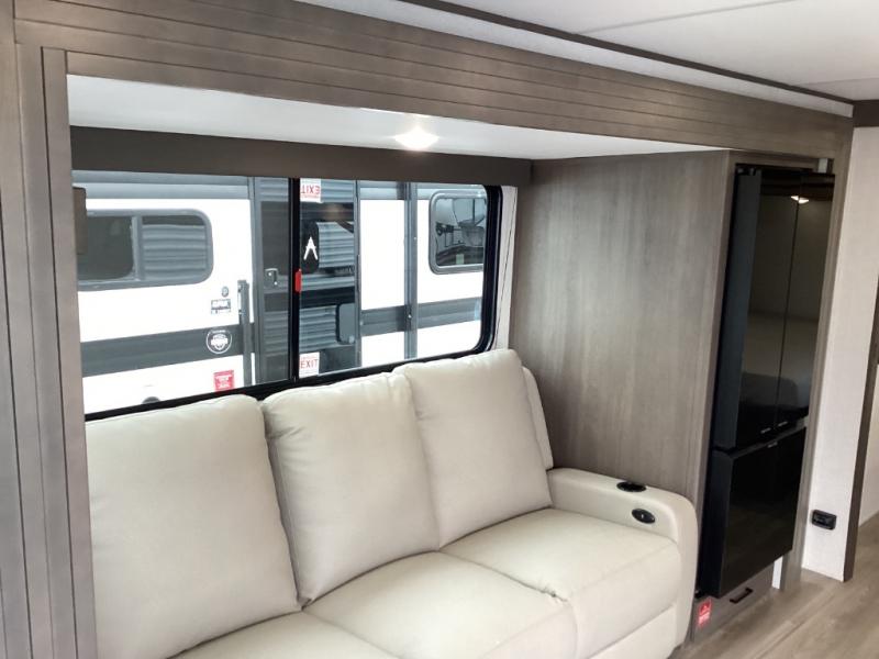 At the front, relax in comfort around a booth dinette and theater-style seating—ideal for meals, games, or downtime. -