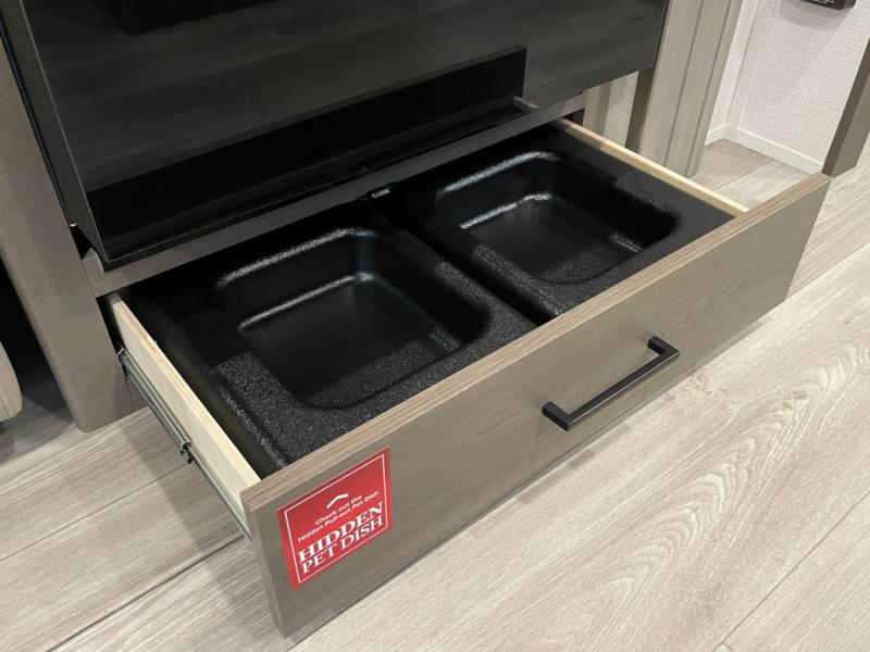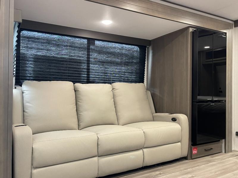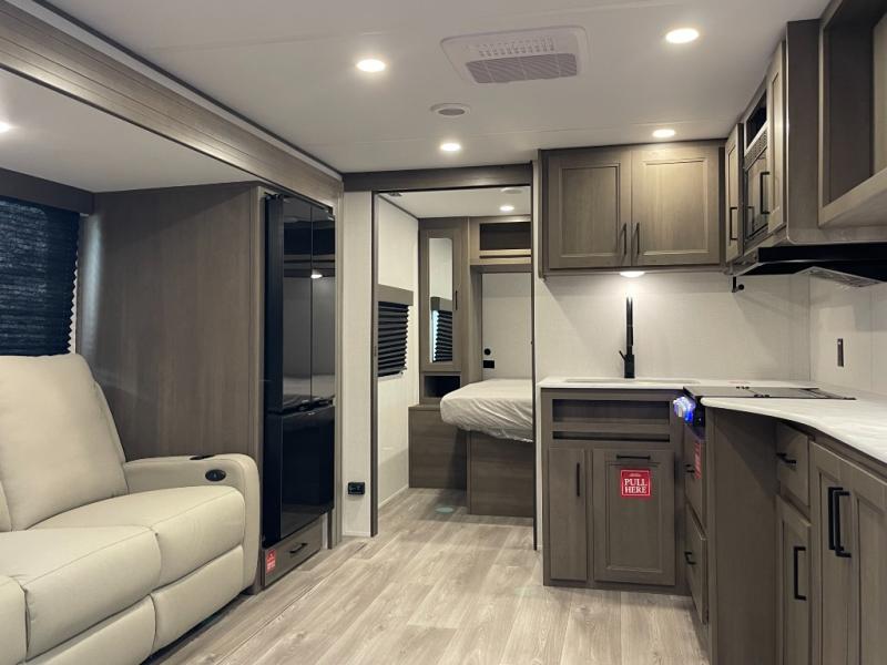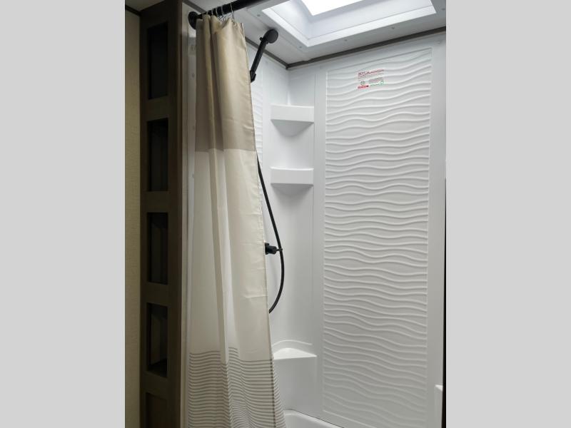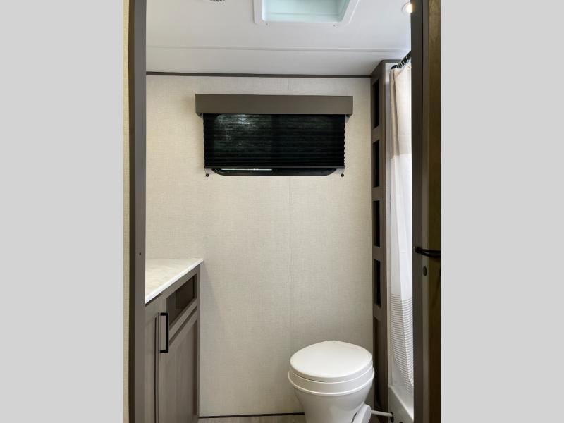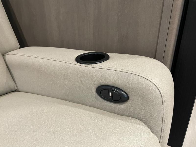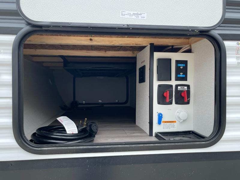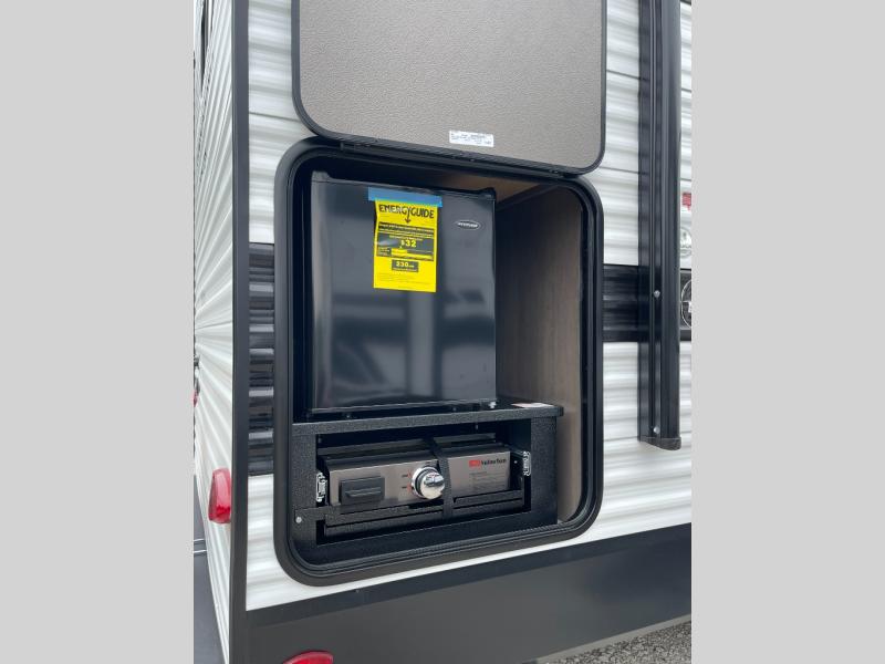 Pack your bags and head for the campground in this spacious travel trailer! Once you arrive, you can unload the pass-thru storage, then make lunch on the exterior griddle with a 1.7 cu. ft. exterior refrigerator. The U-shaped dinette slide will provide a place to dine if you decide not to stay outside under the 16' power awning. Optional theater seats can be chosen in place of the dinette for even more comfort! You'll sleep soundly on the queen bed in the front bedroom, and the full rear bath lets you freshen up each day.