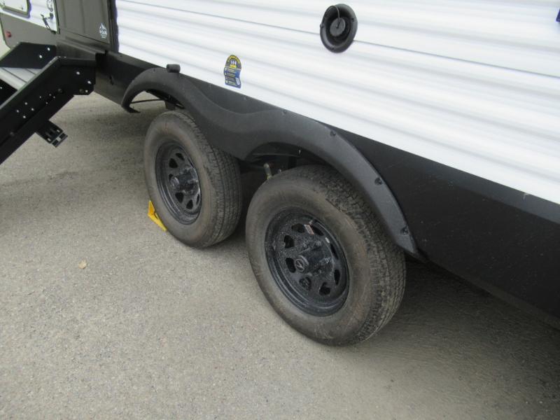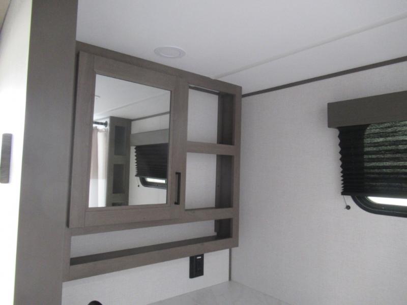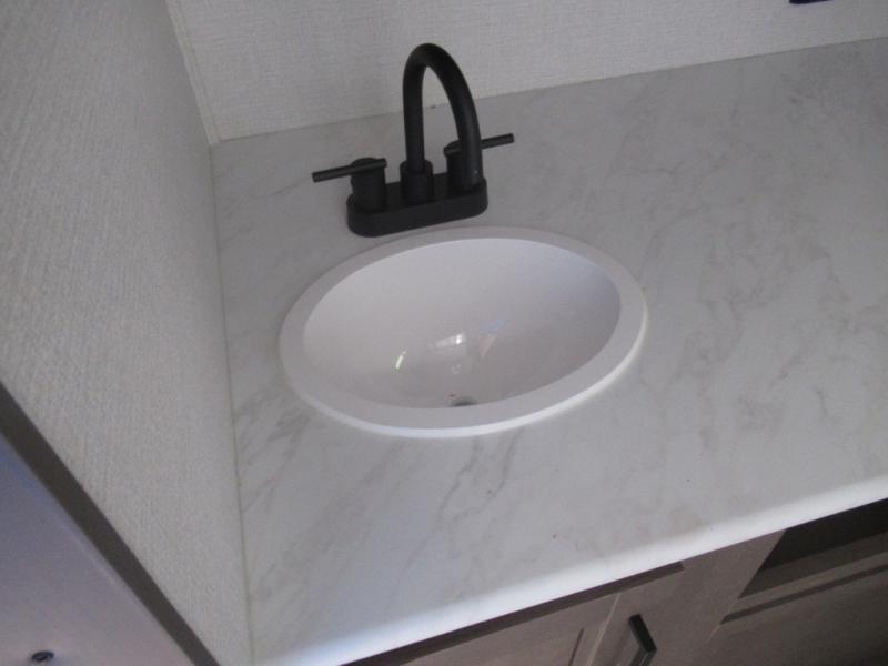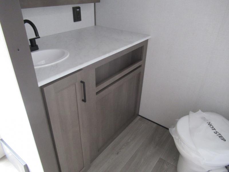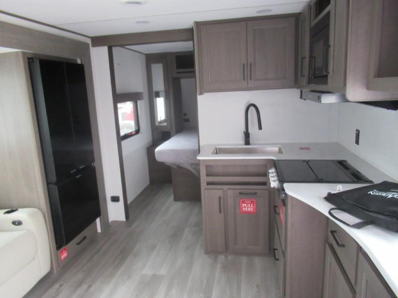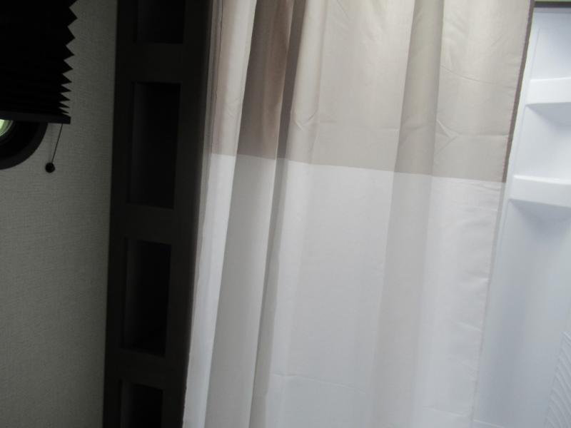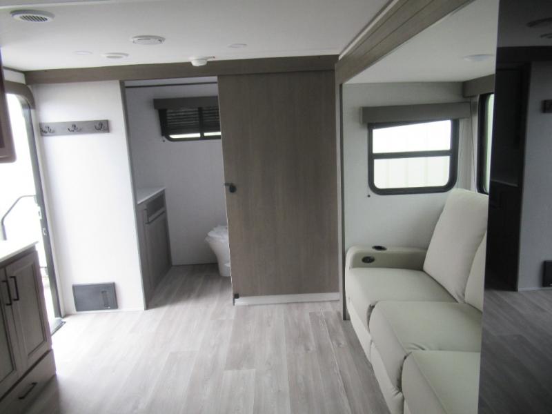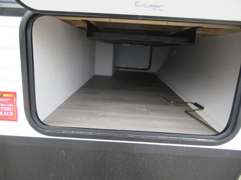 Pack your bags and head for the campground in this spacious travel trailer! Once you arrive, you can unload the pass-thru storage, then make lunch on the exterior griddle with a 1.7 cu. ft. exterior refrigerator. The U-shaped dinette slide will provide a place to dine if you decide not to stay outside under the 16' power awning. Optional theater seats can be chosen in place of the dinette for even more comfort! You'll sleep soundly on the queen bed in the front bedroom, and the full rear bath lets you freshen up each day.