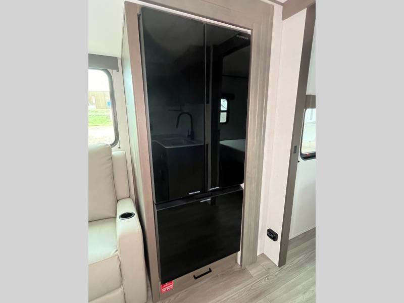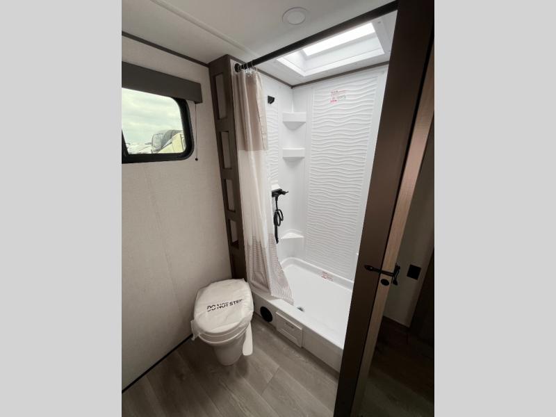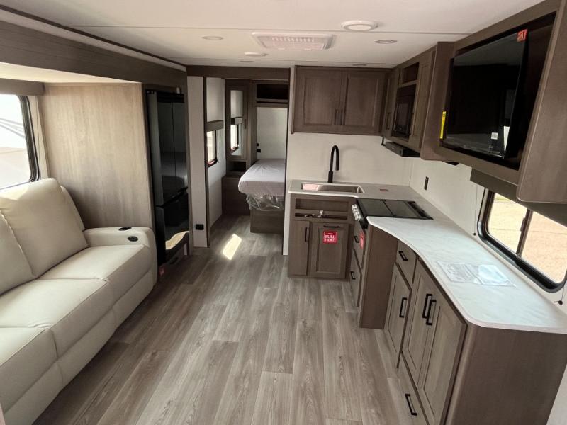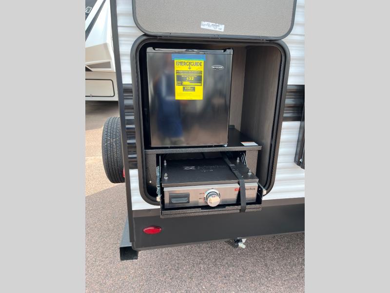 Pack your bags and head for the campground in this spacious travel trailer! Once you arrive, you can unload the pass-thru storage, then make lunch on the exterior griddle with a 1.7 cu. ft. exterior refrigerator. The U-shaped dinette slide will provide a place to dine if you decide not to stay outside under the 16' power awning. Optional theater seats can be chosen in place of the dinette for even more comfort! You'll sleep soundly on the queen bed in the front bedroom, and the full rear bath lets you freshen up each day.