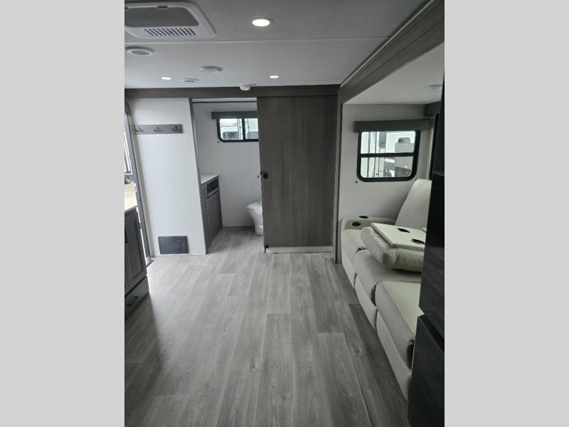 Pack your bags and head for the campground in this spacious travel trailer! Once you arrive, you can unload the pass-thru storage, then make lunch on the exterior griddle with a 1.7 cu. ft. exterior refrigerator. The U-shaped dinette slide will provide a place to dine if you decide not to stay outside under the 16' power awning. Optional theater seats can be chosen in place of the dinette for even more comfort! You'll sleep soundly on the queen bed in the front bedroom, and the full rear bath lets you freshen up each day.