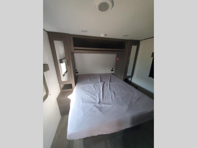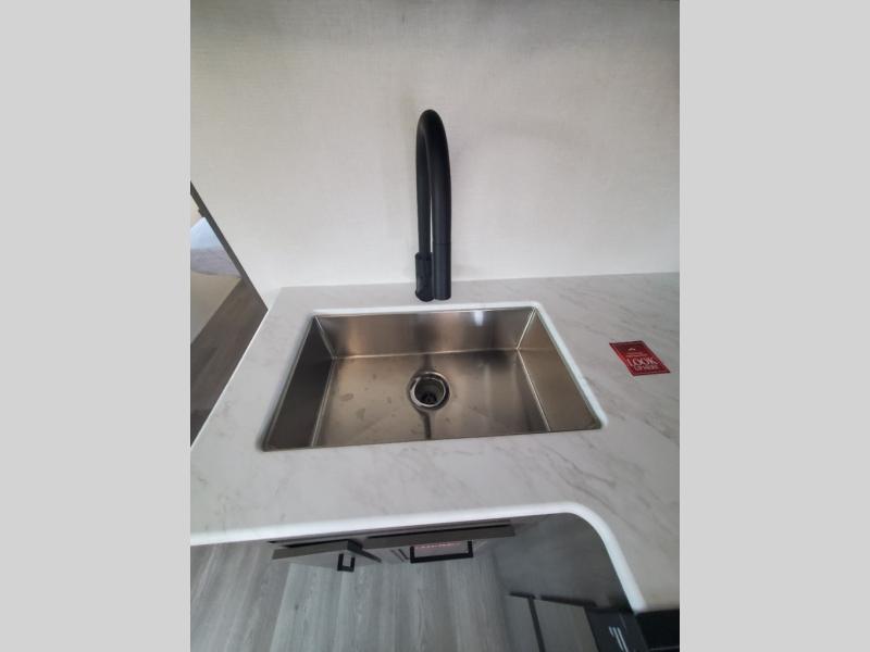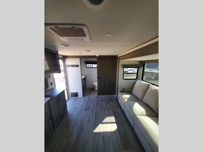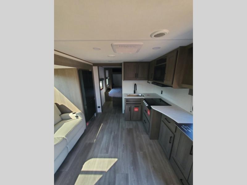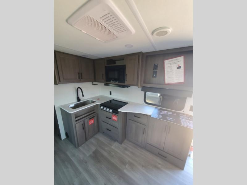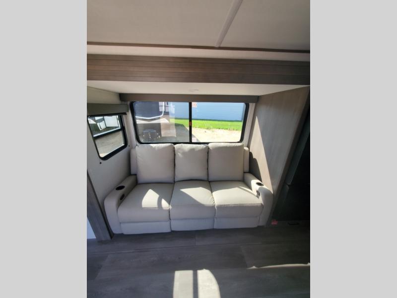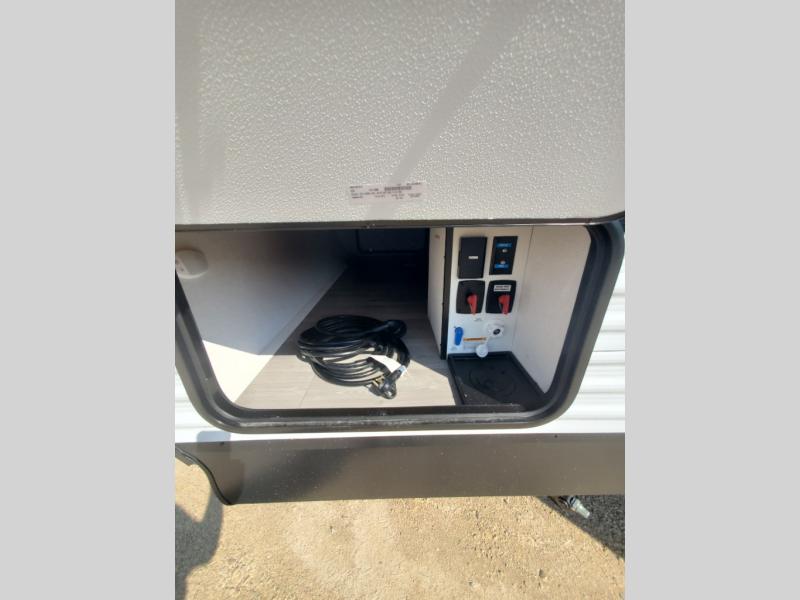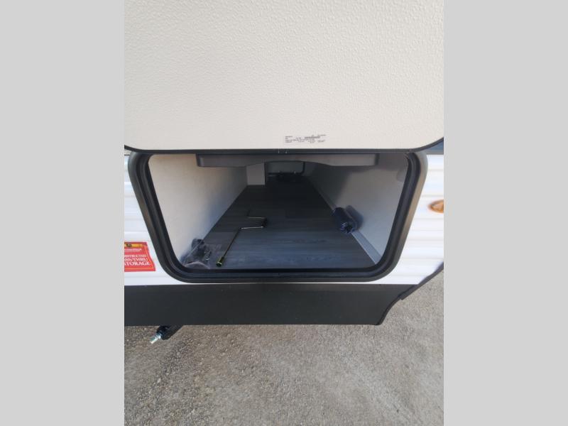 Pack your bags and head for the campground in this spacious travel trailer! Once you arrive, you can unload the pass-thru storage, then make lunch on the exterior griddle with a 1.7 cu. ft. exterior refrigerator. The U-shaped dinette slide will provide a place to dine if you decide not to stay outside under the 16' power awning. Optional theater seats can be chosen in place of the dinette for even more comfort! You'll sleep soundly on the queen bed in the front bedroom, and the full rear bath lets you freshen up each day.