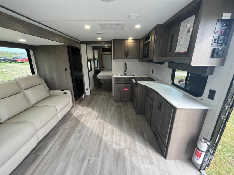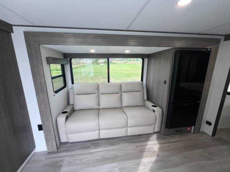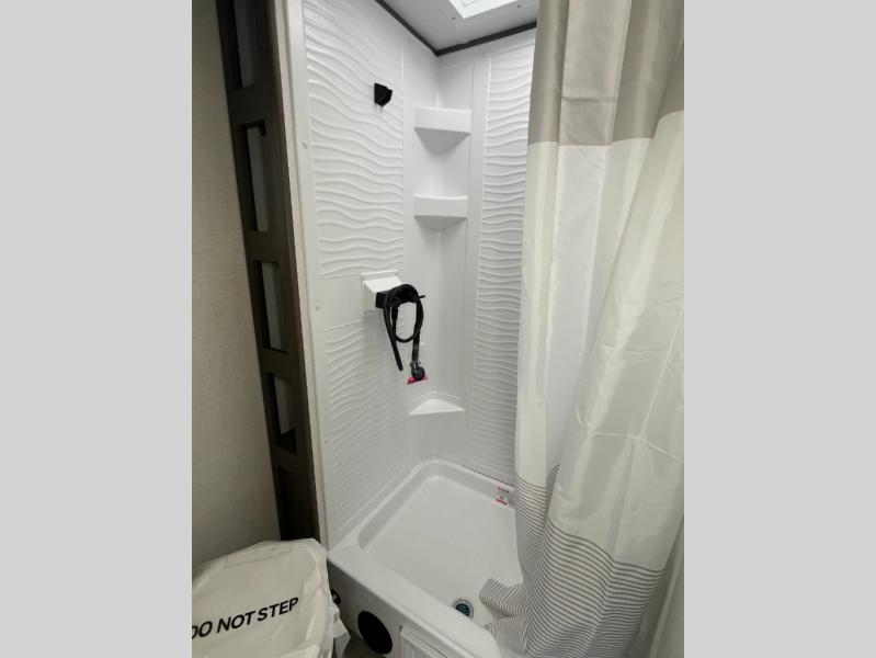 Pack your bags and head for the campground in this spacious travel trailer! Once you arrive, you can unload the pass-thru storage, then make lunch on the exterior griddle with a 1.7 cu. ft. exterior refrigerator. The U-shaped dinette slide will provide a place to dine if you decide not to stay outside under the 16' power awning. Optional theater seats can be chosen in place of the dinette for even more comfort! You'll sleep soundly on the queen bed in the front bedroom, and the full rear bath lets you freshen up each day.