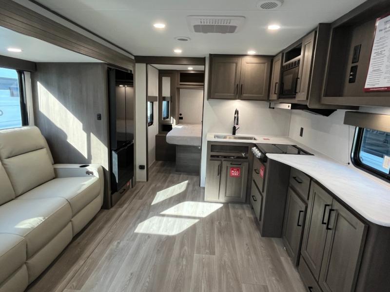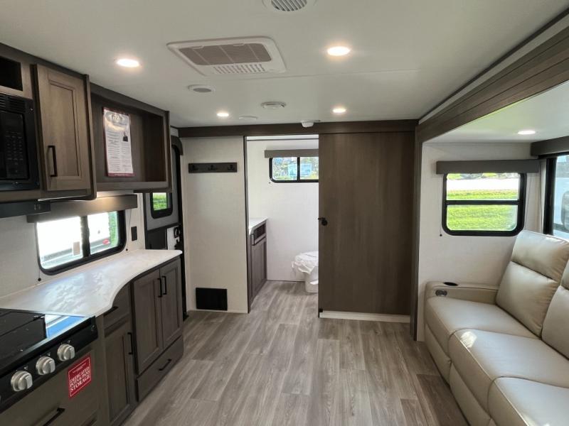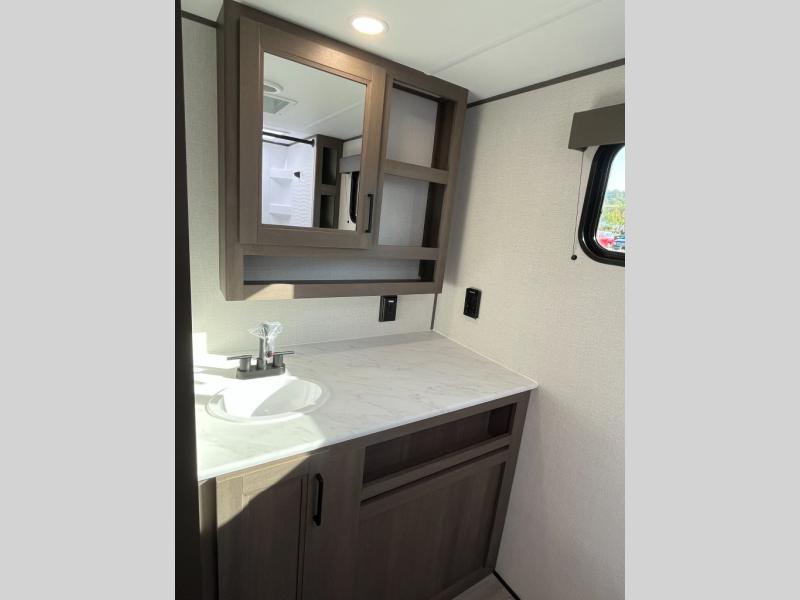 Pack your bags and head for the campground in this spacious travel trailer! Once you arrive, you can unload the pass-thru storage, then make lunch on the exterior griddle with a 1.7 cu. ft. exterior refrigerator. The U-shaped dinette slide will provide a place to dine if you decide not to stay outside under the 16' power awning. Optional theater seats can be chosen in place of the dinette for even more comfort! You'll sleep soundly on the queen bed in the front bedroom, and the full rear bath lets you freshen up each day.