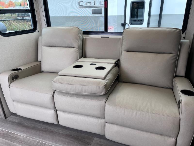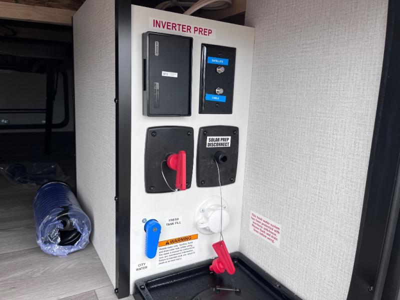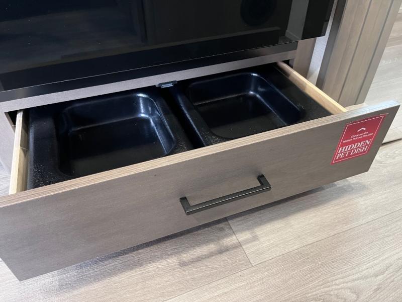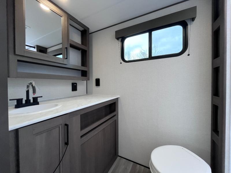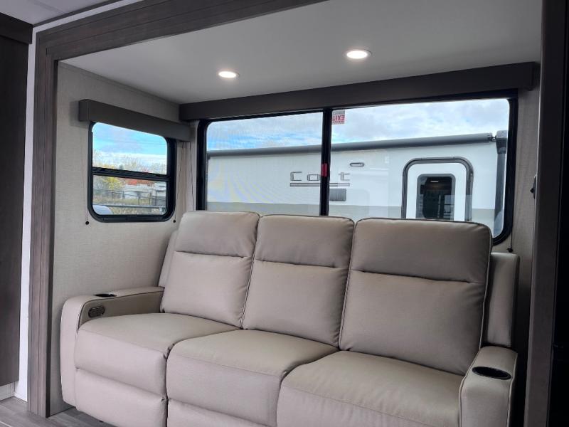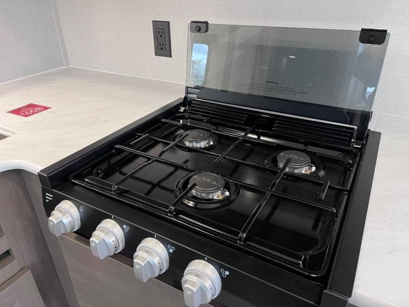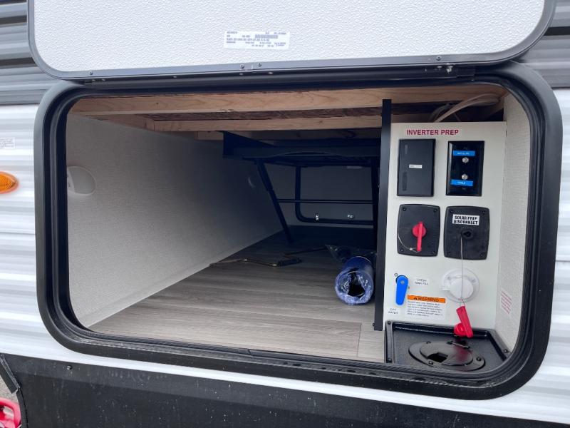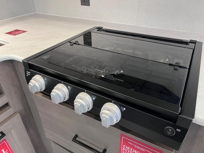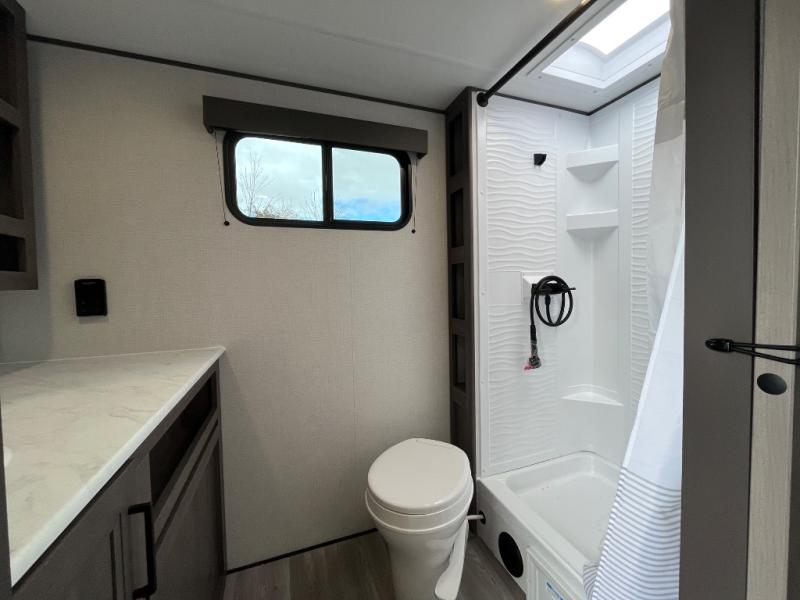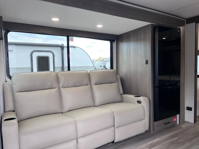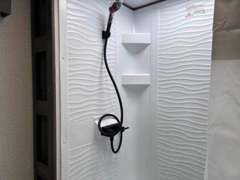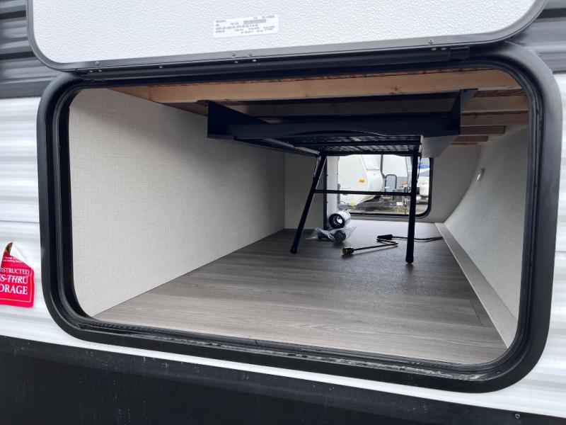 Pack your bags and head for the campground in this spacious travel trailer! Once you arrive, you can unload the pass-thru storage, then make lunch on the exterior griddle with a 1.7 cu. ft. exterior refrigerator. The U-shaped dinette slide will provide a place to dine if you decide not to stay outside under the 16' power awning. Optional theater seats can be chosen in place of the dinette for even more comfort! You'll sleep soundly on the queen bed in the front bedroom, and the full rear bath lets you freshen up each day.