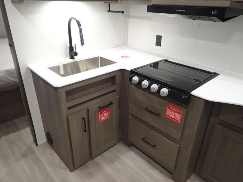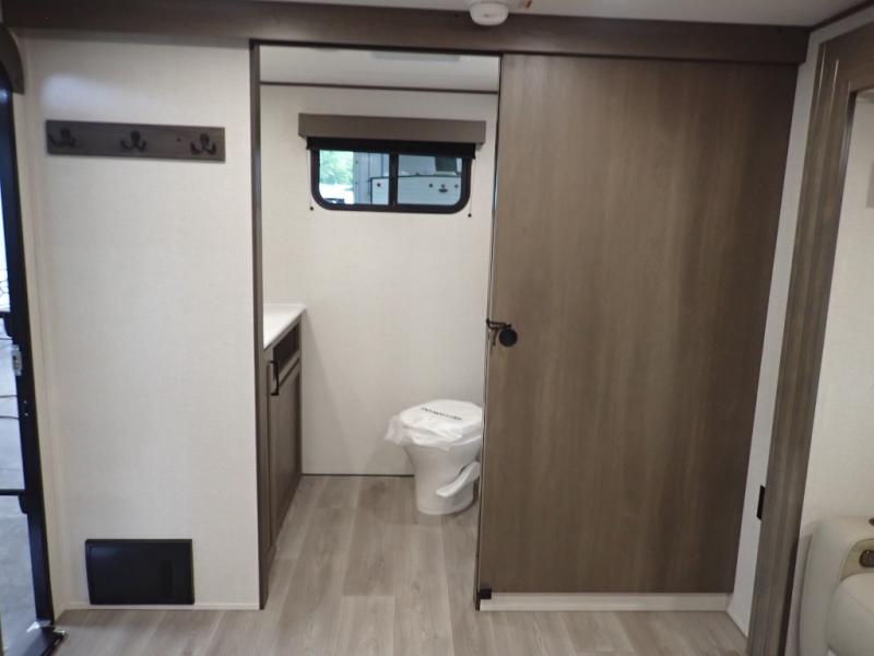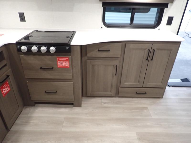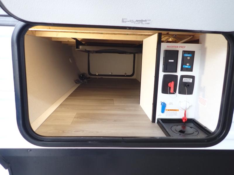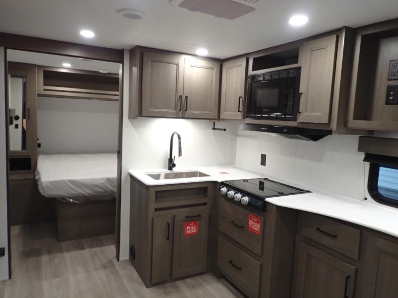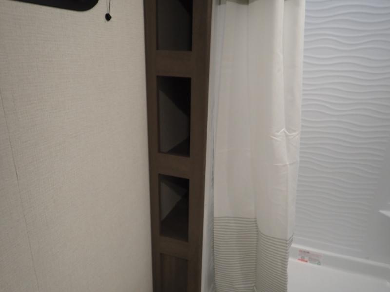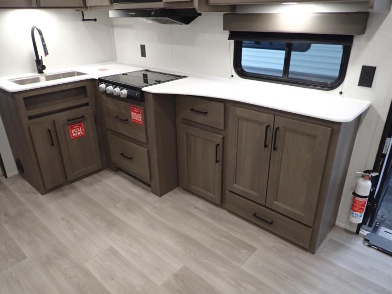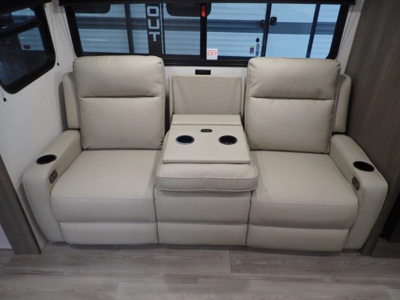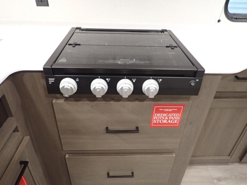 Pack your bags and head for the campground in this spacious travel trailer! Once you arrive, you can unload the pass-thru storage, then make lunch on the exterior griddle with a 1.7 cu. ft. exterior refrigerator. The U-shaped dinette slide will provide a place to dine if you decide not to stay outside under the 16' power awning. Optional theater seats can be chosen in place of the dinette for even more comfort! You'll sleep soundly on the queen bed in the front bedroom, and the full rear bath lets you freshen up each day.