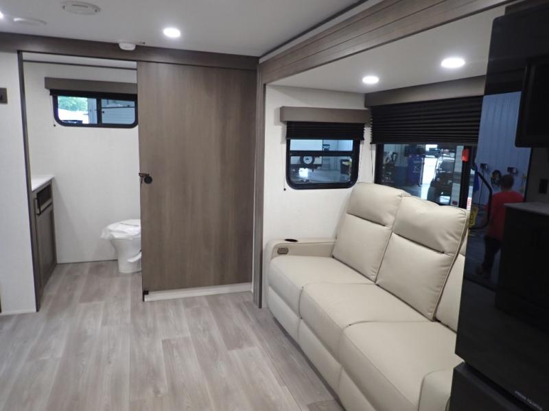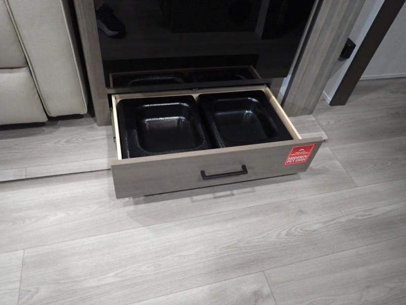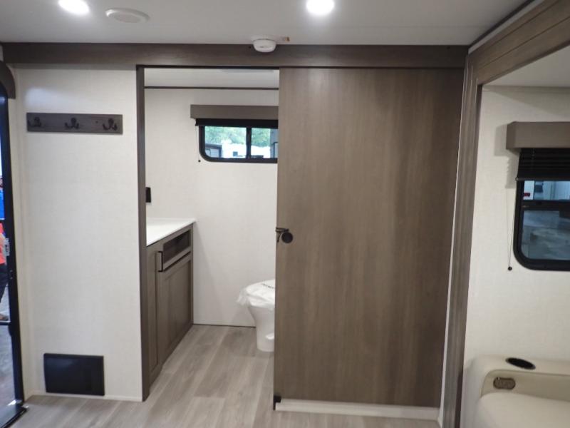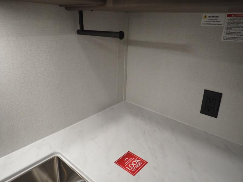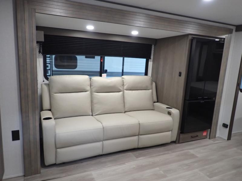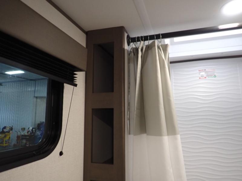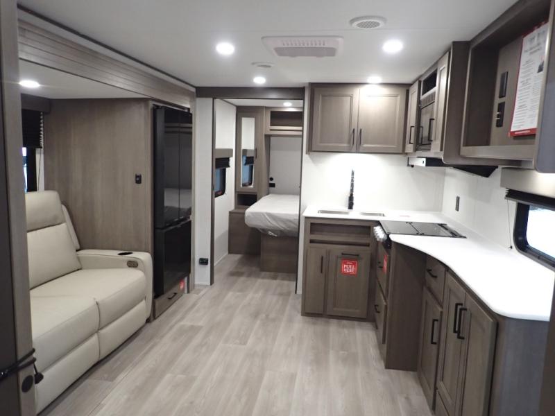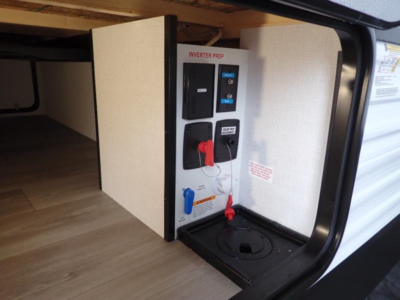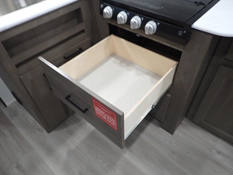 Pack your bags and head for the campground in this spacious travel trailer! Once you arrive, you can unload the pass-thru storage, then make lunch on the exterior griddle with a 1.7 cu. ft. exterior refrigerator. The U-shaped dinette slide will provide a place to dine if you decide not to stay outside under the 16' power awning. Optional theater seats can be chosen in place of the dinette for even more comfort! You'll sleep soundly on the queen bed in the front bedroom, and the full rear bath lets you freshen up each day.