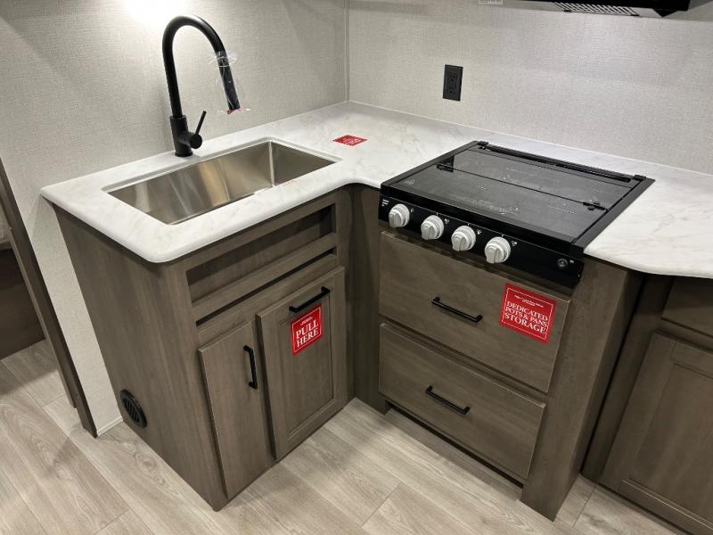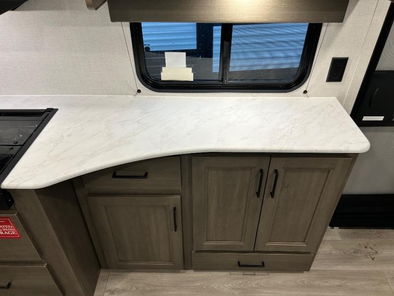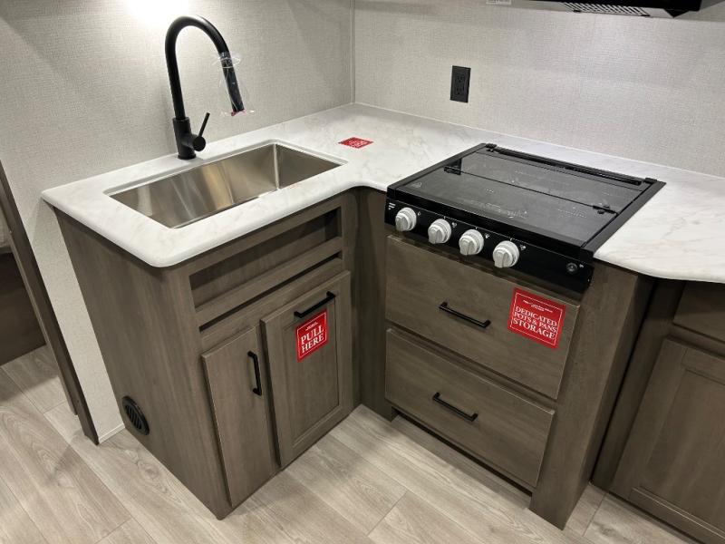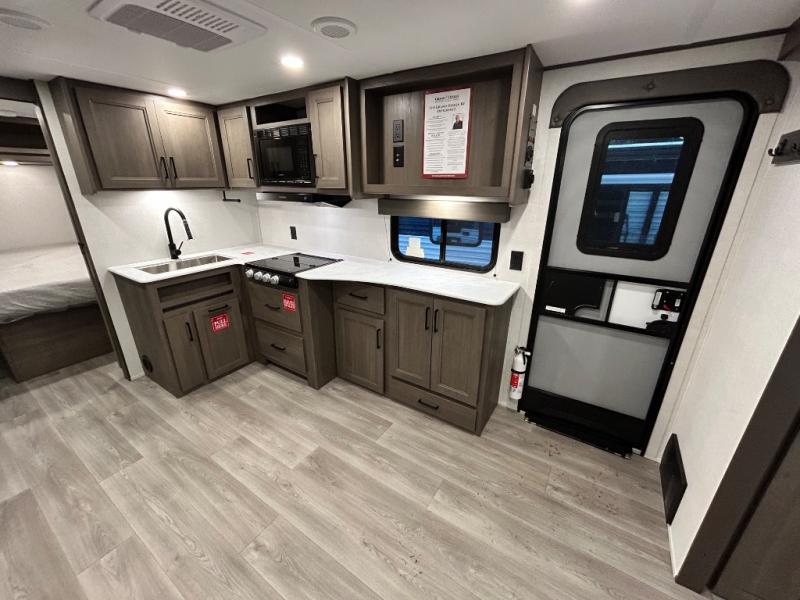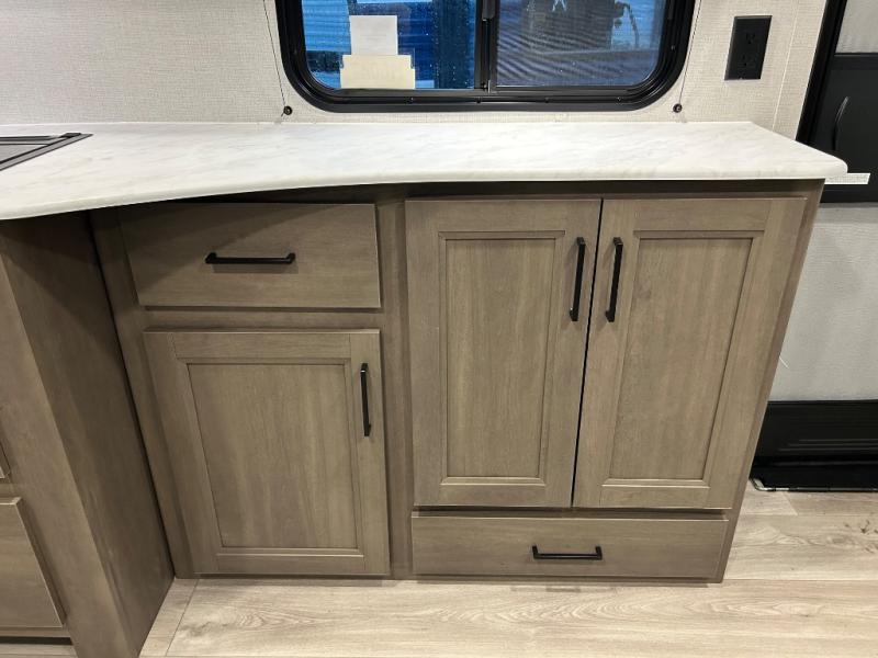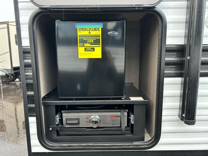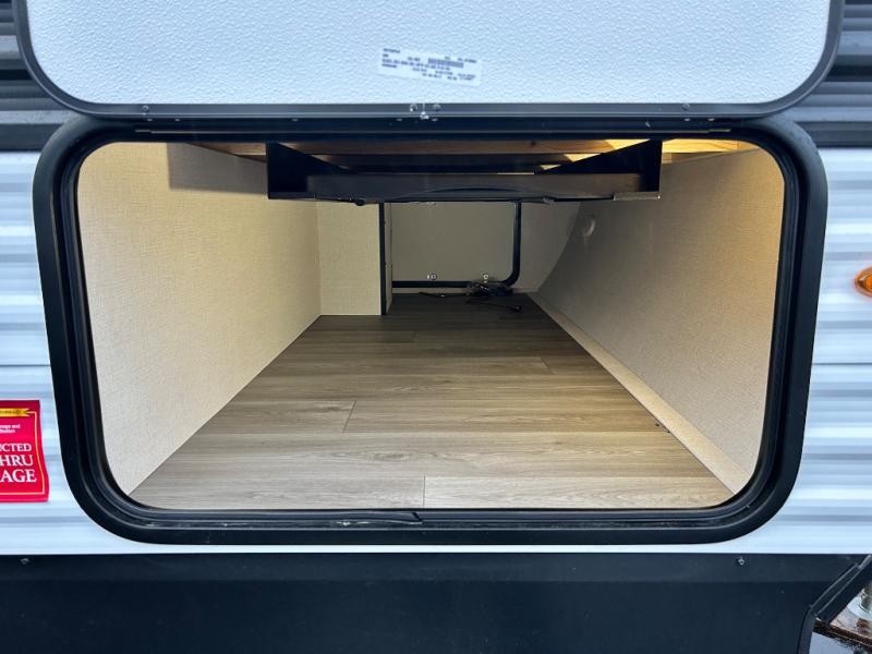 Pack your bags and head for the campground in this spacious travel trailer! Once you arrive, you can unload the pass-thru storage, then make lunch on the exterior griddle with a 1.7 cu. ft. exterior refrigerator. The U-shaped dinette slide will provide a place to dine if you decide not to stay outside under the 16' power awning. Optional theater seats can be chosen in place of the dinette for even more comfort! You'll sleep soundly on the queen bed in the front bedroom, and the full rear bath lets you freshen up each day.