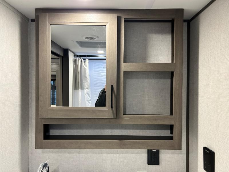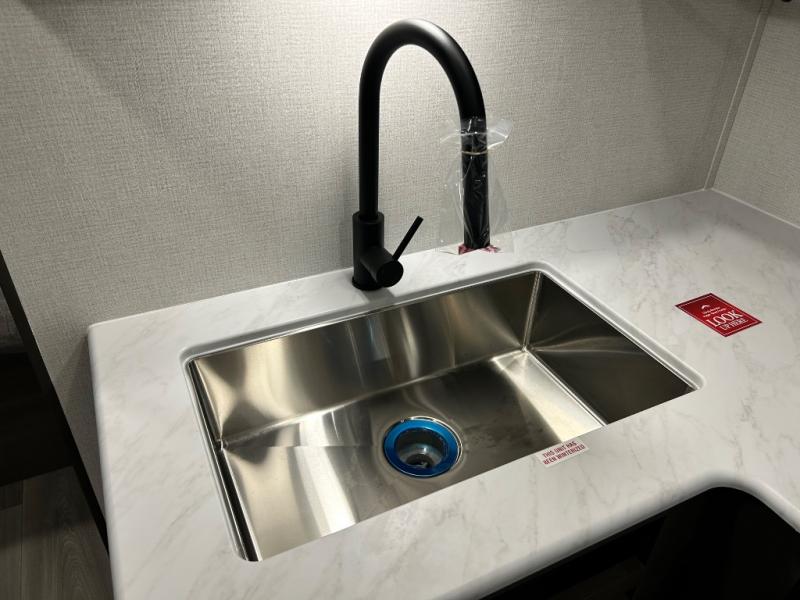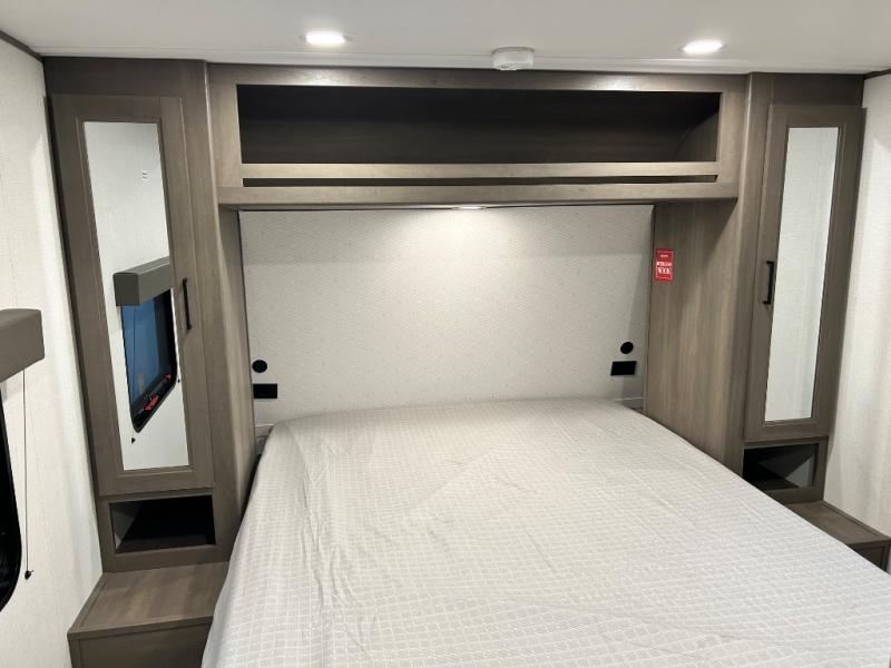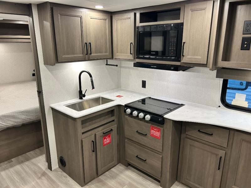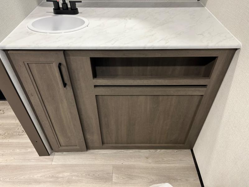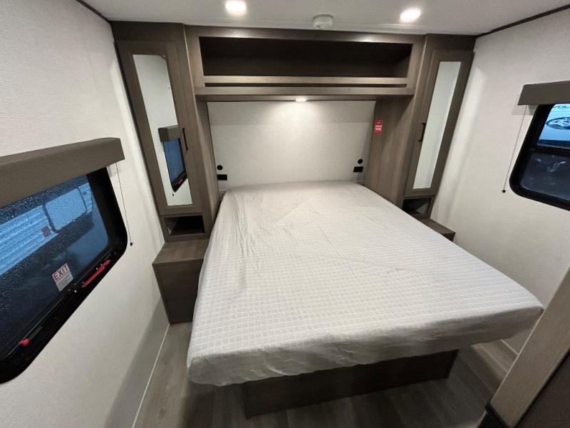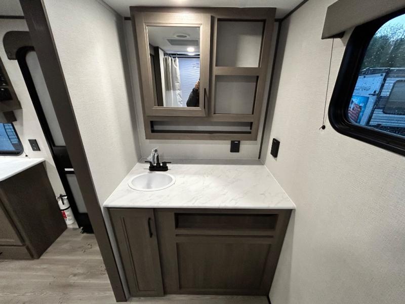 Pack your bags and head for the campground in this spacious travel trailer! Once you arrive, you can unload the pass-thru storage, then make lunch on the exterior griddle with a 1.7 cu. ft. exterior refrigerator. The U-shaped dinette slide will provide a place to dine if you decide not to stay outside under the 16' power awning. Optional theater seats can be chosen in place of the dinette for even more comfort! You'll sleep soundly on the queen bed in the front bedroom, and the full rear bath lets you freshen up each day.