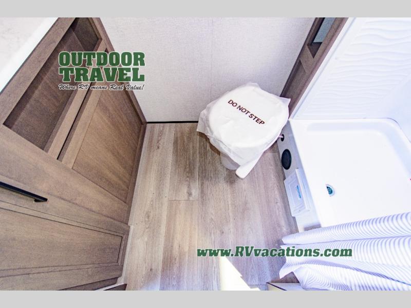Pack your bags and head for the campground in this spacious travel trailer! Once you arrive, you can unload the pass-thru storage, then make lunch on the exterior griddle with a 1.7 cu. ft. exterior refrigerator. The U-shaped dinette slide will provide a place to dine if you decide not to stay outside under the 16' power awning. Optional theater seats can be chosen in place of the dinette for even more comfort! You'll sleep soundly on the queen bed in the front bedroom, and the full rear bath lets you freshen up each day.