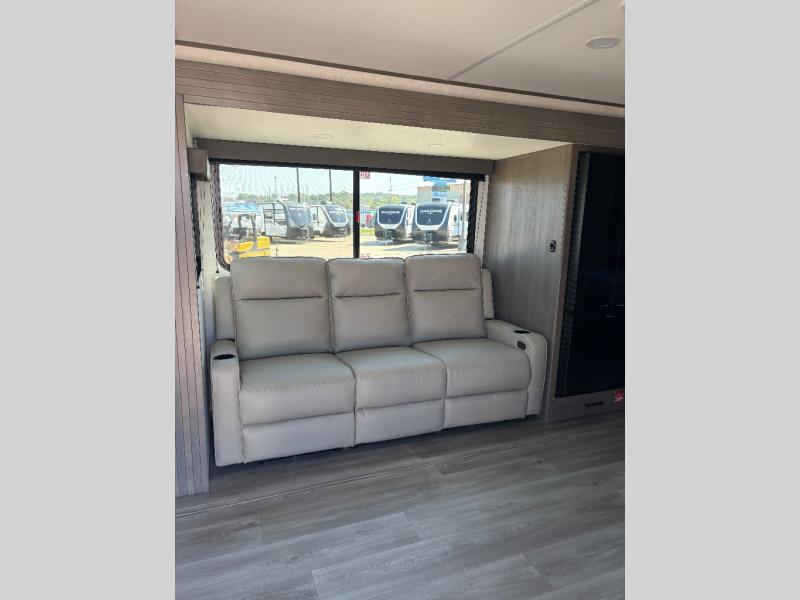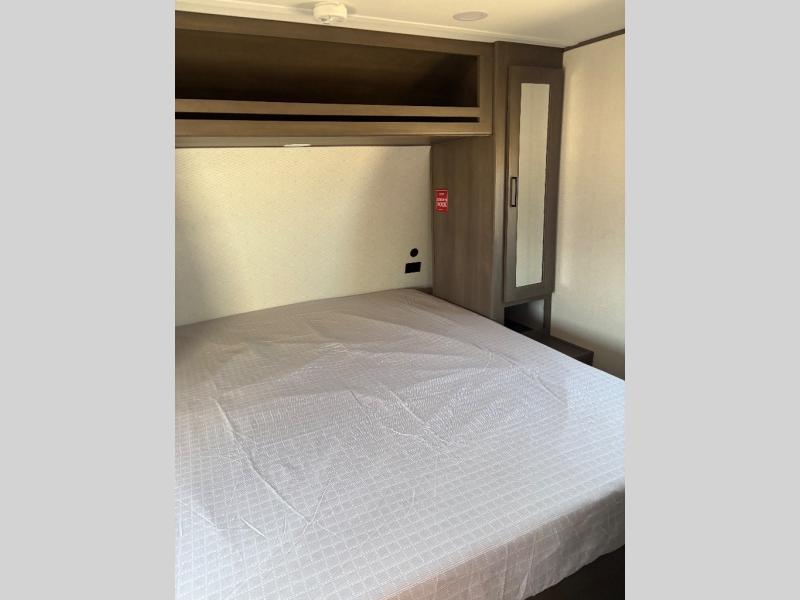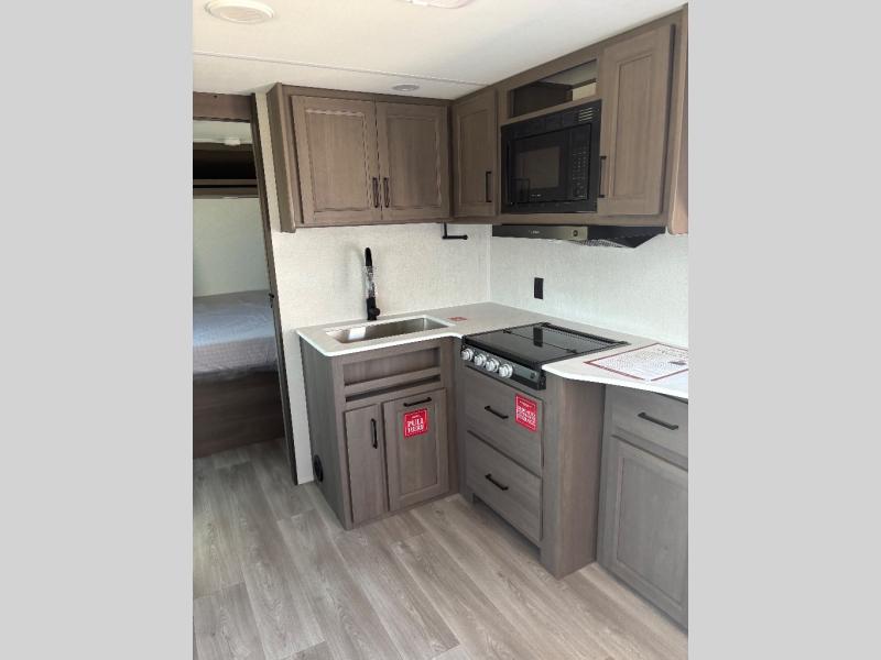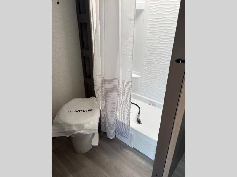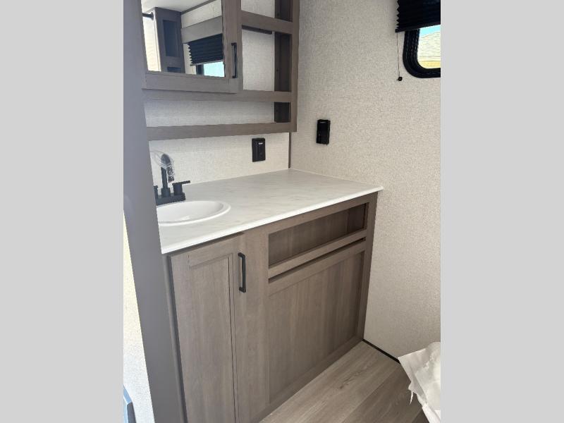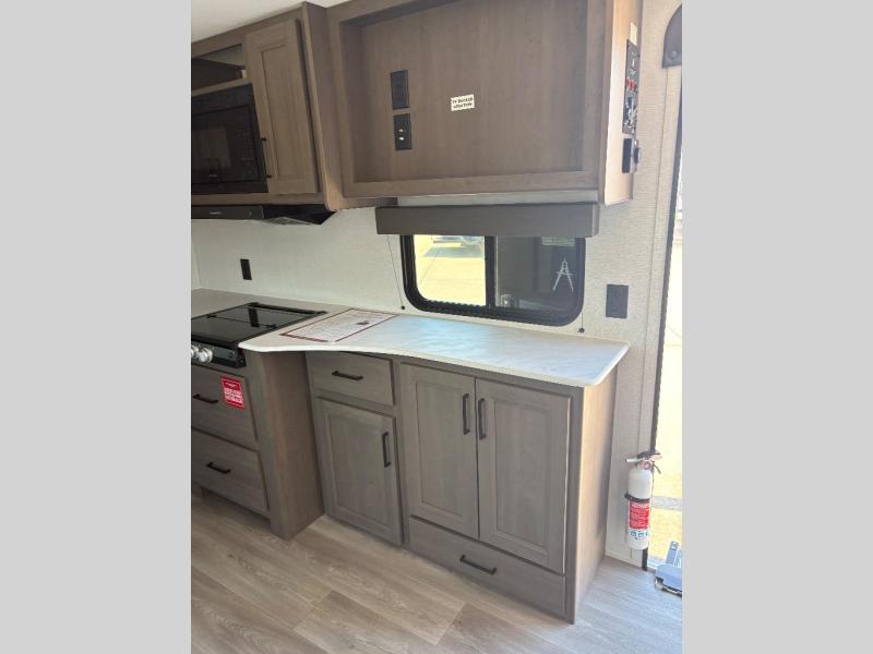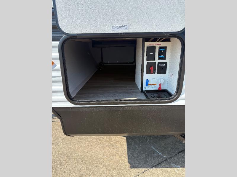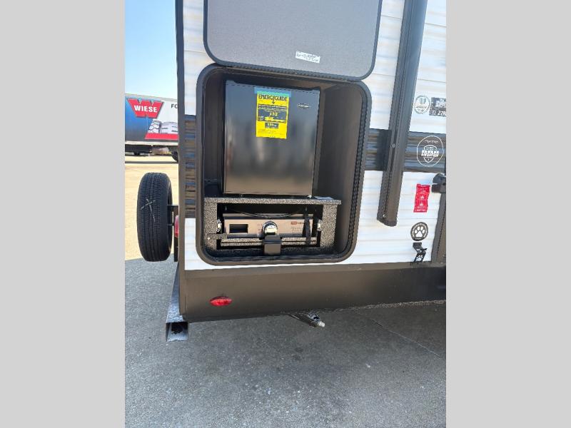 Pack your bags and head for the campground in this spacious travel trailer! Once you arrive, you can unload the pass-thru storage, then make lunch on the exterior griddle with a 1.7 cu. ft. exterior refrigerator. The U-shaped dinette slide will provide a place to dine if you decide not to stay outside under the 16' power awning. Optional theater seats can be chosen in place of the dinette for even more comfort! You'll sleep soundly on the queen bed in the front bedroom, and the full rear bath lets you freshen up each day.