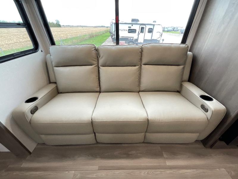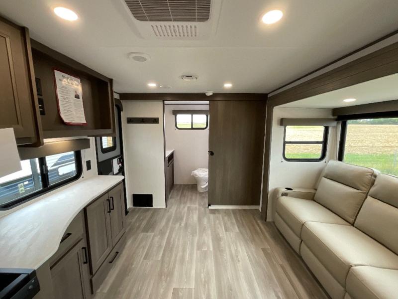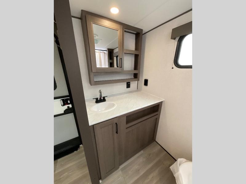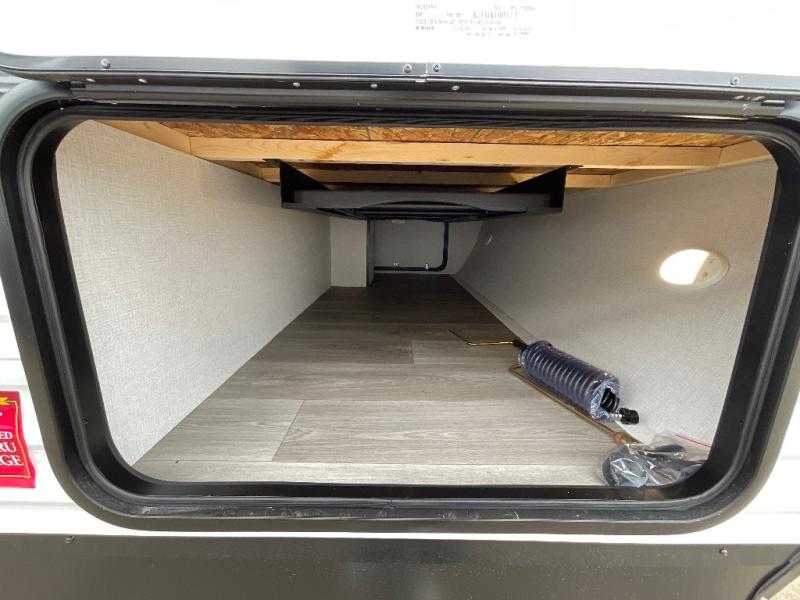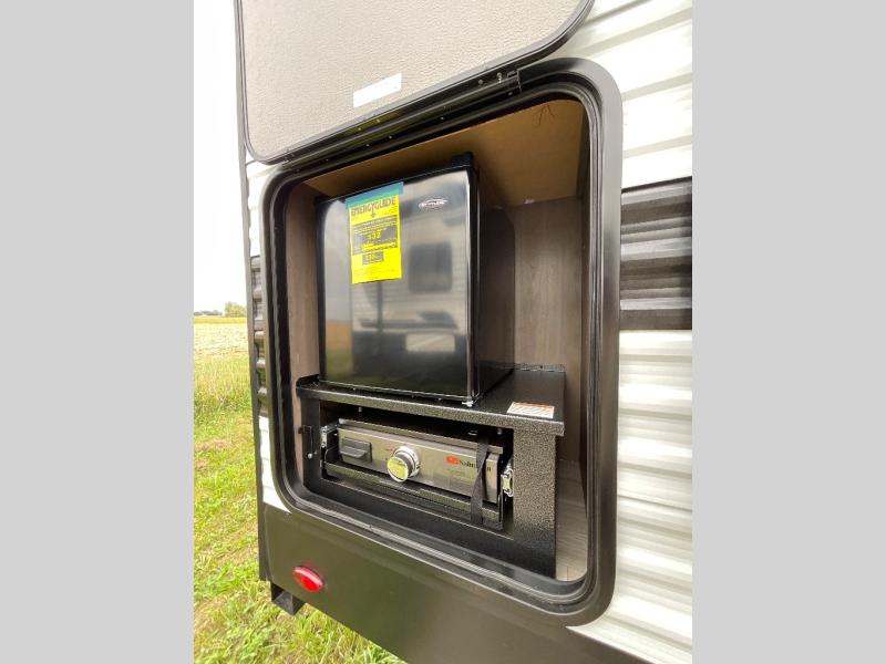 Pack your bags and head for the campground in this spacious travel trailer! Once you arrive, you can unload the pass-thru storage, then make lunch on the exterior griddle with a 1.7 cu. ft. exterior refrigerator. The U-shaped dinette slide will provide a place to dine if you decide not to stay outside under the 16' power awning. Optional theater seats can be chosen in place of the dinette for even more comfort! You'll sleep soundly on the queen bed in the front bedroom, and the full rear bath lets you freshen up each day.