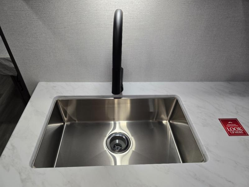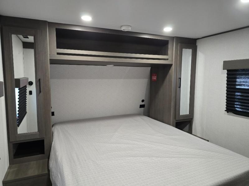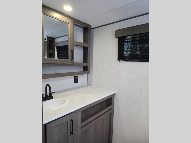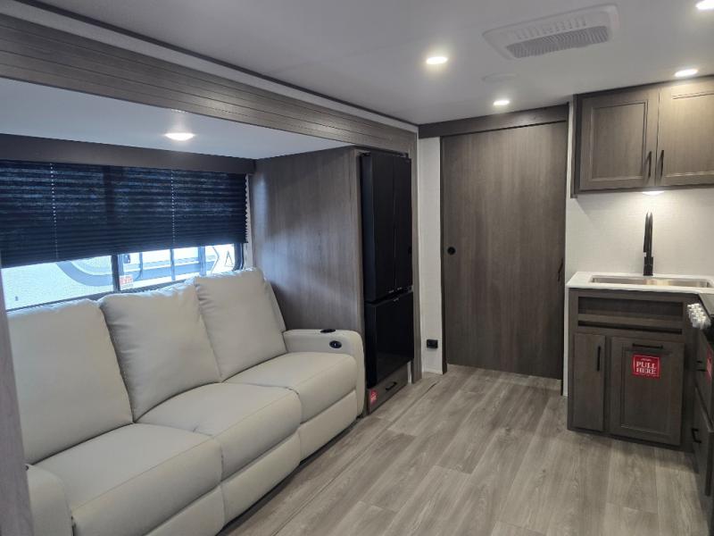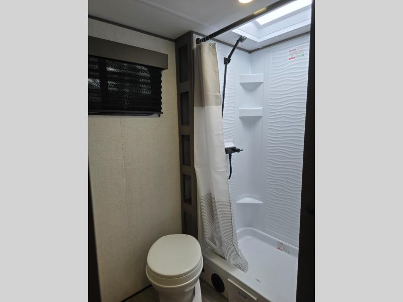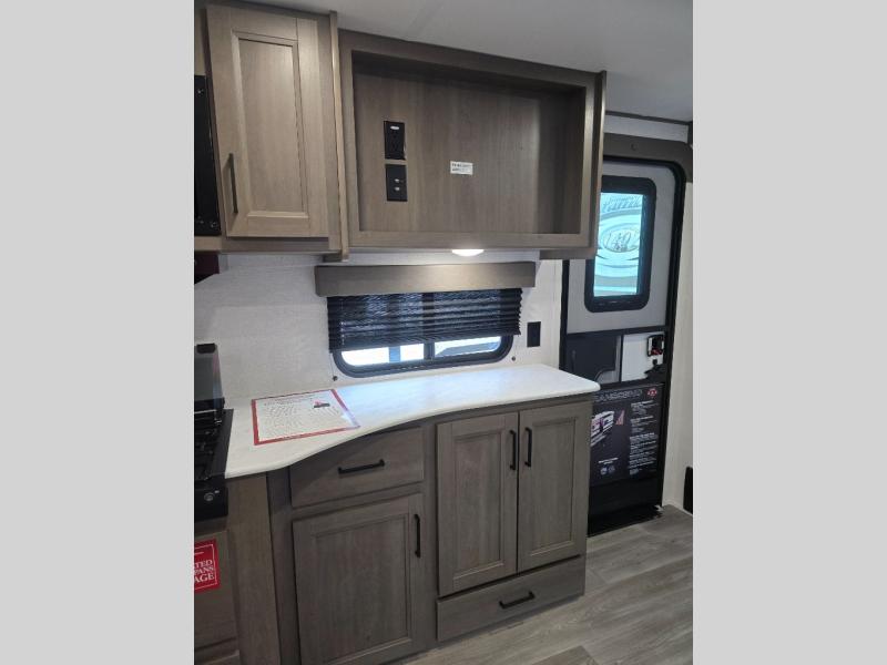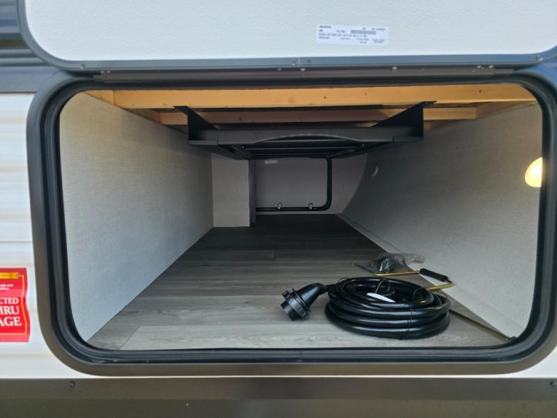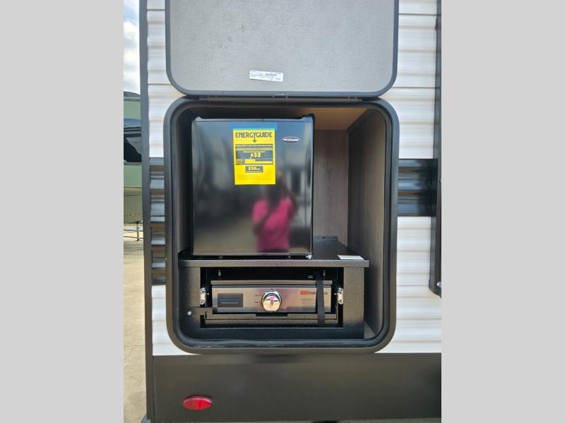 Pack your bags and head for the campground in this spacious travel trailer! Once you arrive, you can unload the pass-thru storage, then make lunch on the exterior griddle with a 1.7 cu. ft. exterior refrigerator. The U-shaped dinette slide will provide a place to dine if you decide not to stay outside under the 16' power awning. Optional theater seats can be chosen in place of the dinette for even more comfort! You'll sleep soundly on the queen bed in the front bedroom, and the full rear bath lets you freshen up each day.