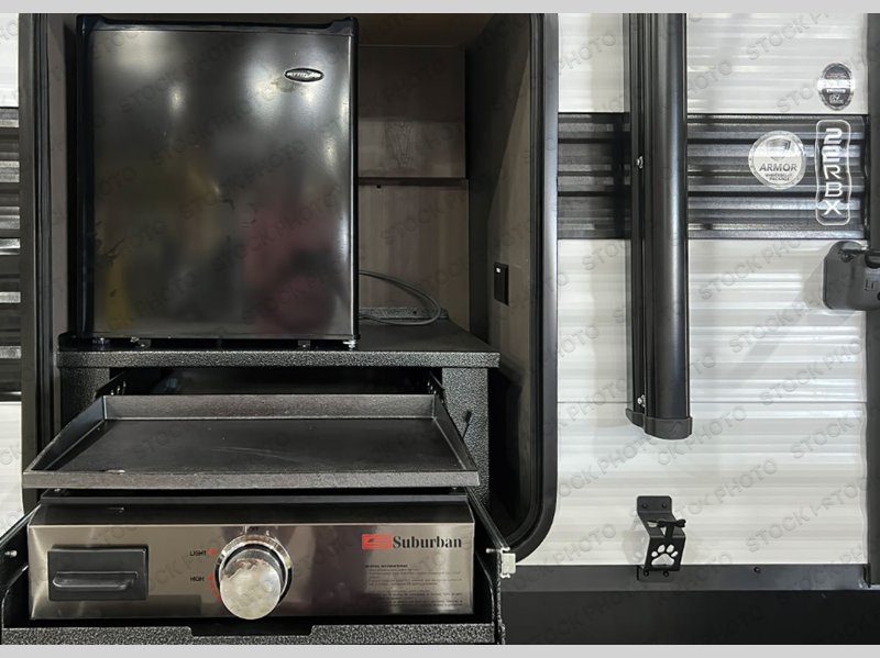 Pack your bags and head for the campground in this spacious travel trailer! Once you arrive, you can unload the pass-thru storage, then make lunch on the exterior griddle with a 1.7 cu. ft. exterior refrigerator. The U-shaped dinette slide will provide a place to dine if you decide not to stay outside under the 16' power awning. Optional theater seats can be chosen in place of the dinette for even more comfort! You'll sleep soundly on the queen bed in the front bedroom, and the full rear bath lets you freshen up each day.