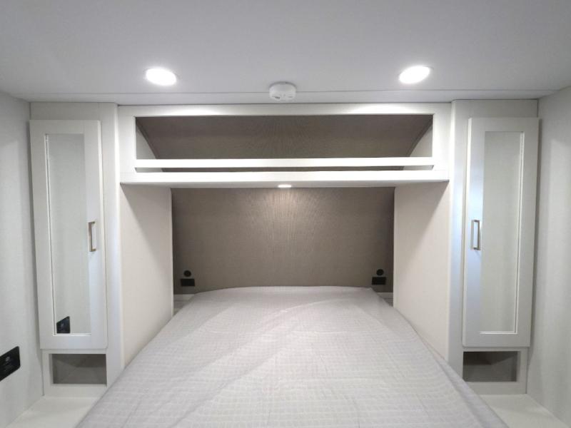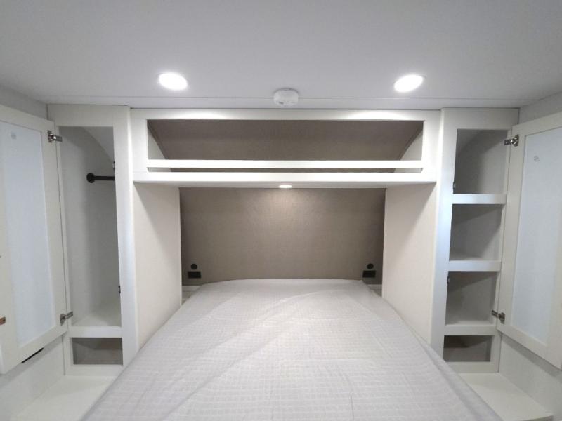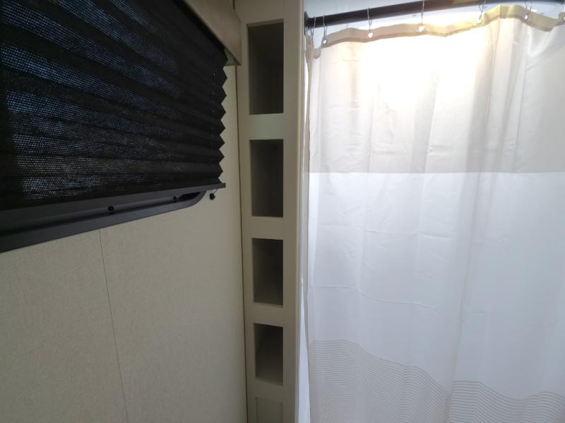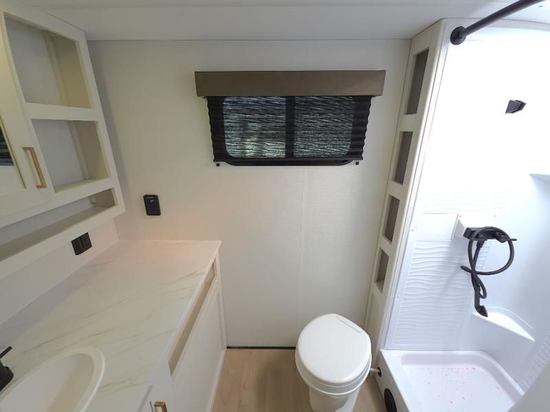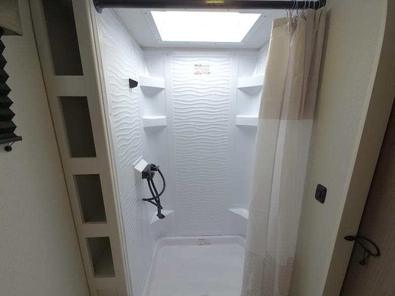 Inside, you’ll find a bright, open living space with comfortable seating, a functional dinette, and a fully equipped kitchen featuring modern appliances, generous counter space, and ample storage. The private sleeping area provides a cozy retreat after long days of exploring, while the spacious rear bathroom offers a large shower and convenient layout that feels anything but compact.