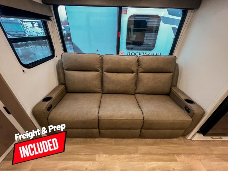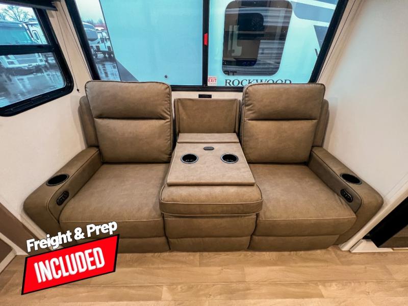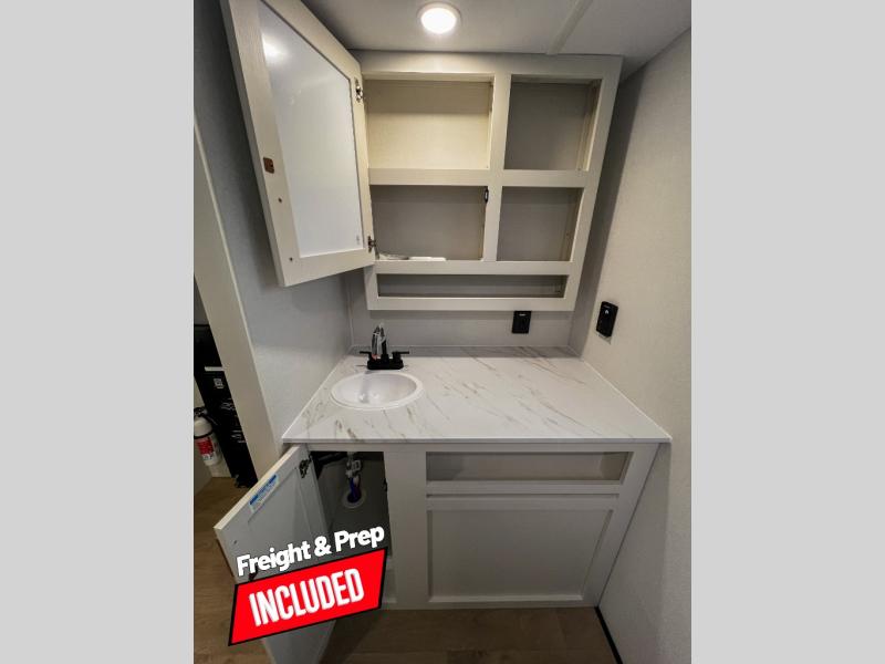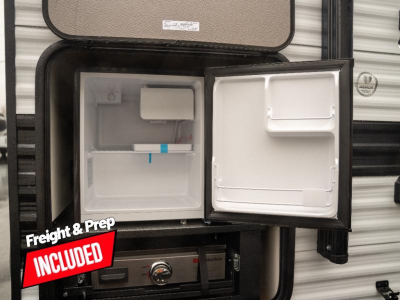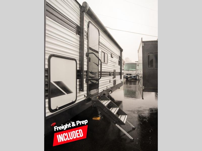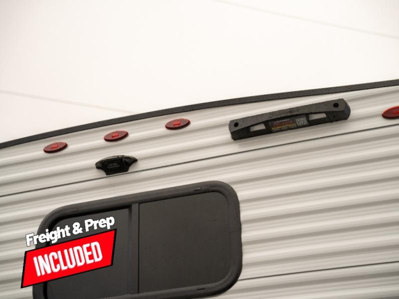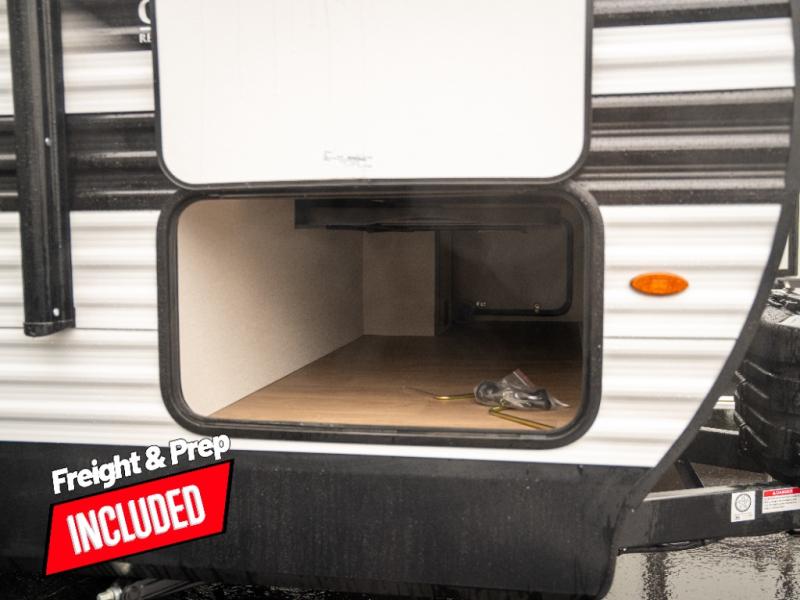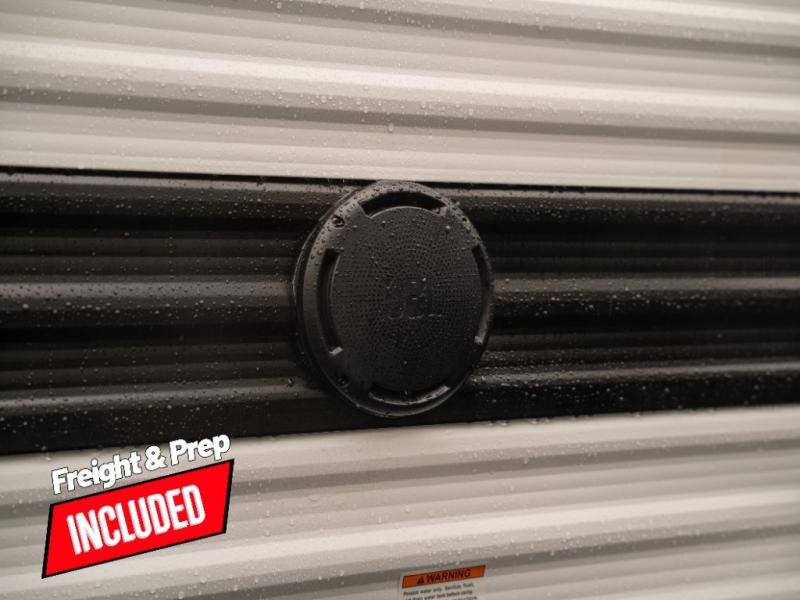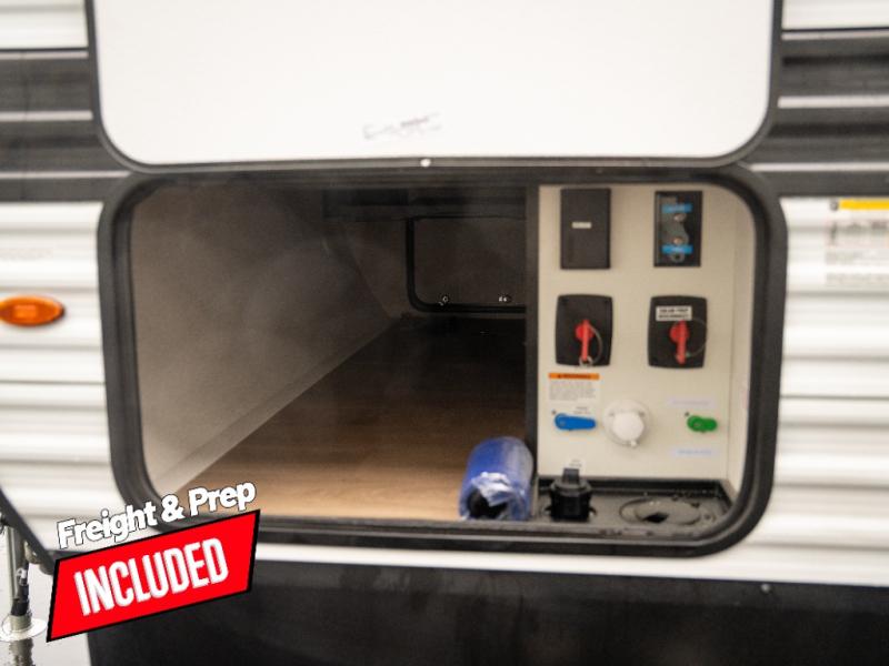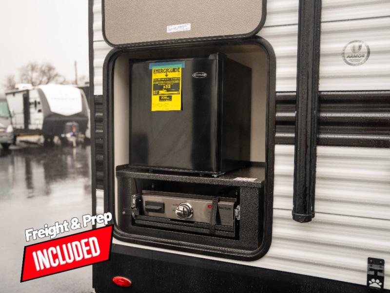 Pack your bags and head for the campground in this spacious travel trailer! Once you arrive, you can unload the pass-thru storage, then make lunch on the exterior griddle with a 1.7 cu. ft. exterior refrigerator. The U-shaped dinette slide will provide a place to dine if you decide not to stay outside under the 16' power awning. Optional theater seats can be chosen in place of the dinette for even more comfort! You'll sleep soundly on the queen bed in the front bedroom, and the full rear bath lets you freshen up each day.