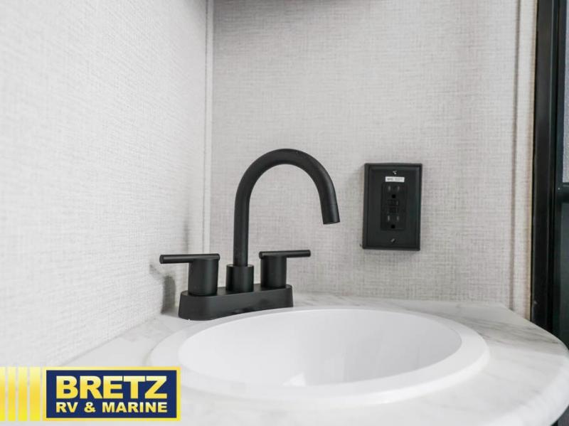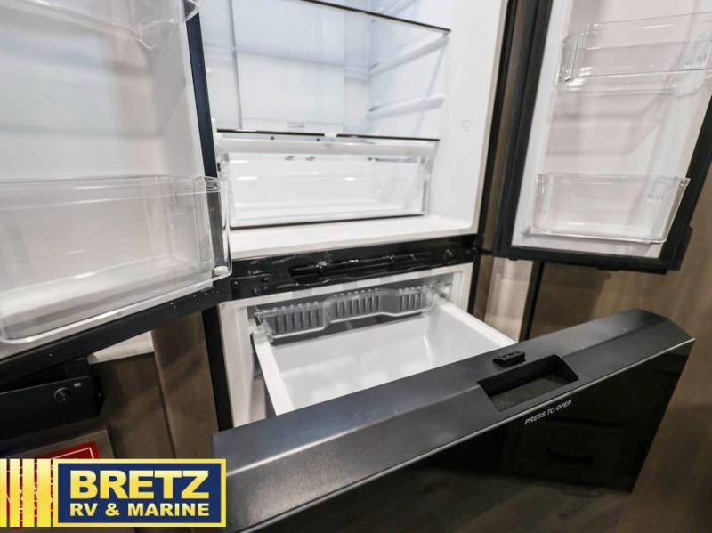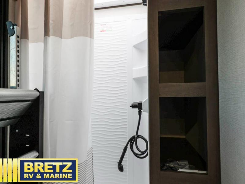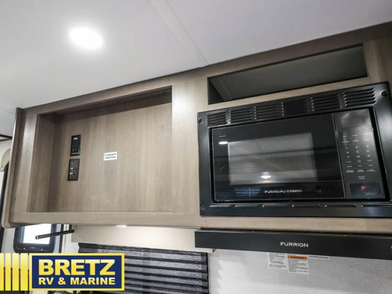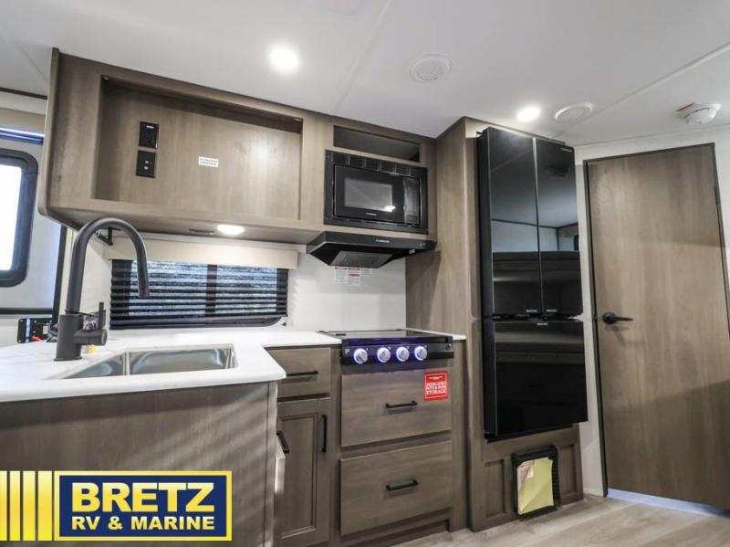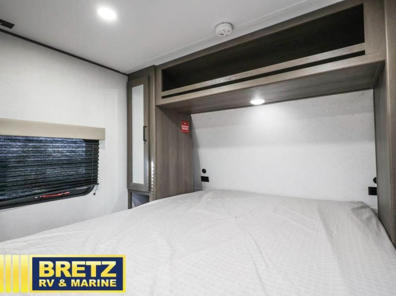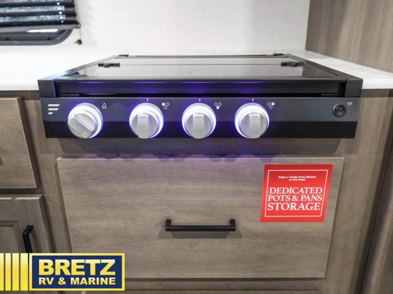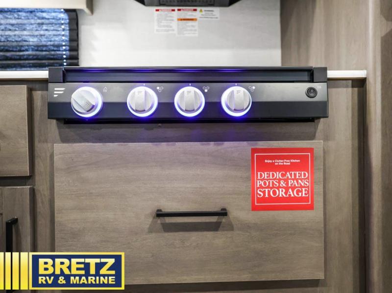 The kids will love the double-sized bunk beds with privacy curtains and under-bunk storage for all their favorite toys and belongings. And with a full bathroom featuring a linen closet, you'll have everything you need to stay clean and comfortable on the go. The kitchen/living room area is the heart of the home, equipped with a U-shaped dinette, refrigerator, microwave, pet dish, and pull-out trash. Perfect for cooking or entertaining friends and family, or simply relaxing and enjoying the comforts of home. The front bedroom is a serene retreat, featuring a 60” x 80” queen bed, TV prep, dual wardrobe, and overhead cabinets for all your favorite belongings—the perfect place to relax and recharge after a long day of adventure. But the adventure doesn't stop there! Outside, you'll find an exterior griddle, perfect for cooking up a storm in the great outdoors, and with two entry/exit doors and pass-through storage, you'll have easy access to the trailer and all your gear.