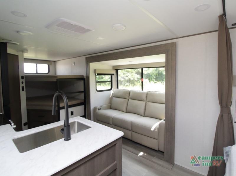 The 23BHX greets you with an open, inviting living area featuring a well-arranged kitchen and a spacious booth dinette perfect for meals, games, and everyday use. The full kitchen includes upgraded appliances, a deep stainless-steel sink, plenty of countertop space, and abundant storage for cookware and camping essentials. Whether you're cooking a quick breakfast or preparing a full dinner after a big day outdoors, the layout keeps everything within easy reach.