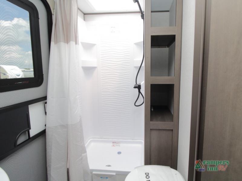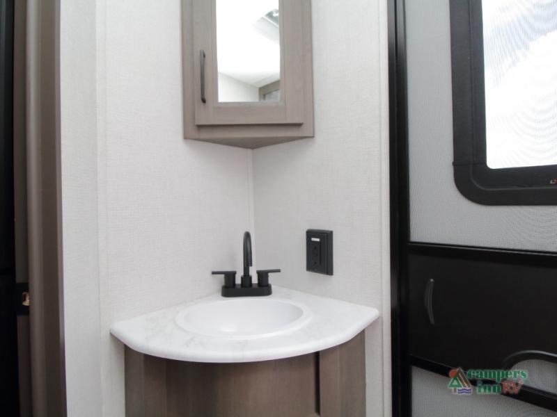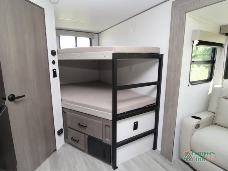 The rear corner bathroom features a spacious shower, practical layout, and easy access from the living and bunk areas. Lightweight and designed for half-ton towability, the 23BHX makes traveling easier without compromising quality.
