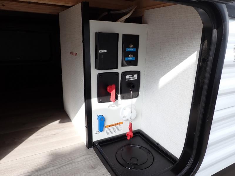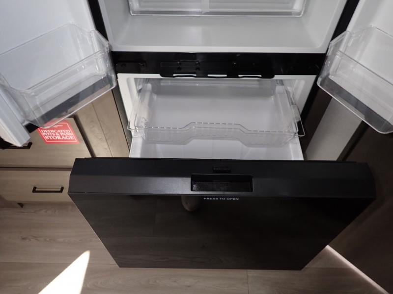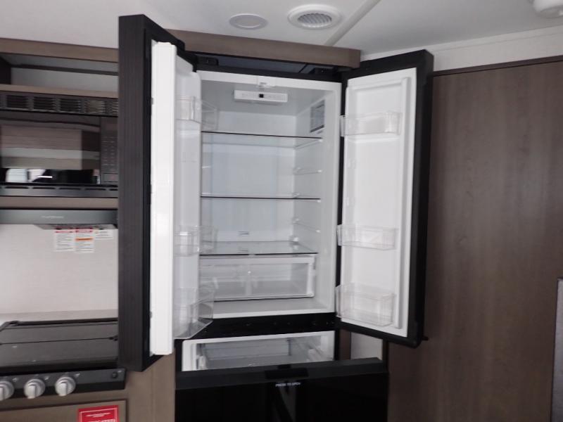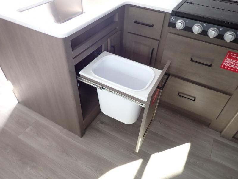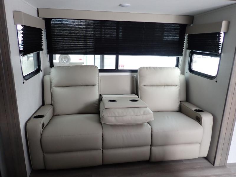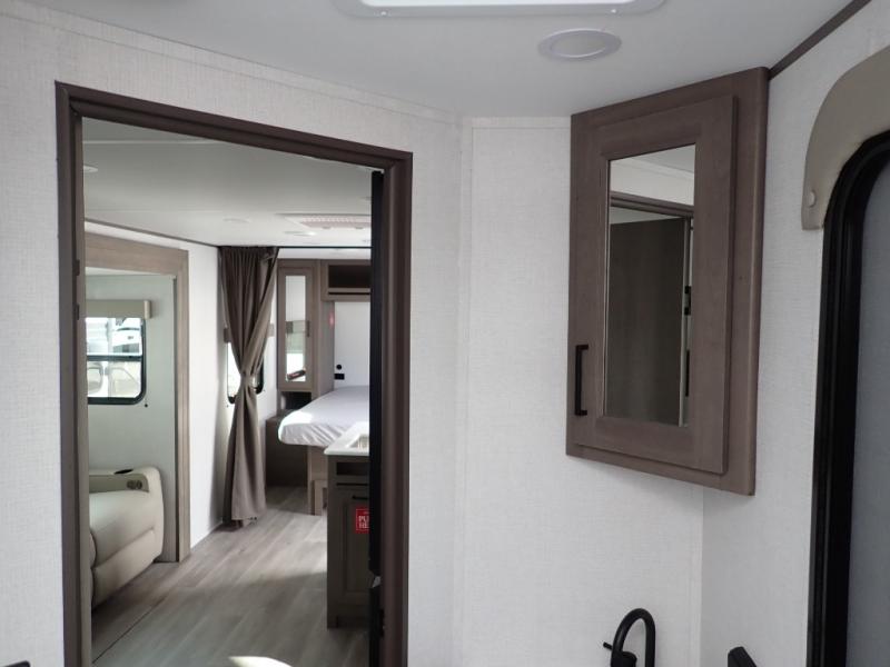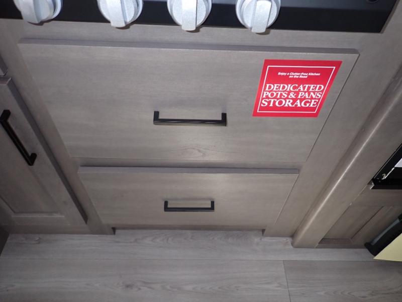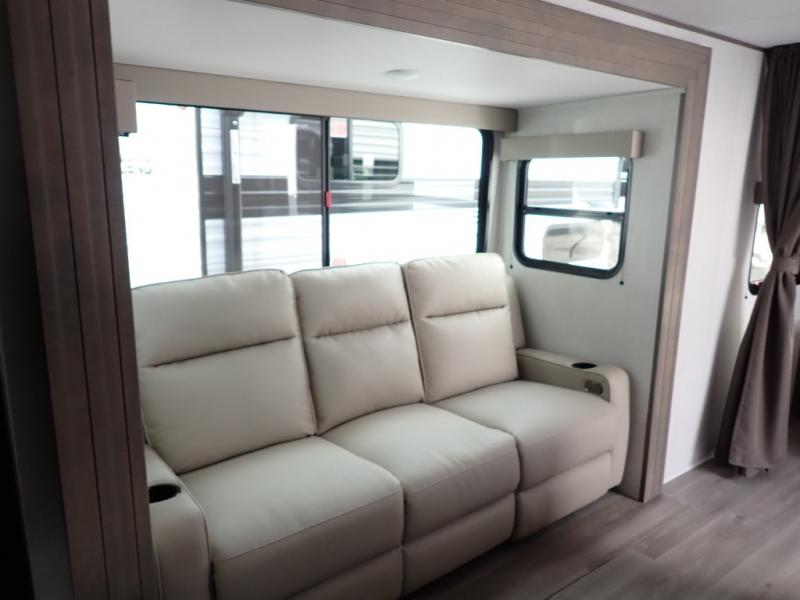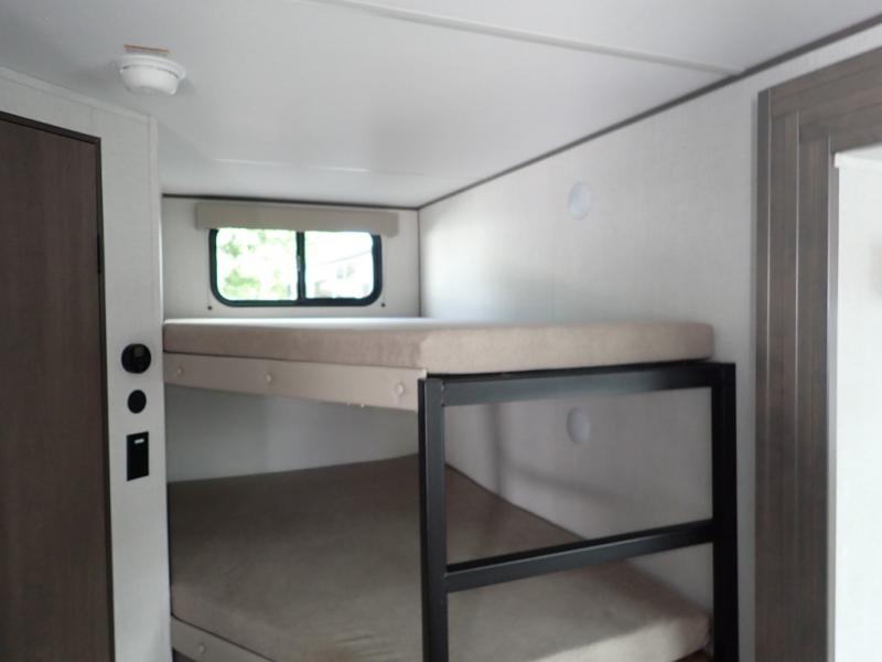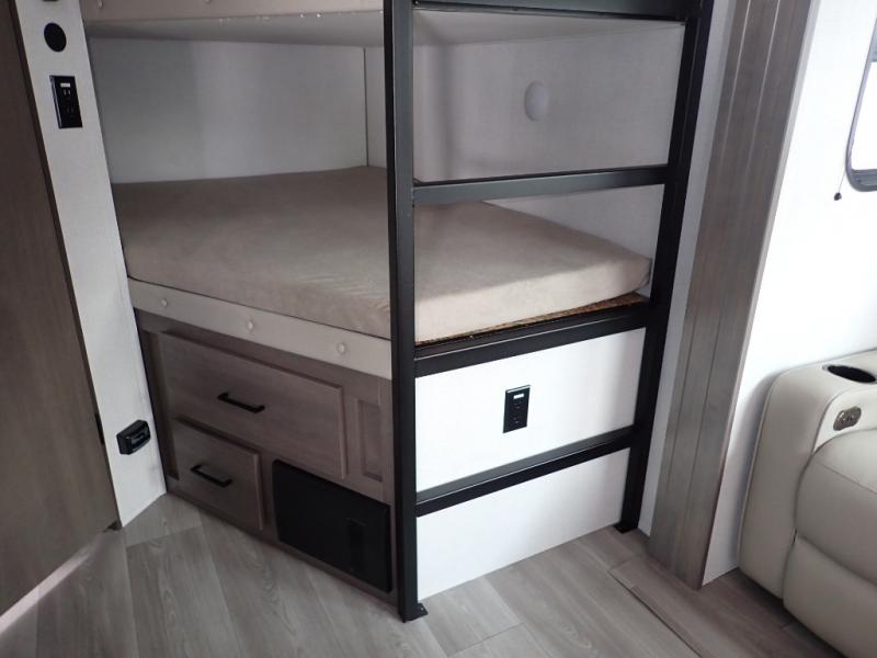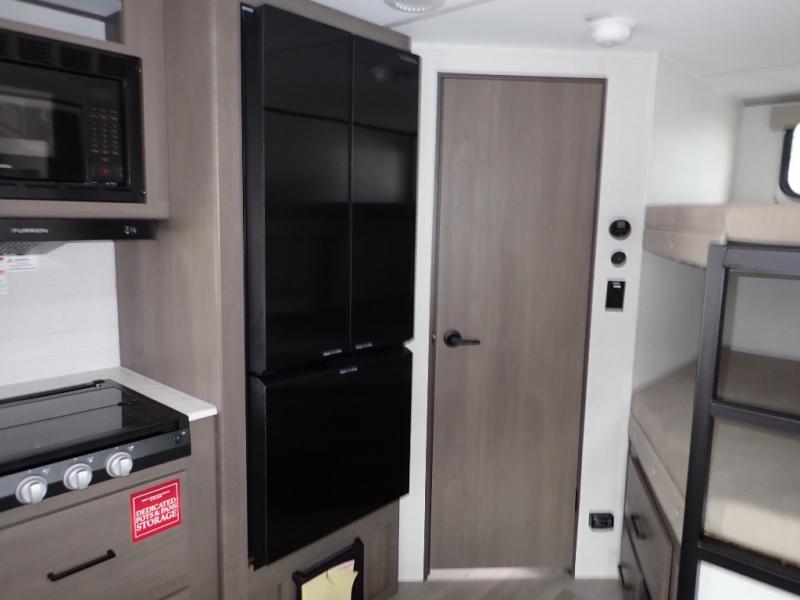 The kids will love the double-sized bunk beds with privacy curtains and under-bunk storage for all their favorite toys and belongings. And with a full bathroom featuring a linen closet, you'll have everything you need to stay clean and comfortable on the go. The kitchen/living room area is the heart of the home, equipped with a Sofa refrigerator, microwave, pet dish, and pull-out trash. Perfect for cooking or entertaining friends and family, or simply relaxing and enjoying the comforts of home. The front bedroom is a serene retreat, featuring a 60” x 80” queen bed, TV prep, dual wardrobe, and overhead cabinets for all your favorite belongings—the perfect place to relax and recharge after a long day of adventure. But the adventure doesn't stop there! Two entry/exit doors and pass-through storage, you'll have easy access to the trailer and all your gear.