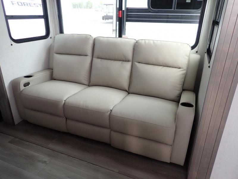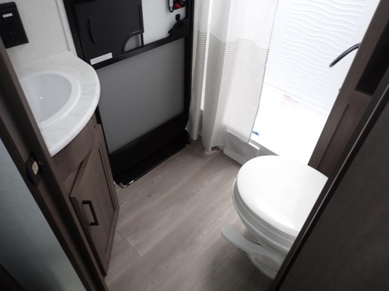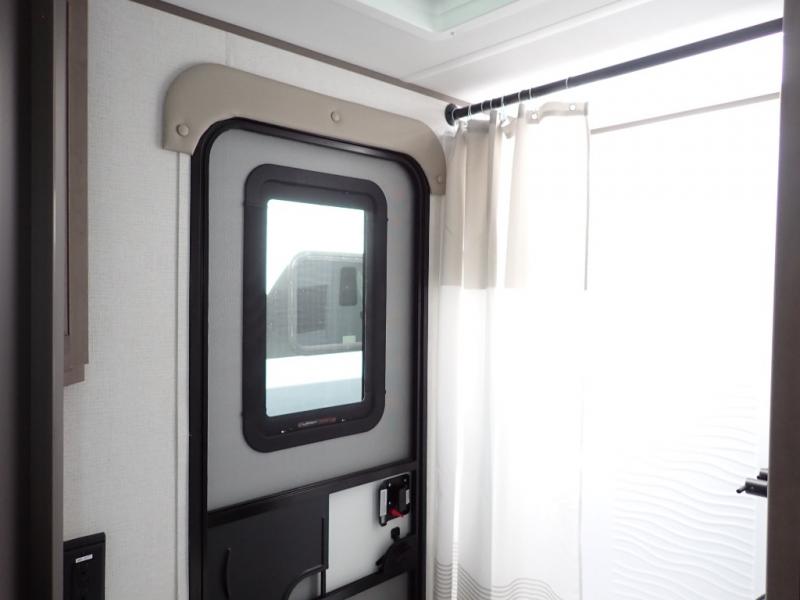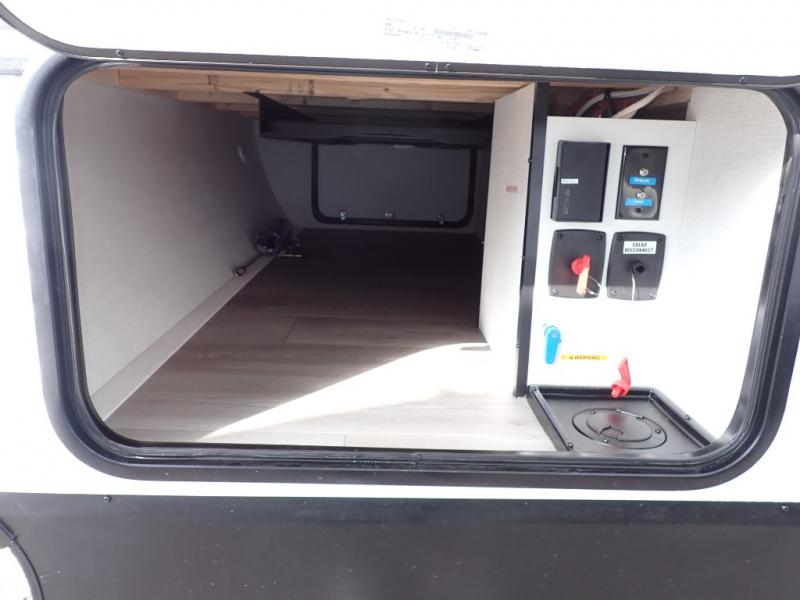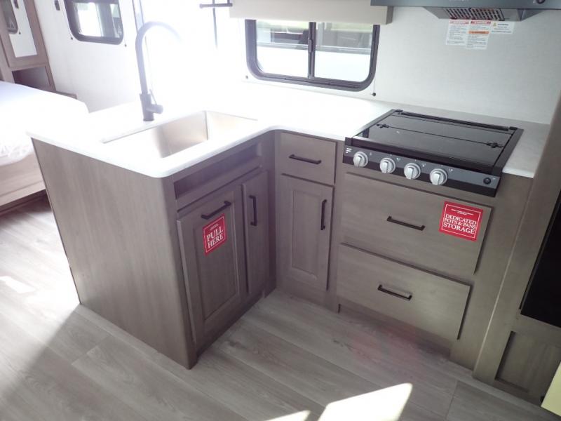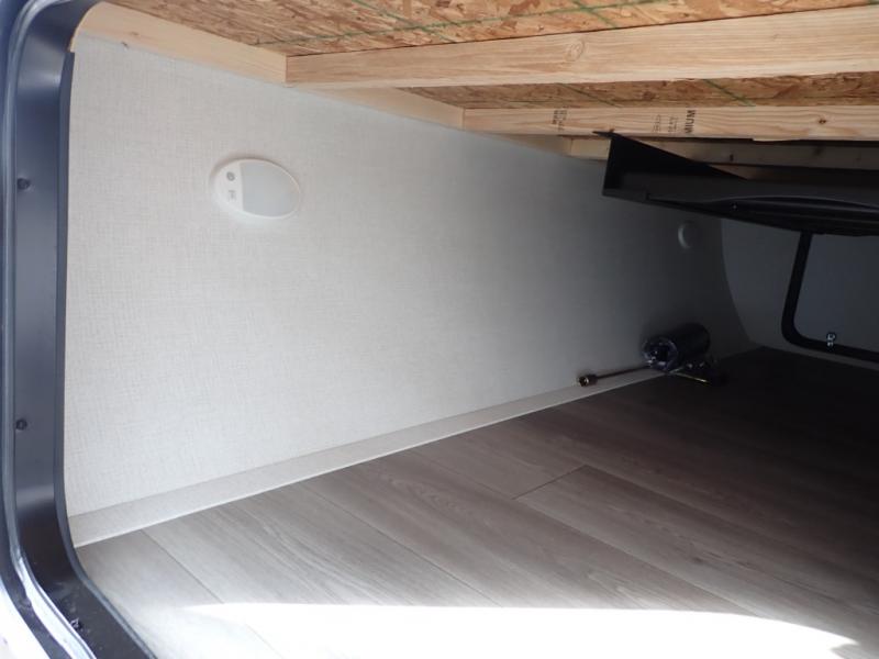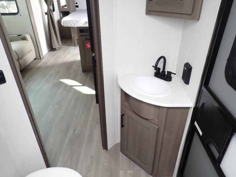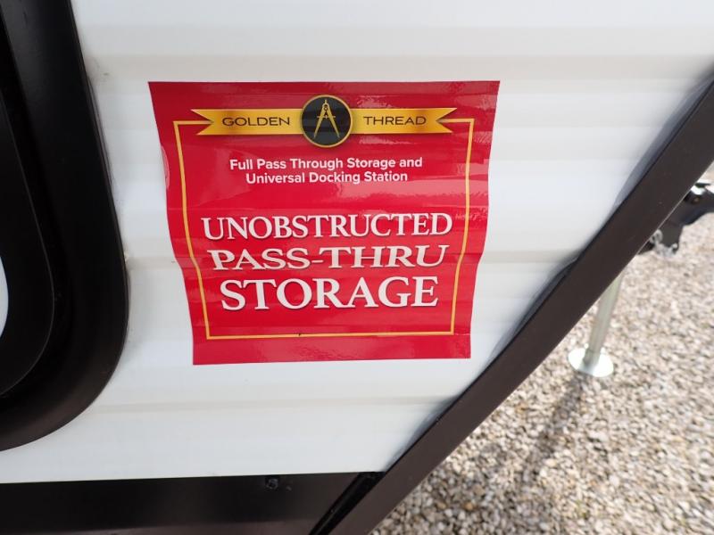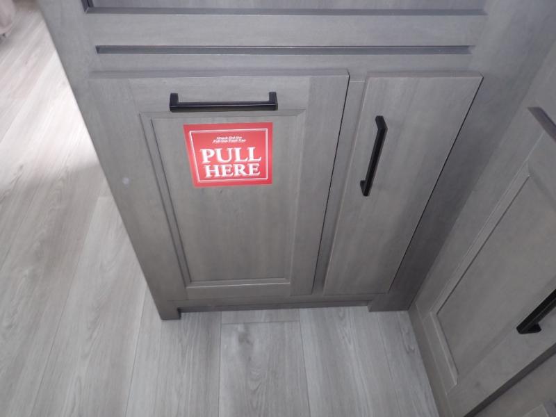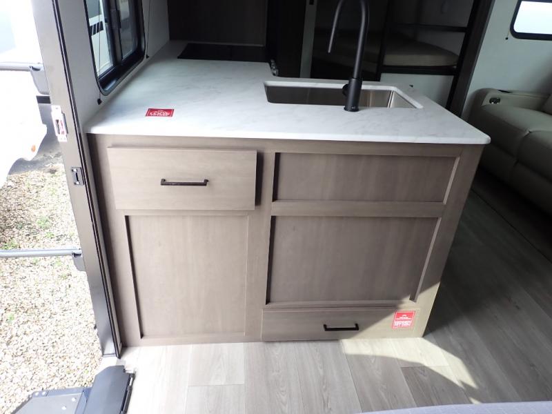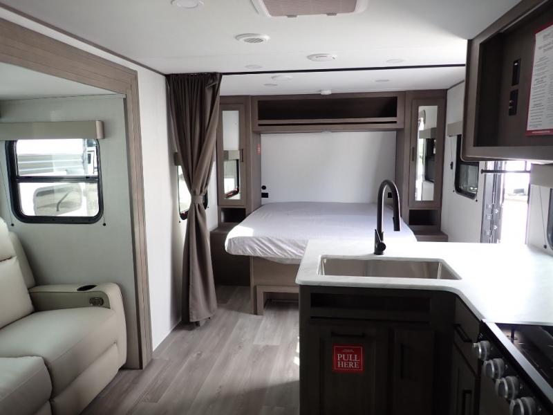The kids will love the double-sized bunk beds with privacy curtains and under-bunk storage for all their favorite toys and belongings. And with a full bathroom featuring a linen closet, you'll have everything you need to stay clean and comfortable on the go. The kitchen/living room area is the heart of the home, equipped with a Sofa refrigerator, microwave, pet dish, and pull-out trash. Perfect for cooking or entertaining friends and family, or simply relaxing and enjoying the comforts of home. The front bedroom is a serene retreat, featuring a 60” x 80” queen bed, TV prep, dual wardrobe, and overhead cabinets for all your favorite belongings—the perfect place to relax and recharge after a long day of adventure. But the adventure doesn't stop there! Two entry/exit doors and pass-through storage, you'll have easy access to the trailer and all your gear.