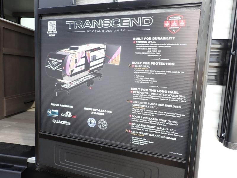 The customer-focused, quality-built Transcend Xplor travel trailers by Grand Design are your ticket to fun and adventure. You will appreciate the power tongue jack when it comes time to set up, as well as the all-in-one utility center and the detachable power cord with an LED light. These models include many outlets throughout, USB ports to charge your gadgets, and a JBL exterior speaker to listen to your favorite tunes. The interior of the Transcend Xplor will have you feeling right at home with upgraded residential furniture, residential countertops, residential cabinet doors, and the list goes on!