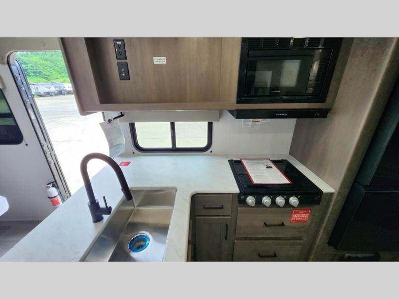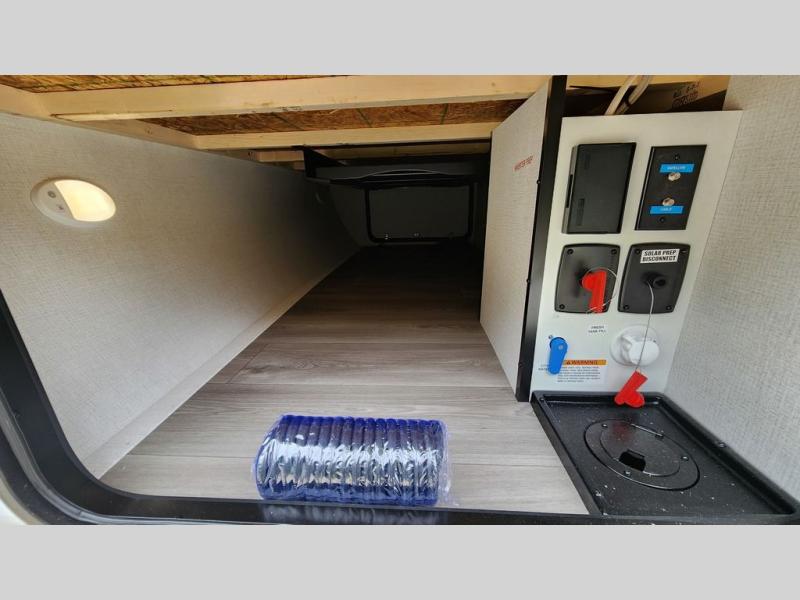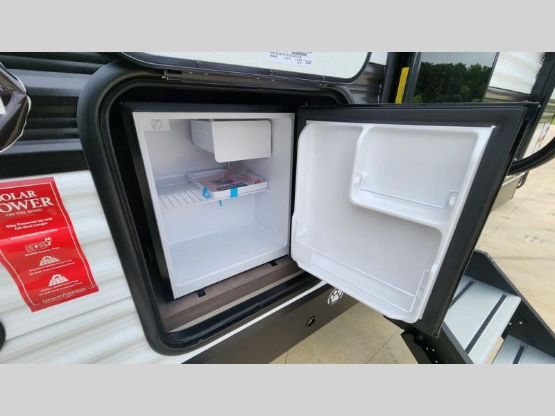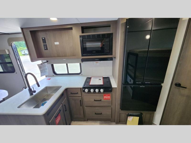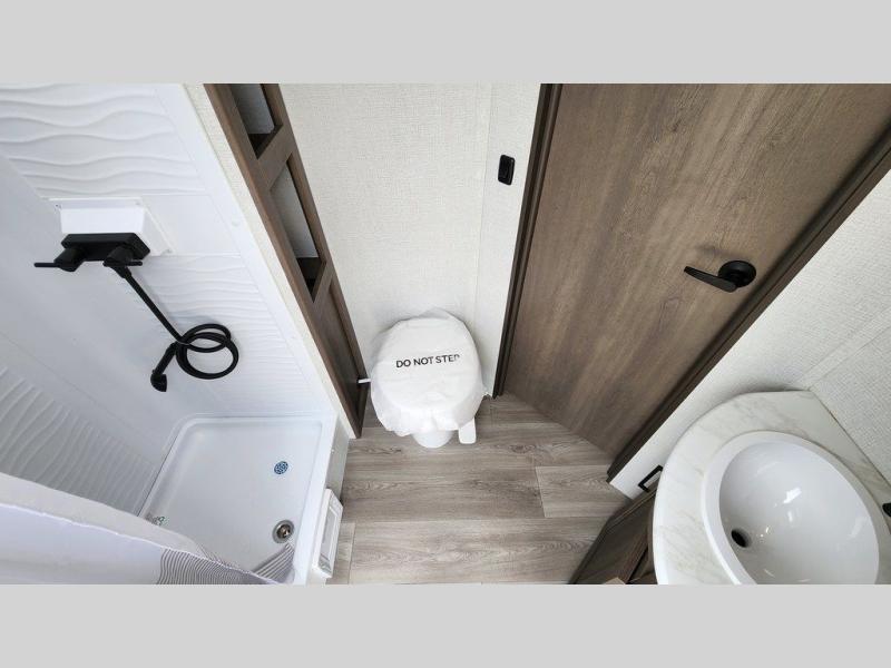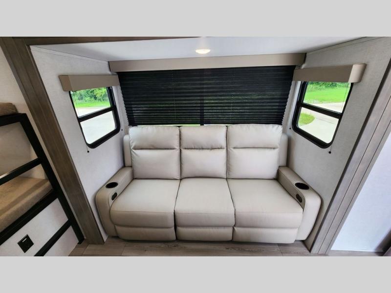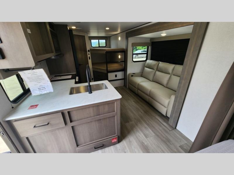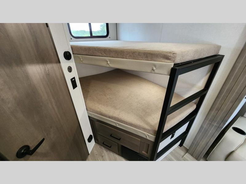 This fantastic travel trailer is designed to provide the ultimate in comfort, convenience, and adventure! The double-size bunk beds are perfect for kids, providing ample sleeping space and an under-bed storage space for all your belongings. The full bathroom features a linen closet, providing convenient storage for towels and toiletries. In the kitchen area, the U-shaped dinette is a great spot for creating memories that will last a lifetime, the refrigerator keeps your food and drinks fresh, while the microwave provides a quick and easy way to prepare meals. And for major convenience, the pull-out trash makes cleaning up a simple task. Take a nap in the comfortable front queen bed, which is a serene retreat, providing a comfortable spot to rest and relax. Jump to the exterior in a comfortable way with the double entry/exit door providing added convenience and flexibility, while the exterior awning provides shade and protection from the elements. The pass-through storage offers ample space for your outdoor gear and equipment.