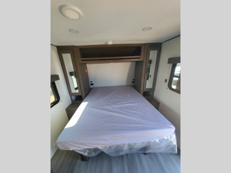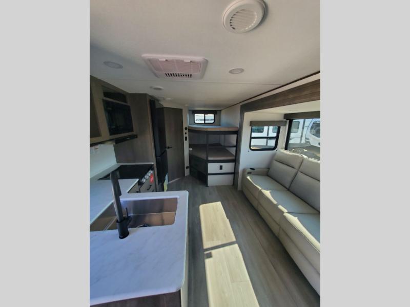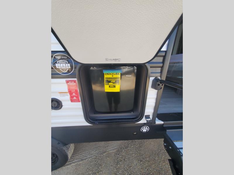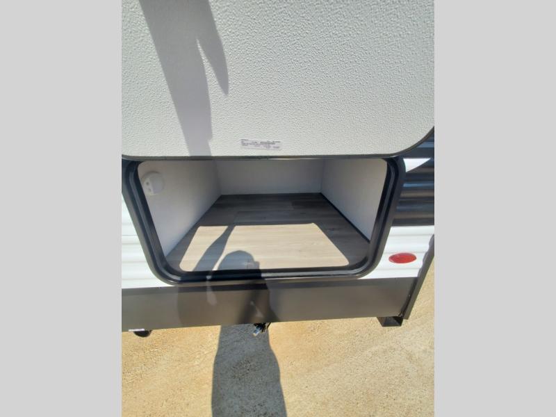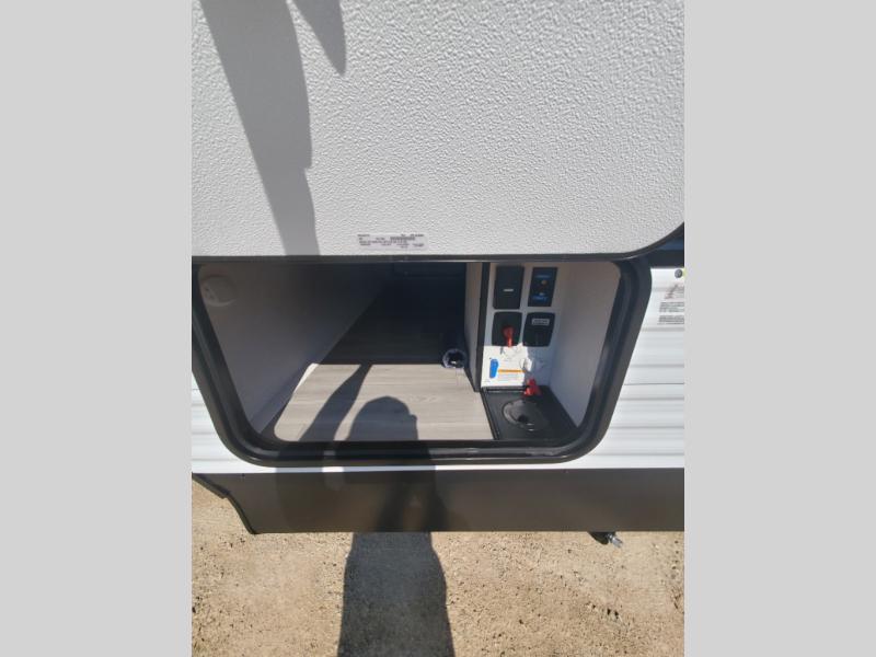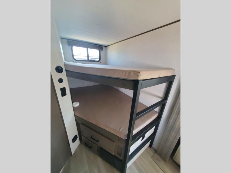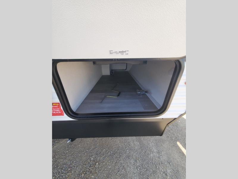 This fantastic travel trailer is designed to provide the ultimate in comfort, convenience, and adventure! The double-size bunk beds are perfect for kids, providing ample sleeping space and an under-bed storage space for all your belongings. The full bathroom features a linen closet, providing convenient storage for towels and toiletries. In the kitchen area, the U-shaped dinette is a great spot for creating memories that will last a lifetime, the refrigerator keeps your food and drinks fresh, while the microwave provides a quick and easy way to prepare meals. And for major convenience, the pull-out trash makes cleaning up a simple task. Take a nap in the comfortable front queen bed, which is a serene retreat, providing a comfortable spot to rest and relax. Jump to the exterior in a comfortable way with the double entry/exit door providing added convenience and flexibility, while the exterior awning provides shade and protection from the elements. The pass-through storage offers ample space for your outdoor gear and equipment.