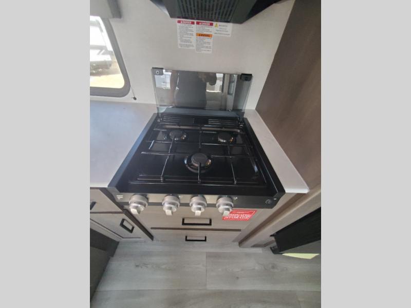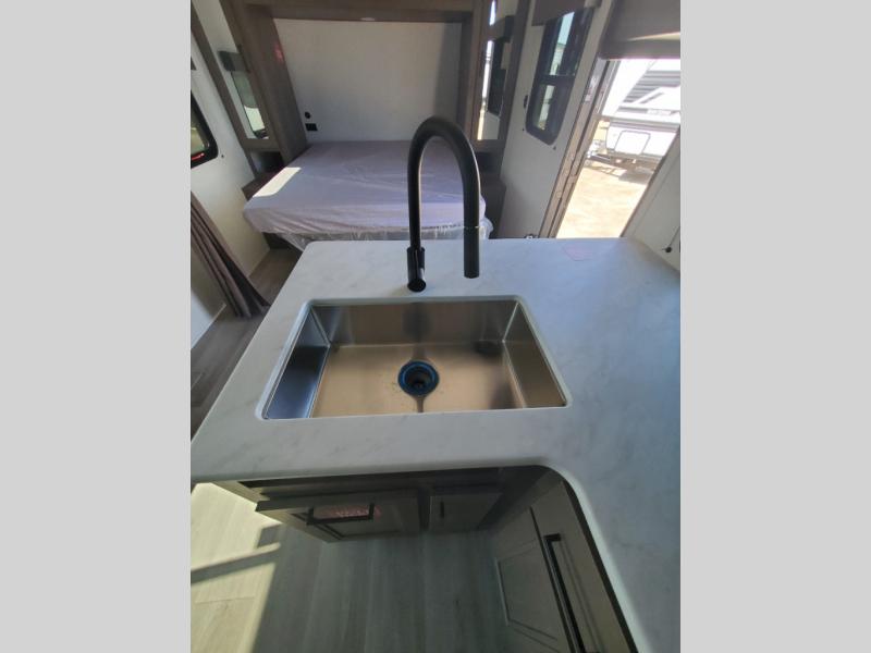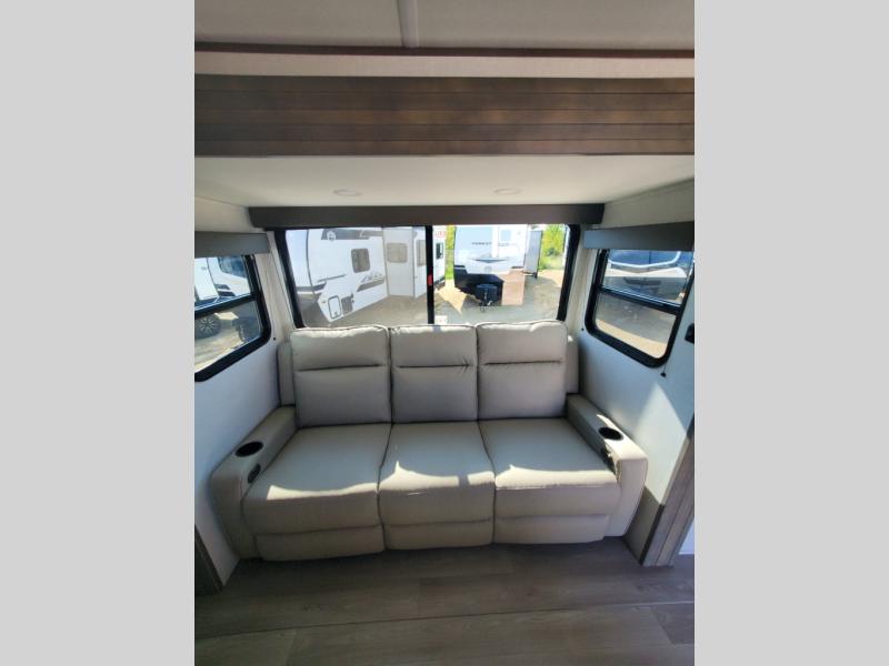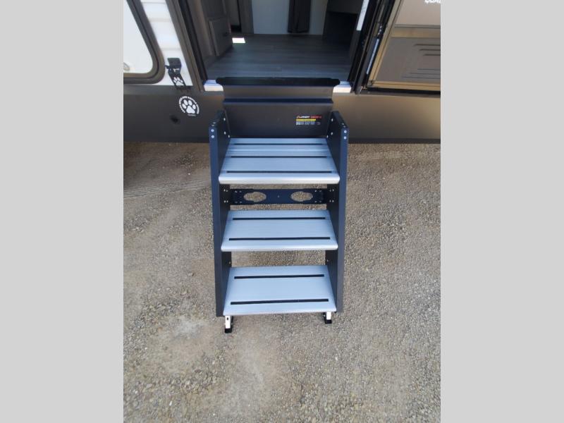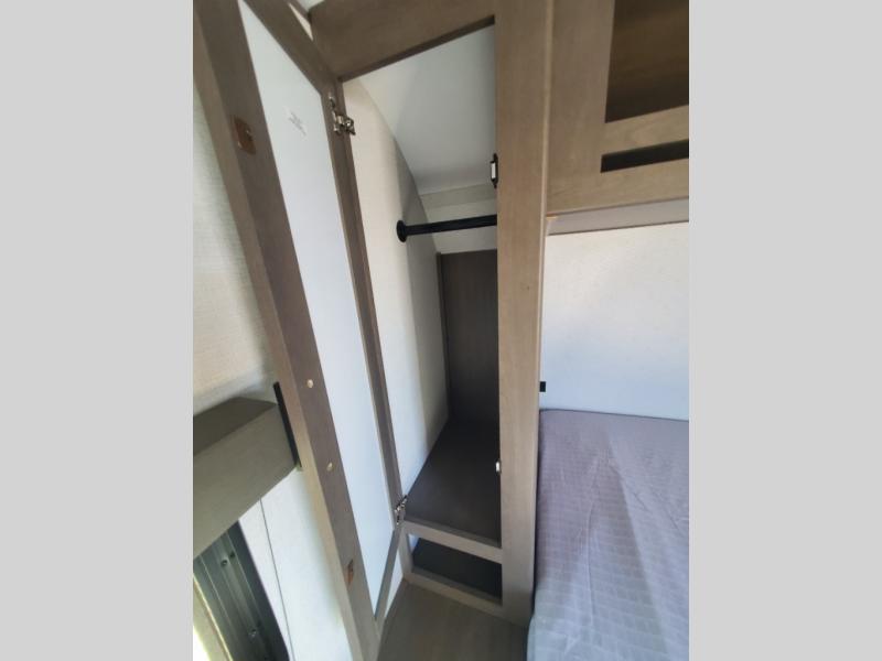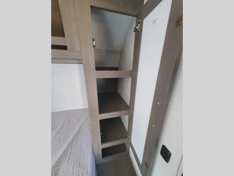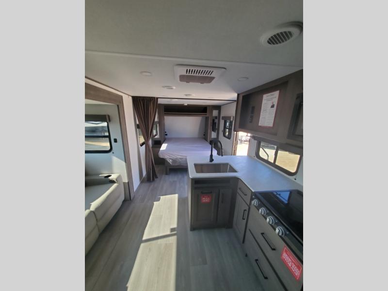 This fantastic travel trailer is designed to provide the ultimate in comfort, convenience, and adventure! The double-size bunk beds are perfect for kids, providing ample sleeping space and an under-bed storage space for all your belongings. The full bathroom features a linen closet, providing convenient storage for towels and toiletries. In the kitchen area, the U-shaped dinette is a great spot for creating memories that will last a lifetime, the refrigerator keeps your food and drinks fresh, while the microwave provides a quick and easy way to prepare meals. And for major convenience, the pull-out trash makes cleaning up a simple task. Take a nap in the comfortable front queen bed, which is a serene retreat, providing a comfortable spot to rest and relax. Jump to the exterior in a comfortable way with the double entry/exit door providing added convenience and flexibility, while the exterior awning provides shade and protection from the elements. The pass-through storage offers ample space for your outdoor gear and equipment.