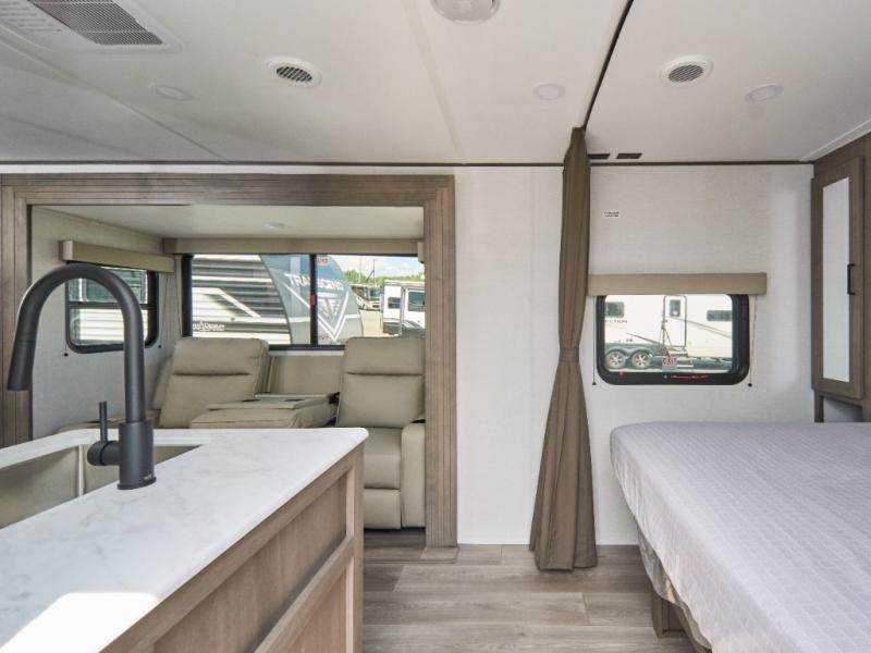 Inside, enjoy residential-style furniture, durable countertops, and cabinet doors that bring the comfort of home on the road.