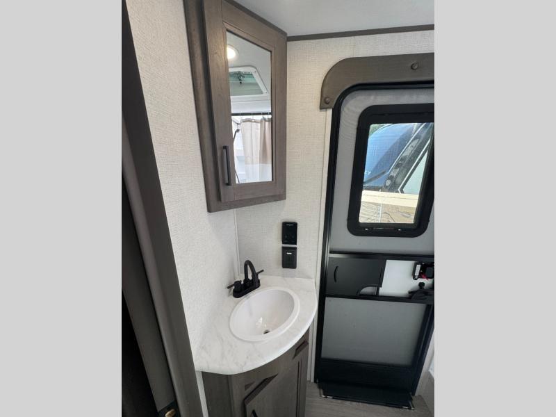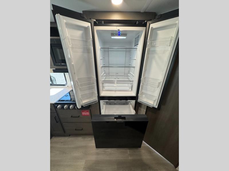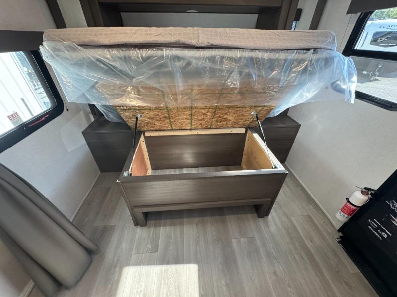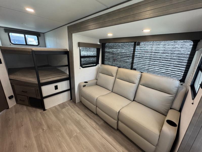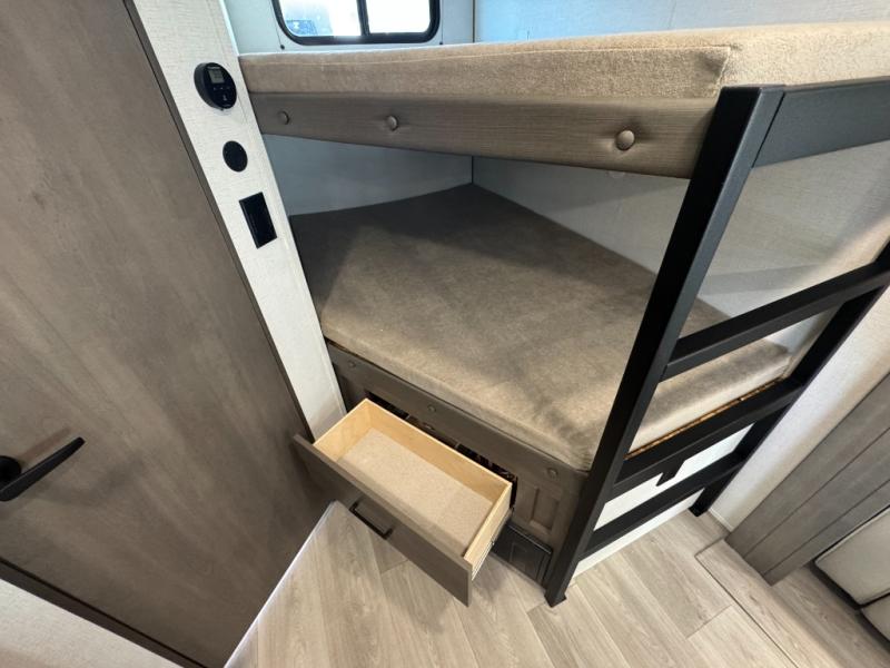 This fantastic travel trailer is designed to provide the ultimate in comfort, convenience, and adventure! The double-size bunk beds are perfect for kids, providing ample sleeping space and an under-bed storage space for all your belongings. The full bathroom features a linen closet, providing convenient storage for towels and toiletries. In the kitchen area, the U-shaped dinette is a great spot for creating memories that will last a lifetime, the refrigerator keeps your food and drinks fresh, while the microwave provides a quick and easy way to prepare meals. And for major convenience, the pull-out trash makes cleaning up a simple task. Take a nap in the comfortable front queen bed, which is a serene retreat, providing a comfortable spot to rest and relax. Jump to the exterior in a comfortable way with the double entry/exit door providing added convenience and flexibility, while the exterior awning provides shade and protection from the elements. The pass-through storage offers ample space for your outdoor gear and equipment.