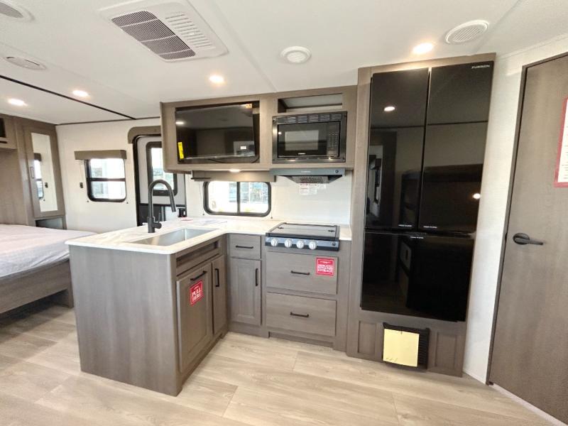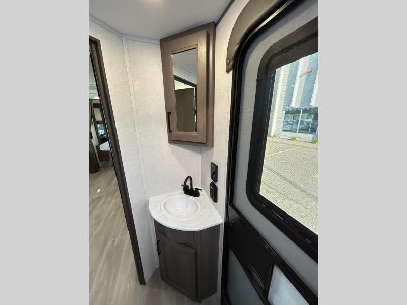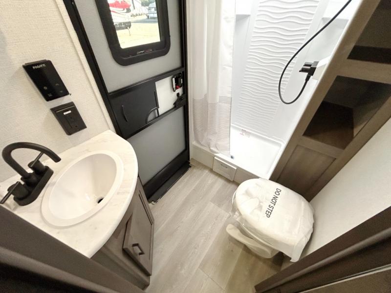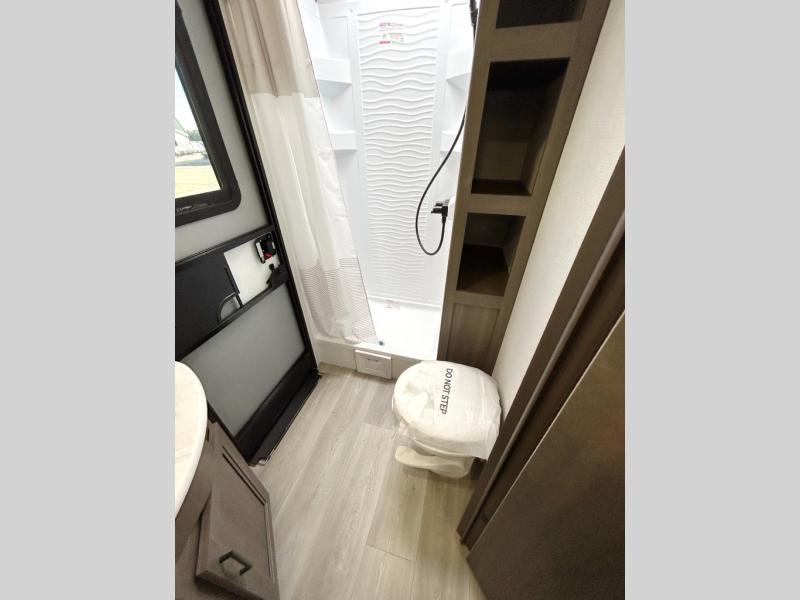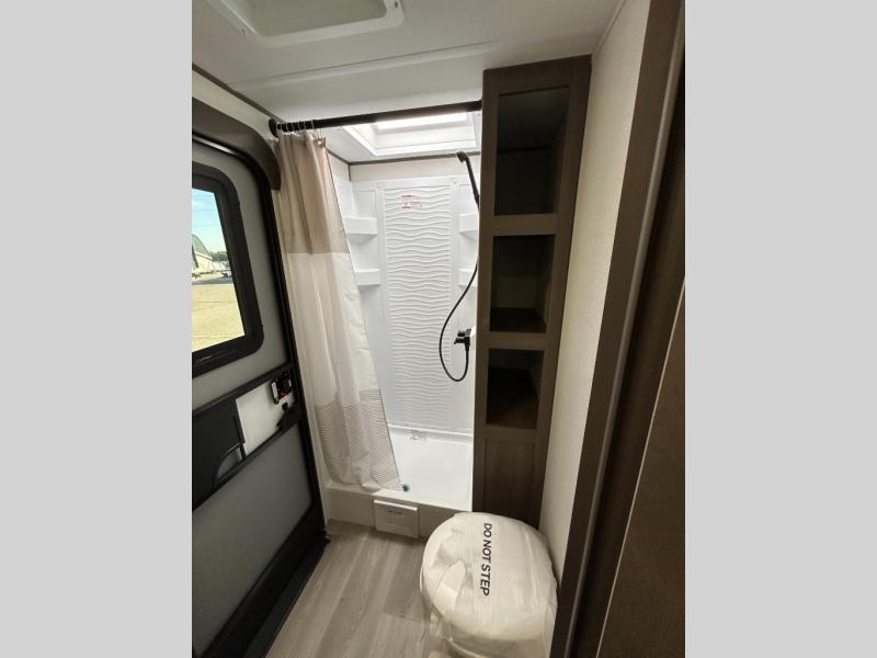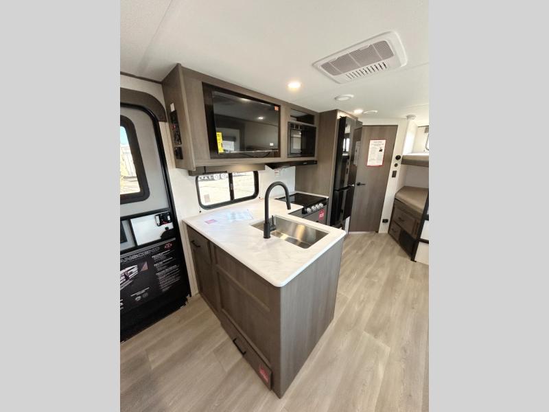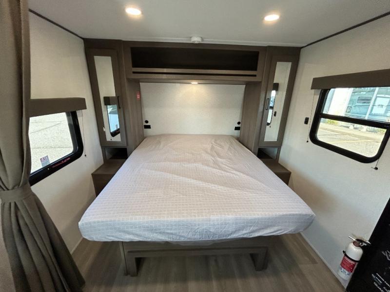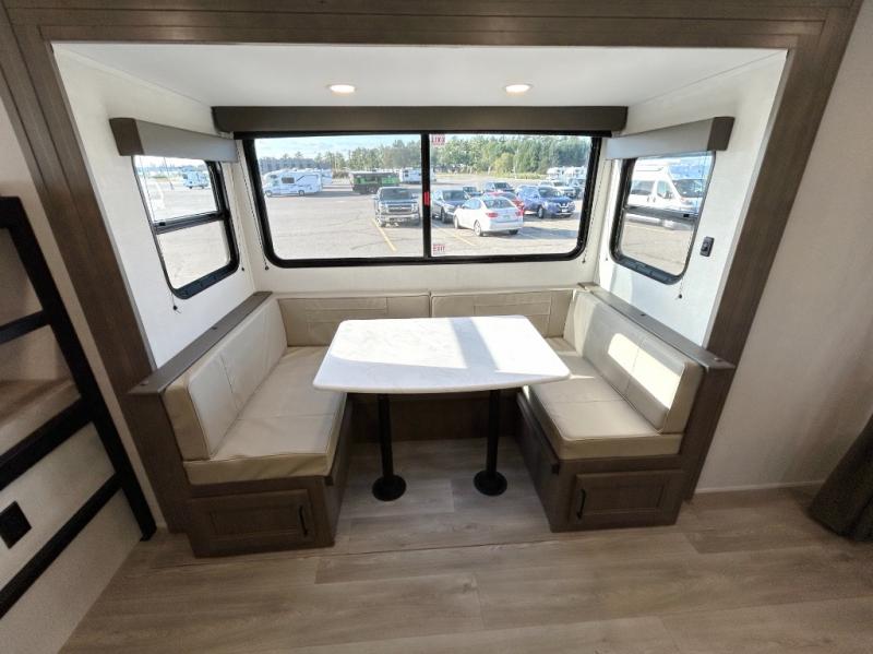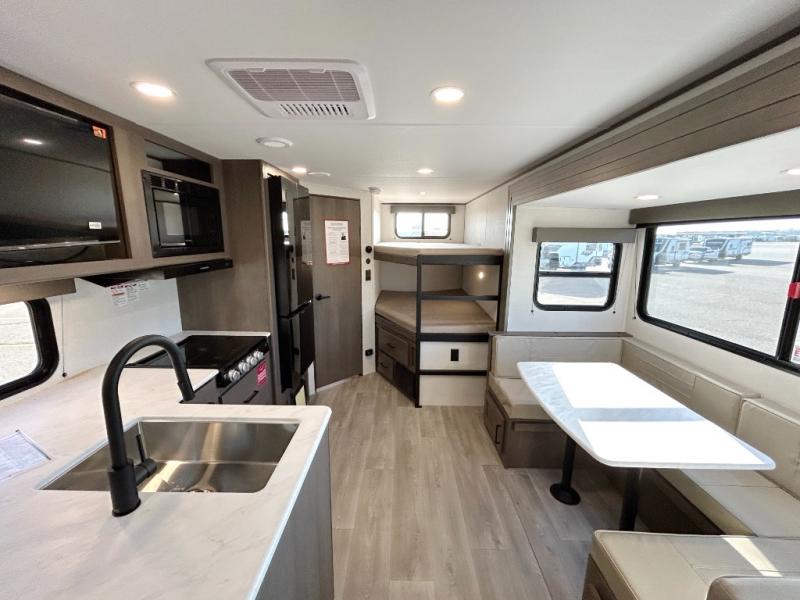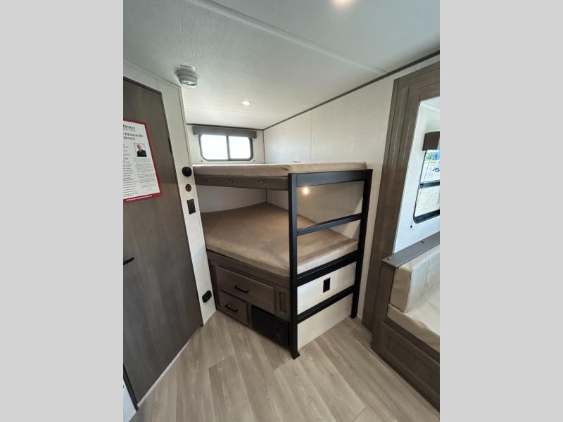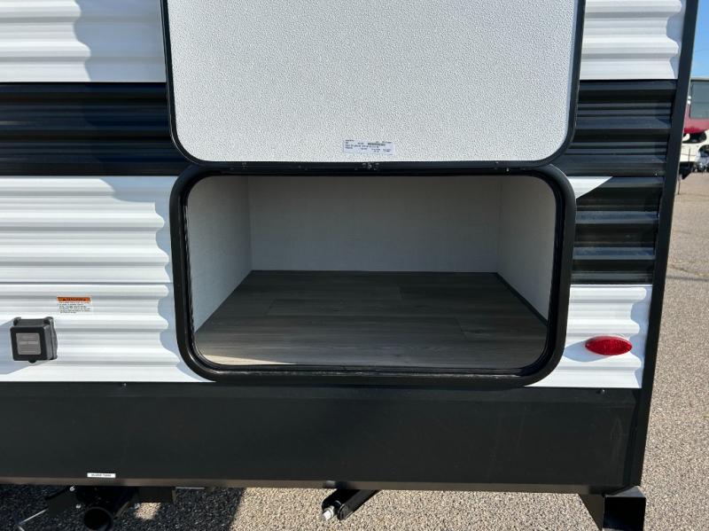 This fantastic travel trailer is designed to provide the ultimate in comfort, convenience, and adventure! The double-size bunk beds are perfect for kids, providing ample sleeping space and an under-bed storage space for all your belongings. The full bathroom features a linen closet, providing convenient storage for towels and toiletries. In the kitchen area, the U-shaped dinette is a great spot for creating memories that will last a lifetime, the refrigerator keeps your food and drinks fresh, while the microwave provides a quick and easy way to prepare meals. And for major convenience, the pull-out trash makes cleaning up a simple task. Take a nap in the comfortable front queen bed, which is a serene retreat, providing a comfortable spot to rest and relax. Jump to the exterior in a comfortable way with the double entry/exit door providing added convenience and flexibility, while the exterior awning provides shade and protection from the elements. The pass-through storage offers ample space for your outdoor gear and equipment.