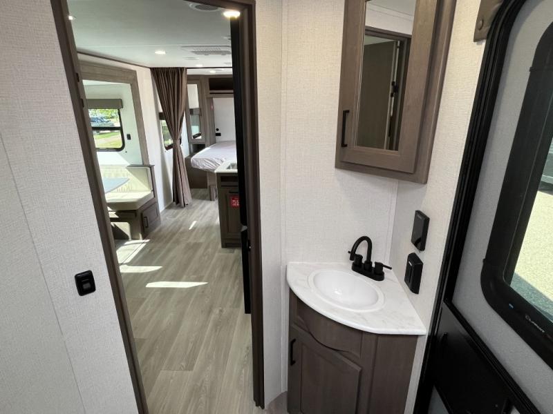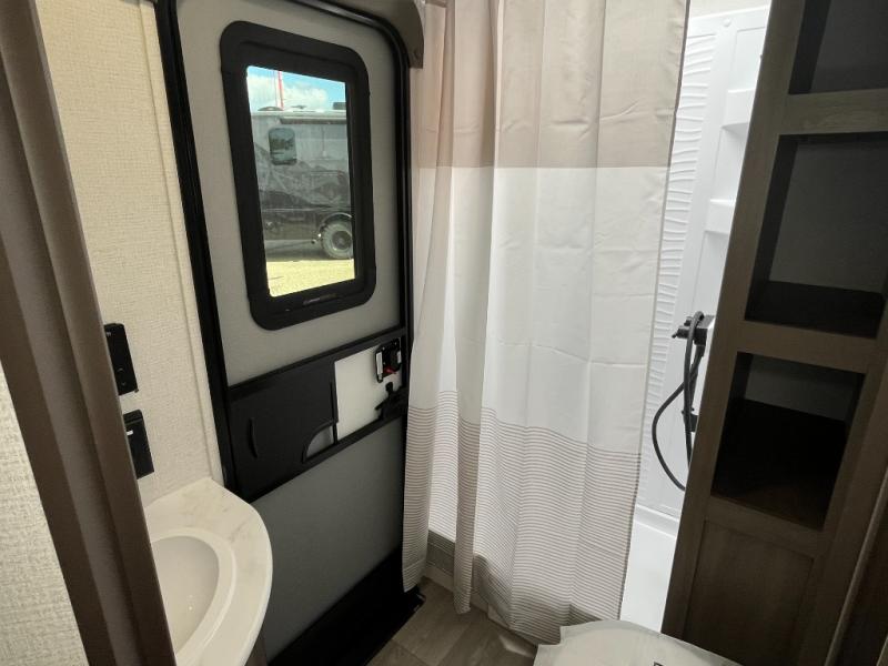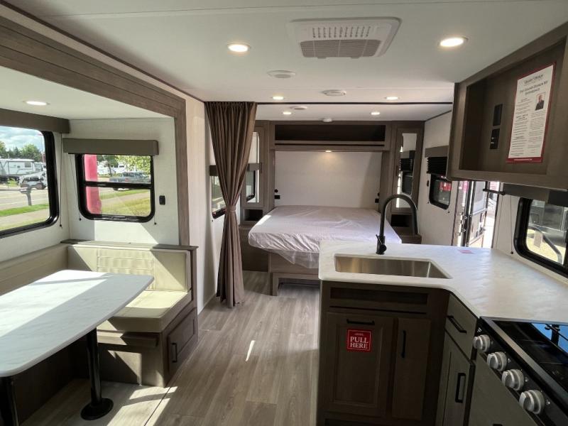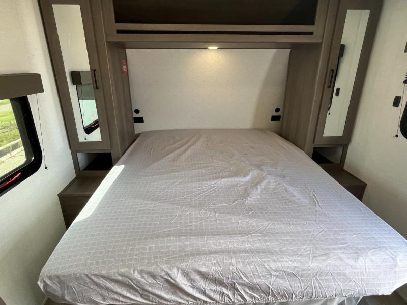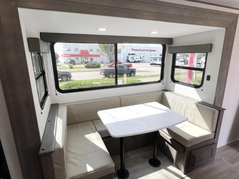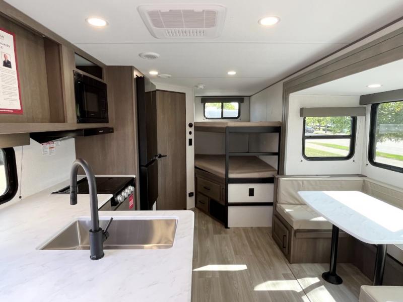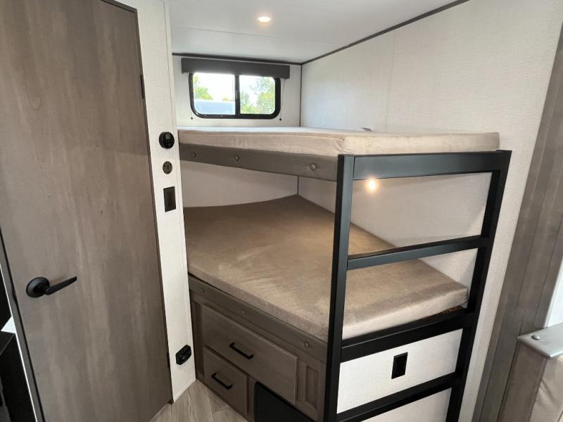 This fantastic travel trailer is designed to provide the ultimate in comfort, convenience, and adventure! The double-size bunk beds are perfect for kids, providing ample sleeping space and an under-bed storage space for all your belongings. The full bathroom features a linen closet, providing convenient storage for towels and toiletries. In the kitchen area, the U-shaped dinette is a great spot for creating memories that will last a lifetime, the refrigerator keeps your food and drinks fresh, while the microwave provides a quick and easy way to prepare meals. And for major convenience, the pull-out trash makes cleaning up a simple task. Take a nap in the comfortable front queen bed, which is a serene retreat, providing a comfortable spot to rest and relax. Jump to the exterior in a comfortable way with the double entry/exit door providing added convenience and flexibility, while the exterior awning provides shade and protection from the elements. The pass-through storage offers ample space for your outdoor gear and equipment.
