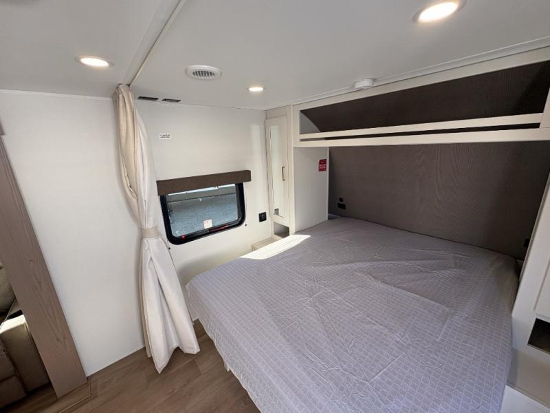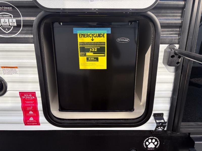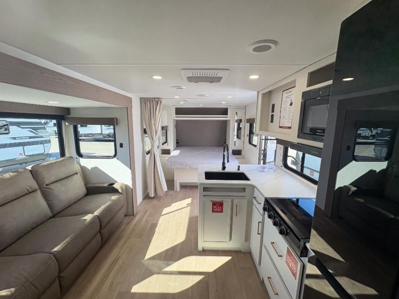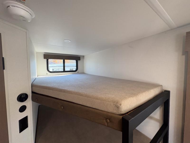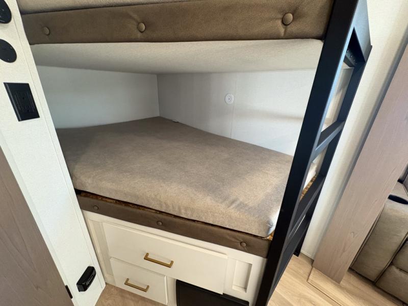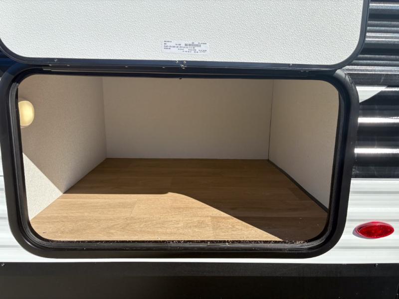 This fantastic travel trailer is designed to provide the ultimate in comfort, convenience, and adventure! The double-size bunk beds are perfect for kids, providing ample sleeping space and an under-bed storage space for all your belongings. The full bathroom features a linen closet, providing convenient storage for towels and toiletries. In the kitchen area, the U-shaped dinette is a great spot for creating memories that will last a lifetime, the refrigerator keeps your food and drinks fresh, while the microwave provides a quick and easy way to prepare meals. And for major convenience, the pull-out trash makes cleaning up a simple task. Take a nap in the comfortable front queen bed, which is a serene retreat, providing a comfortable spot to rest and relax. Jump to the exterior in a comfortable way with the double entry/exit door providing added convenience and flexibility, while the exterior awning provides shade and protection from the elements. The pass-through storage offers ample space for your outdoor gear and equipment.