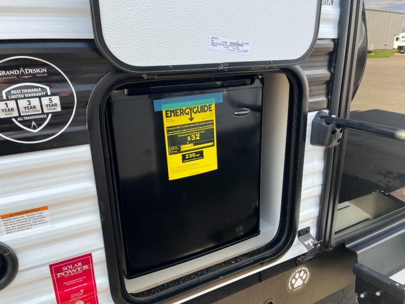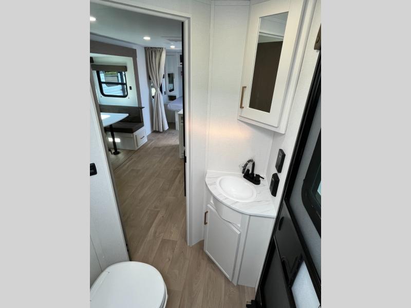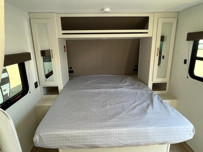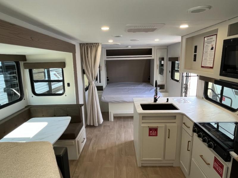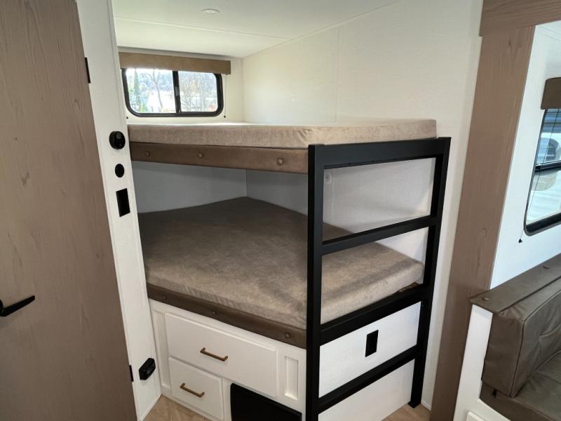 This fantastic travel trailer is designed to provide the ultimate in comfort, convenience, and adventure! The double-size bunk beds are perfect for kids, providing ample sleeping space and an under-bed storage space for all your belongings. The full bathroom features a linen closet, providing convenient storage for towels and toiletries. In the kitchen area, the U-shaped dinette is a great spot for creating memories that will last a lifetime, the refrigerator keeps your food and drinks fresh, while the microwave provides a quick and easy way to prepare meals. And for major convenience, the pull-out trash makes cleaning up a simple task. Take a nap in the comfortable front queen bed, which is a serene retreat, providing a comfortable spot to rest and relax. Jump to the exterior in a comfortable way with the double entry/exit door providing added convenience and flexibility, while the exterior awning provides shade and protection from the elements. The pass-through storage offers ample space for your outdoor gear and equipment.